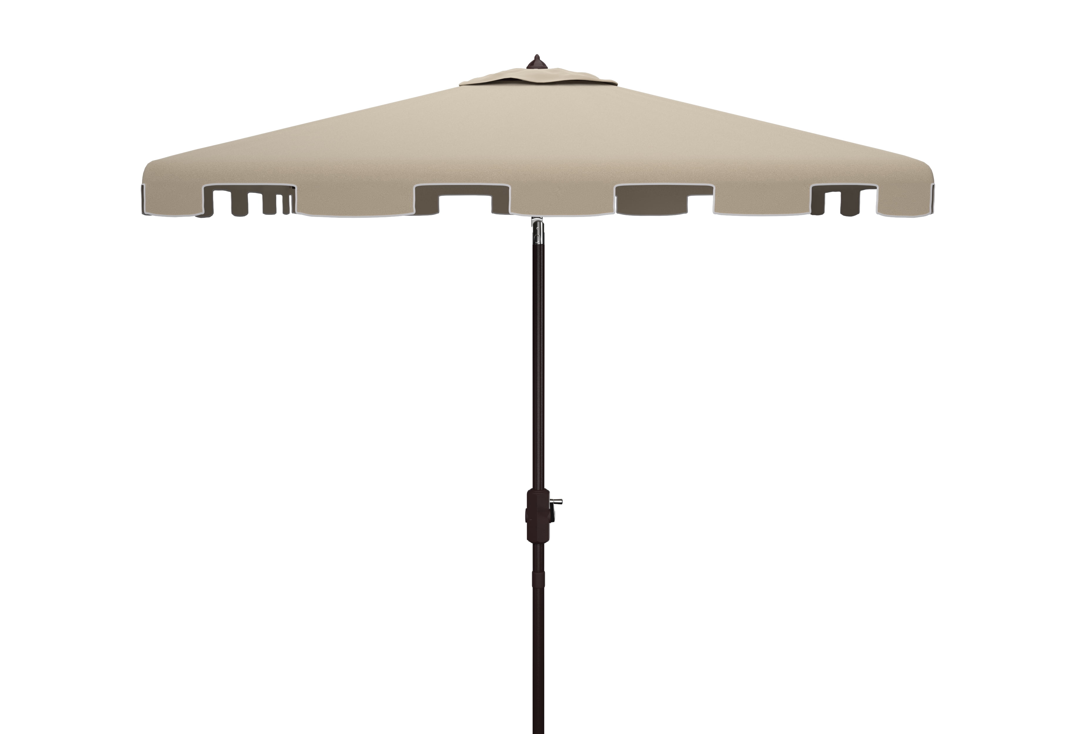 SAFAVIEH Outdoor Collection Zimmerman 7.5-Foot Square Market Umbrella Beige/White A classic market umbrella gets a chic makeover in neutral beige and white with a stylish valance for extra sun protection and European flair. Its square polyester canopy and brown aluminum post make it ideal for the veranda or pool deck. Includes easy crank and tilt mechanism. For over 100 years, SAFAVIEH has set the standard for finely crafted rugs and home furnishings. From coveted fresh and trendy designs to timeless heirloom-quality pieces, expressing your unique personal style has never been easier. Begin your rug, furniture, lighting, outdoor, and home decor search and discover over 100,000 SAFAVIEH products today.