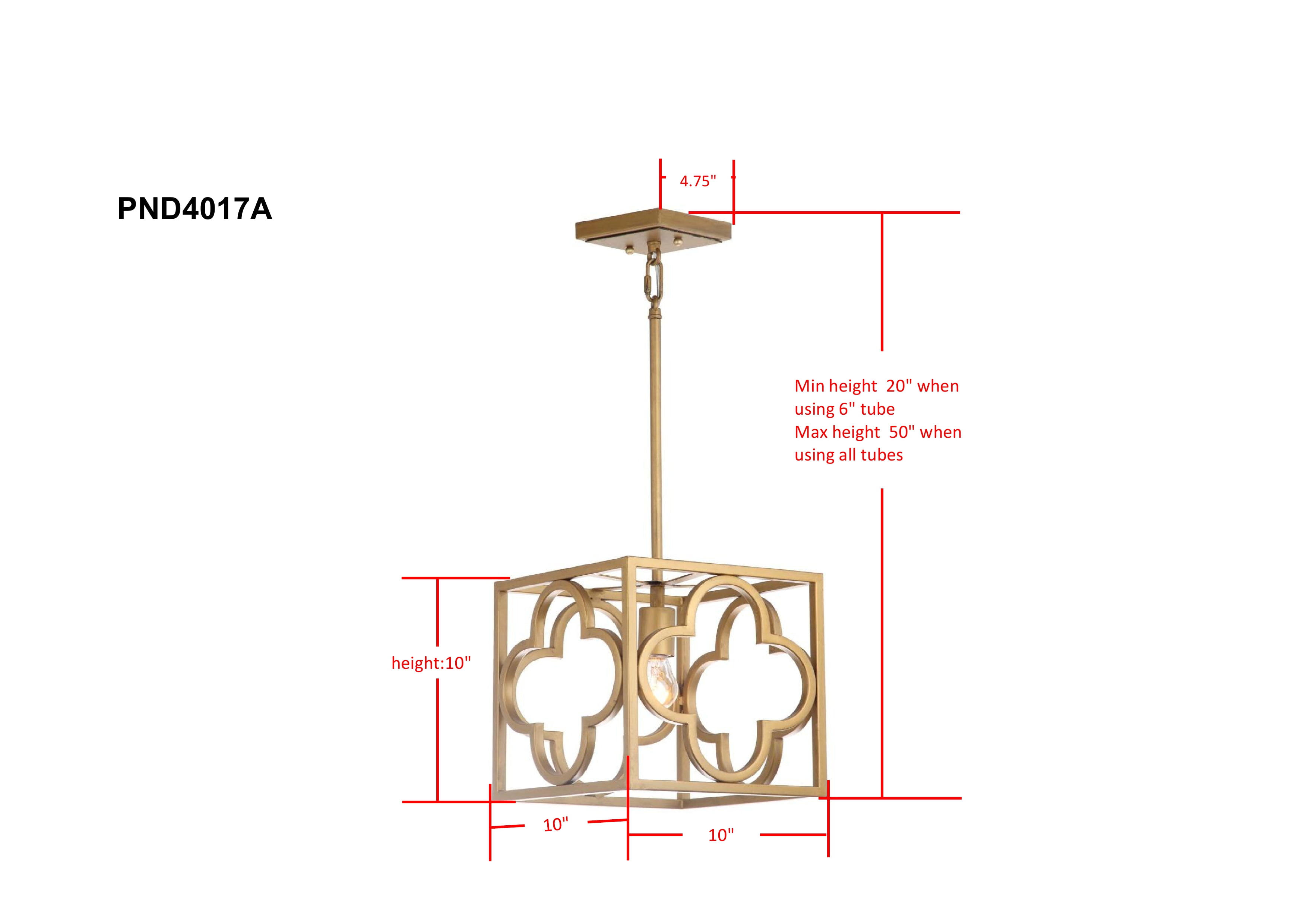 Contemporary design adds a chic look to your home Durable frame for long lasting longevity Easy to clean and maintain Minor assembly needed Color: Gold Shade Color: None Item Dimensions: 10 in. W x 10 in. D x 14-50 in. H Crafted with Iron Shade Height: 20 in. H Minimum Hanging Length: 14 in. H Maximum Hanging Length: 50 in. H Lamp Certification: UL Canopy Dimensions: 4.75 in W x 4.75 in. D x 0.75 in. H Light Bulb Base Type: E26 Type of Bulb Included: Edison Bulb 25W Max Wattage: Type “A” 60W or CFL 13W or LED 9W Lumen: 200 Quantity of Bulbs: 1 Accessories in life style photo(s) not included Please note: The images and product dimensions on our website are as accurate as possible. Due to differences in computer monitors, some item’s color may vary slightly. Before cleaning any lamp shade or fixture, disconnect the power source. Wipe with a soft, dry cloth. Avoid the use of chemicals and household cleaners as they may damage the finish.