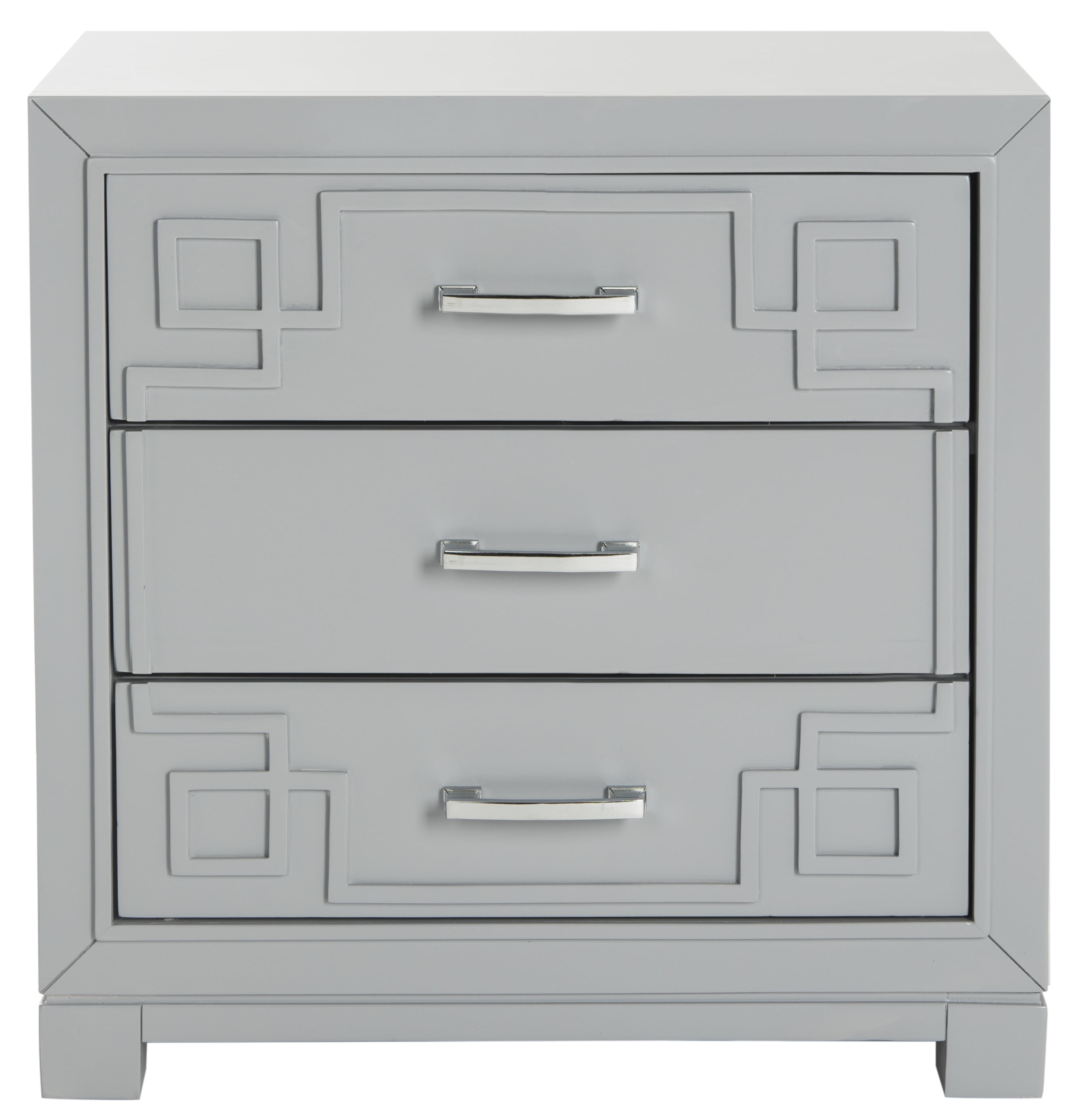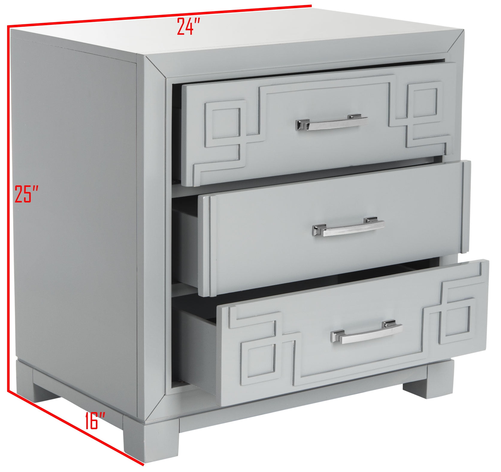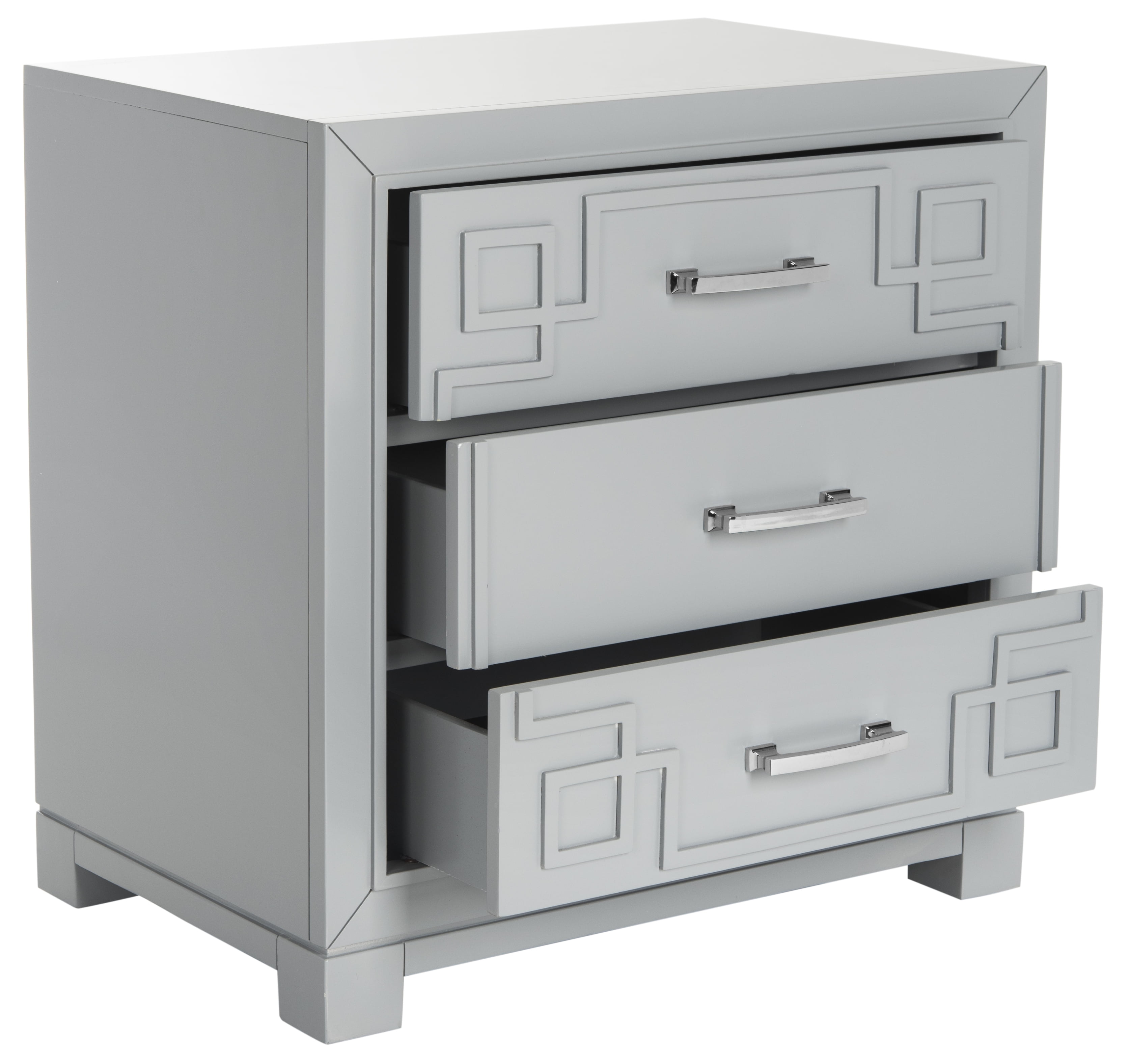 SAFAVIEH Raina Three Drawer Greek Key Night Stand Grey A fabulous display of modern sophistication, this Raina Three Drawer Nightstand exudes chic couture style. Raina’s classic Greek key pattern is paired with a sleek grey hue and polished chrome hardware for matchless fashion flair. For over 100 years, SAFAVIEH has set the standard for finely crafted rugs and home furnishings. From coveted fresh and trendy designs to timeless heirloom-quality pieces, expressing your unique personal style has never been easier. Begin your rug, furniture, lighting, outdoor, and home decor search and discover over 100,000 SAFAVIEH products today.