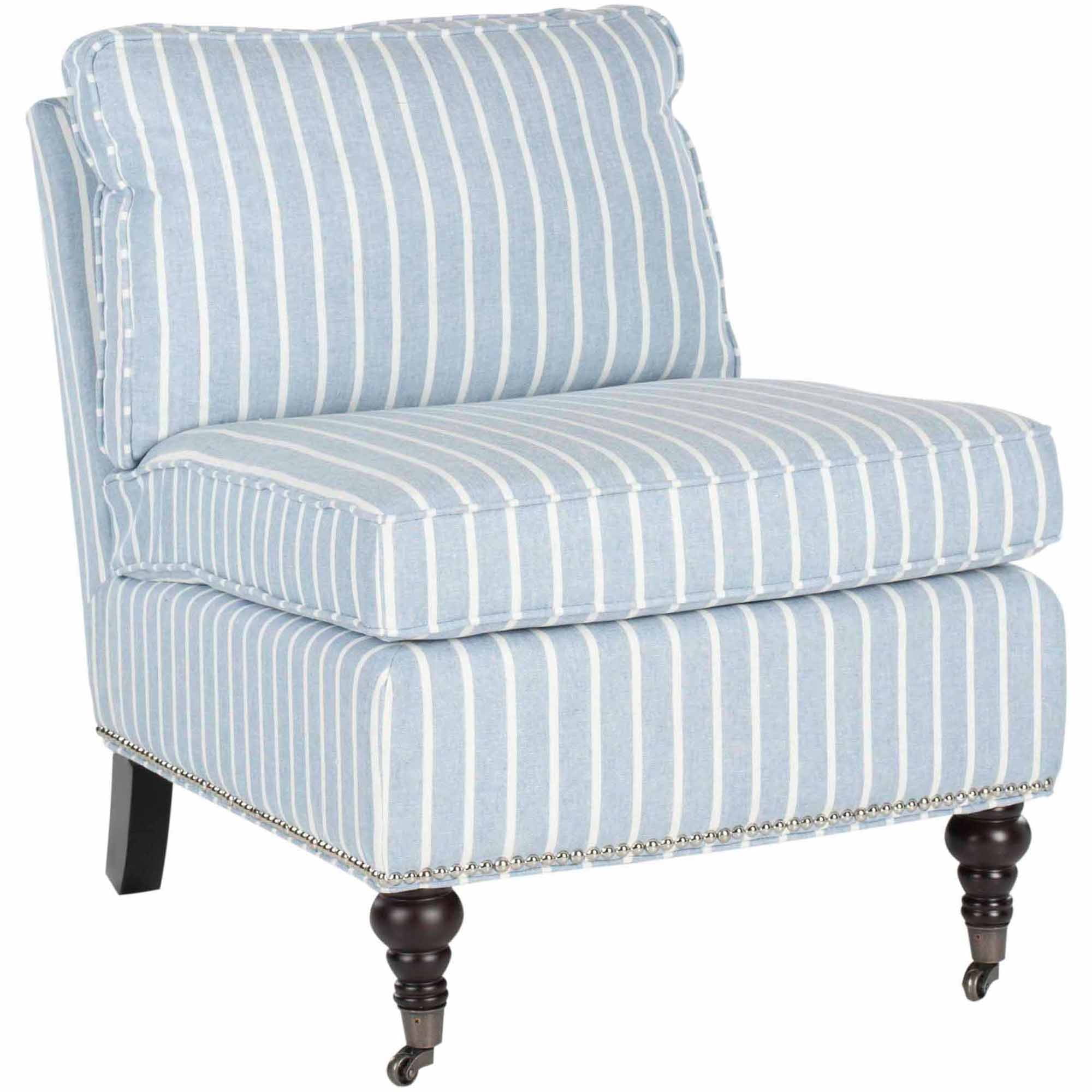 Shop SAFAVIEH at . Save Money. Live Better. SAFAVIEH Randy Transitional Upholstered Slipper Chair w/ Casters, Blue/White Low slung with clean lines, the easy going Randy Slipper Chair is effortlessly versatile in a blue and white striped linen blend, perfectly providing comfortable lounging. Spindle birch wood legs in an espresso finish and chic nailhead trim dramatically highlight Randy’s laidback silhouette. For over 100 years, SAFAVIEH has set the standard for finely crafted rugs and home furnishings. Begin your rug, furniture, lighting, outdoor, and home decor search and discover over 100,000 SAFAVIEH products today.