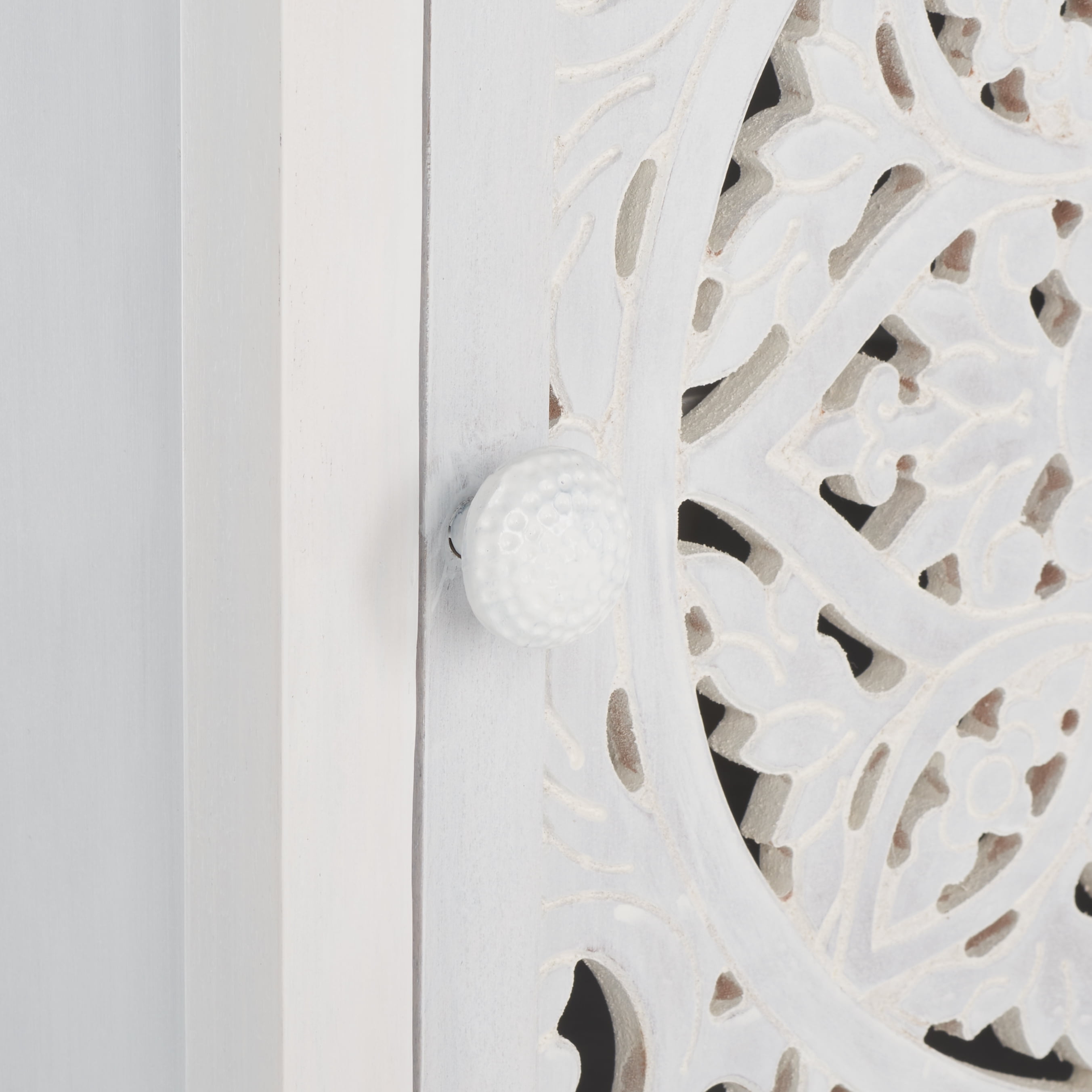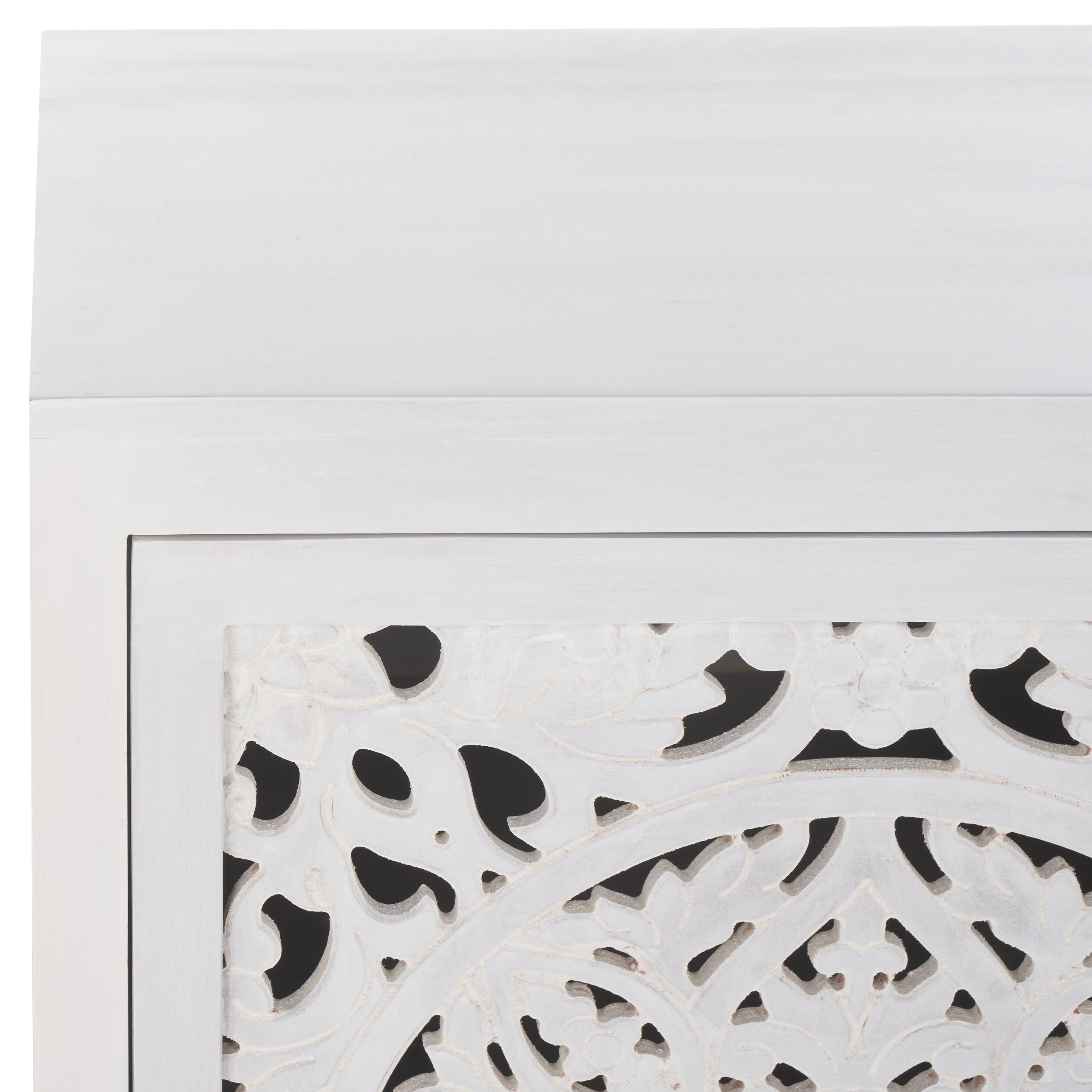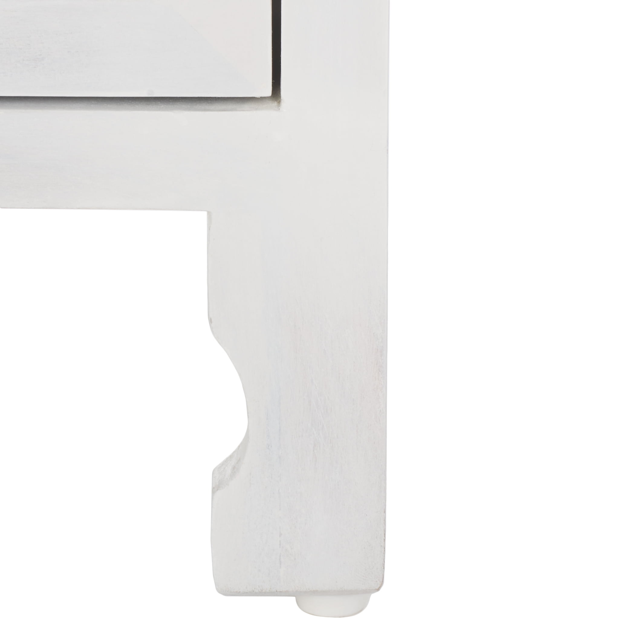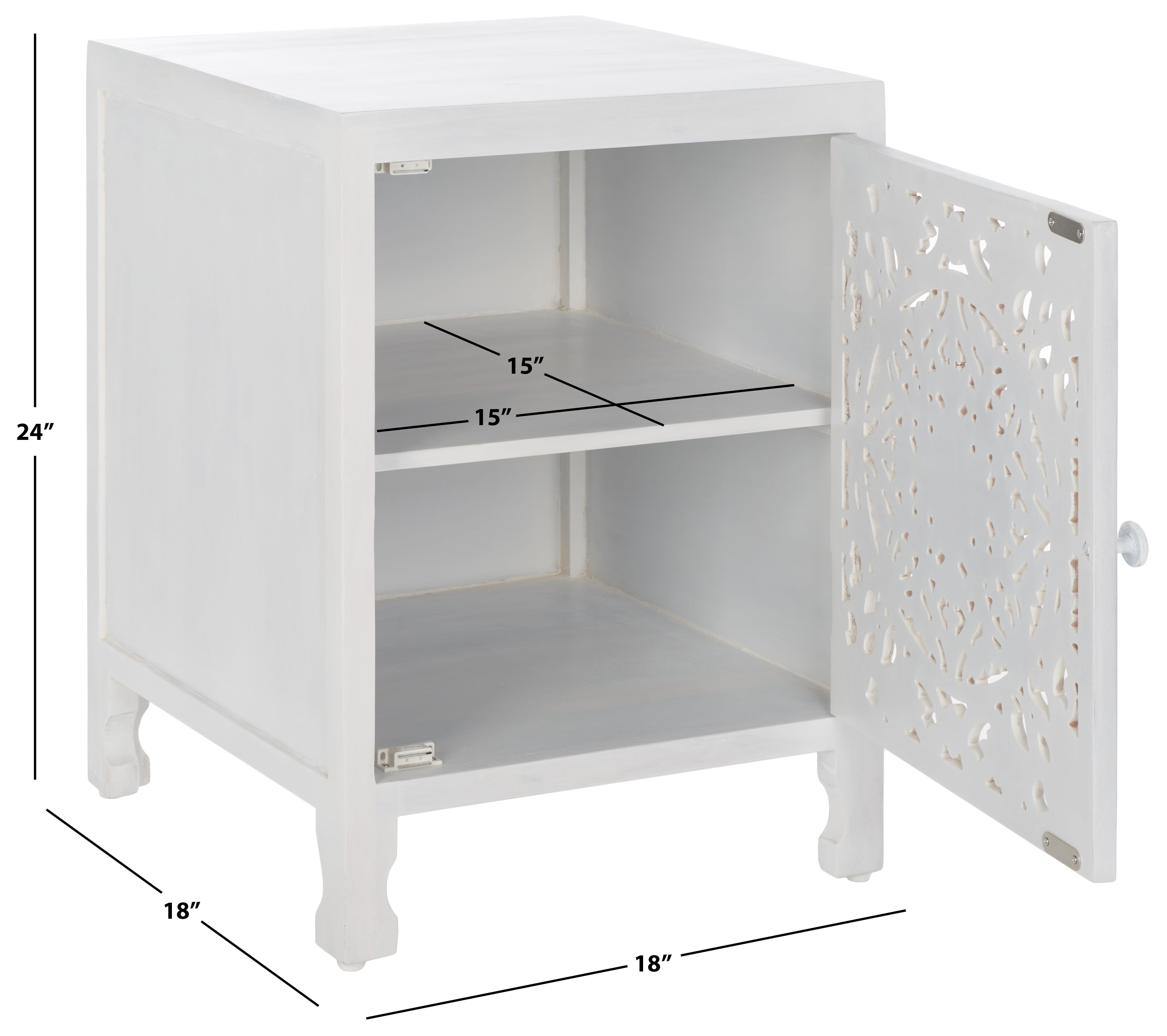 Durable wood frame for long lasting longevity No Assembly Required Color: White Wash Overall Dimension: 18 in. W x 18 in. D x 24 in. H Item Weight: 24 lbs. Weight Capacity: 50 lbs. Finish Surface Treatment: Powder Coated Dust regularly with a soft, dry cloth. Never use oiled or treated cloths on lacquered finishes. Some finishes can be wiped with a damp (not wet) cloth, followed at once by rubbing with a dry cloth to remove fingerprints and smudges. For persistent spots, gently clean with a soft cloth and a solution of water and mild soap, make sure to wipe dry. Use adhesive felt pads, coasters and placemats to protect your furniture. Leg Height: 4 in. Shelf Dimensions: 15 in. W x 15 in. D x 10 in. H Frame Type: Wood Wood Content: Mango Wood/Mdf/ Metal Metal Type (Hardware Material)/Embellishment Material: Iron