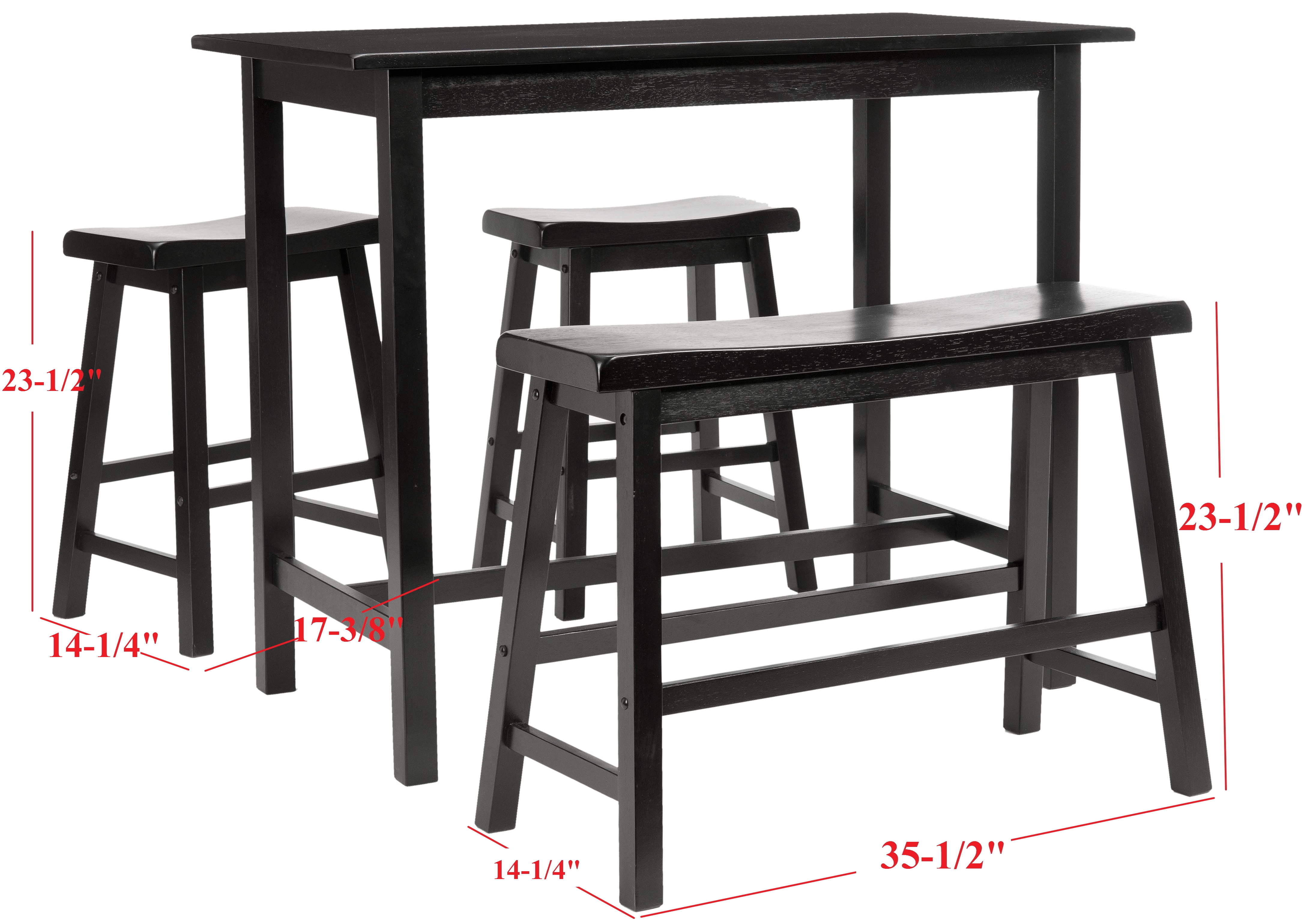 Contemporary design adds a chic look to your home Durable Malaysian oak for long-lasting durability Minor assembly needed Color: Black Table: 24 in. W x 44 in. D x 36 in. H Bench: 33 in. W x 13.2 in. D x 24 in. H Counter Stool: 17 in. W x 14.5 in. D x 24 in. H Item Weight: Table – 36.3 lbs.; Bench – 18.7 lbs.; Stool – 12.1 lbs. Footrest Height: Lower – 4.3 in; Higher – 8.3 in Weight Capacity: Table – 50 lbs.; Bench – 375 lbs.; Stool – 225 lbs. Accessories in lifestyle photo(s) not included Please note: The images and product dimensions on our website are as accurate as possible. Due to differences in computer monitors, some items’ colors may vary slightly. Wood is a natural material with variations of color shade, configuration, streaks, and grain structure. Each individual piece of Safavieh furniture has characteristic markings that will differ from photo and showroom samples. Regular attention and maintenance of fine furniture can ensure its beauty for years to come. Always use felt pads under all articles to prevent discoloration or softening of the lacquer. Plastic and rubber bases on items can discolor wood. Assembly required.