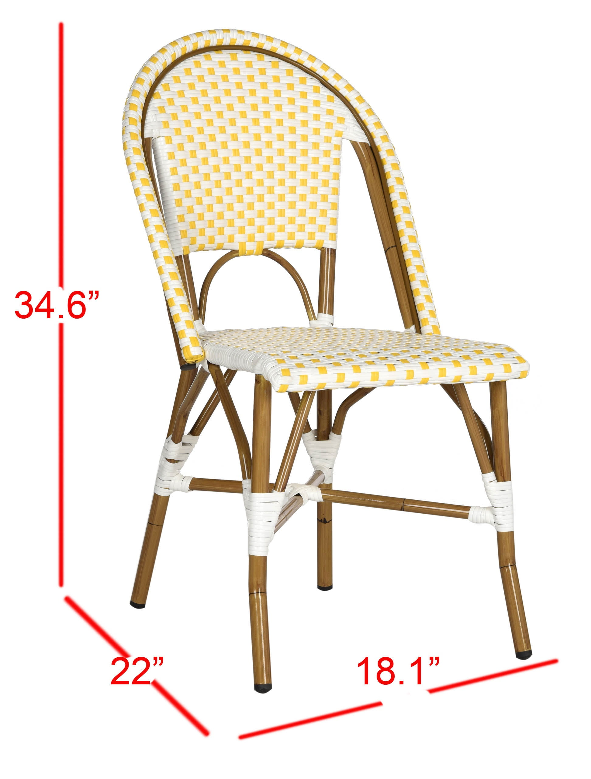 Contemporary design adds a chic look to your home Durable rattan/aluminum for long lasting longevity No Assembly Required Color: Yellow/White Frame: Light Brown Item Dimension: 18 in. W x 21.6 in. D x 34.6 in. H Seat Dimension: 16.9 in. W x 17.3 in. D x 17.3 in. H Backrest: 18.1 in. Item Weight: 8.2 lbs. May be stacked for space saving Weight Capacity: 275 lbs. Sold in a Set of 2 Easy to clean and care for Accessories in Life Style photo not included Please note: The images and product dimensions on our website are as accurate as possible. Due to differences in computer monitors, some item’s color may vary slightly. Store outdoor furniture indoors or cover well when not in use. Remove wooden furniture from standing water. Dust regularly with small brush or vacuum. Spills should be taken care of immediately before they harden or stain with a slightly dampened sponge.