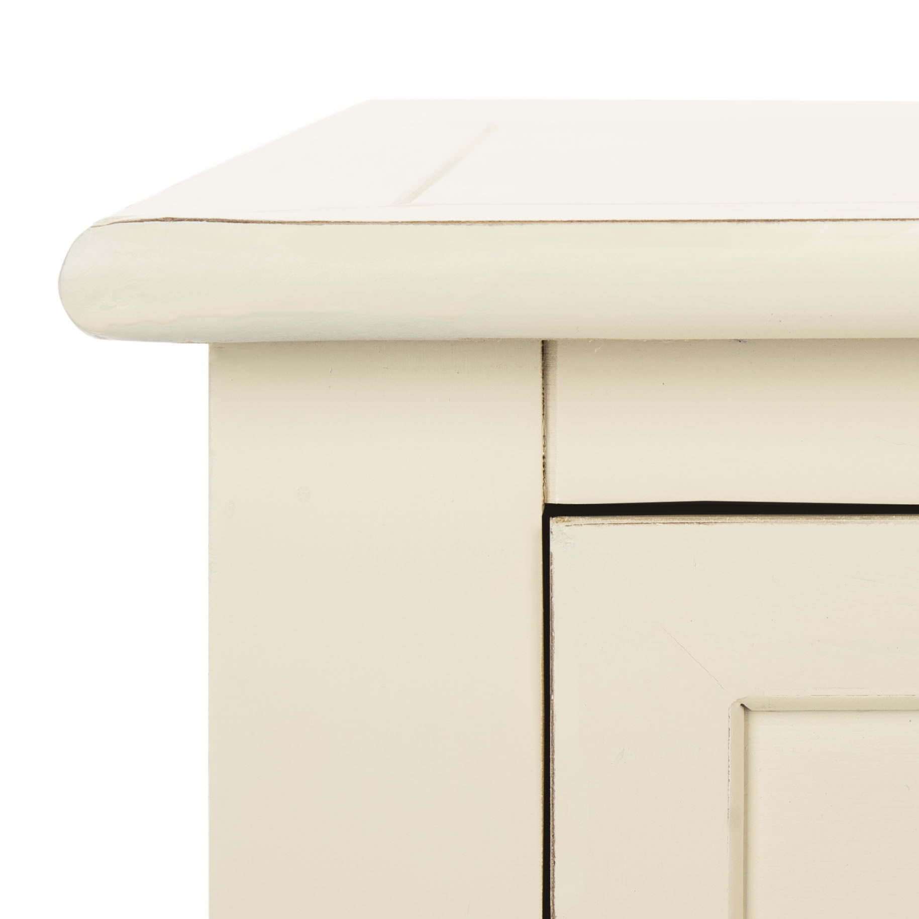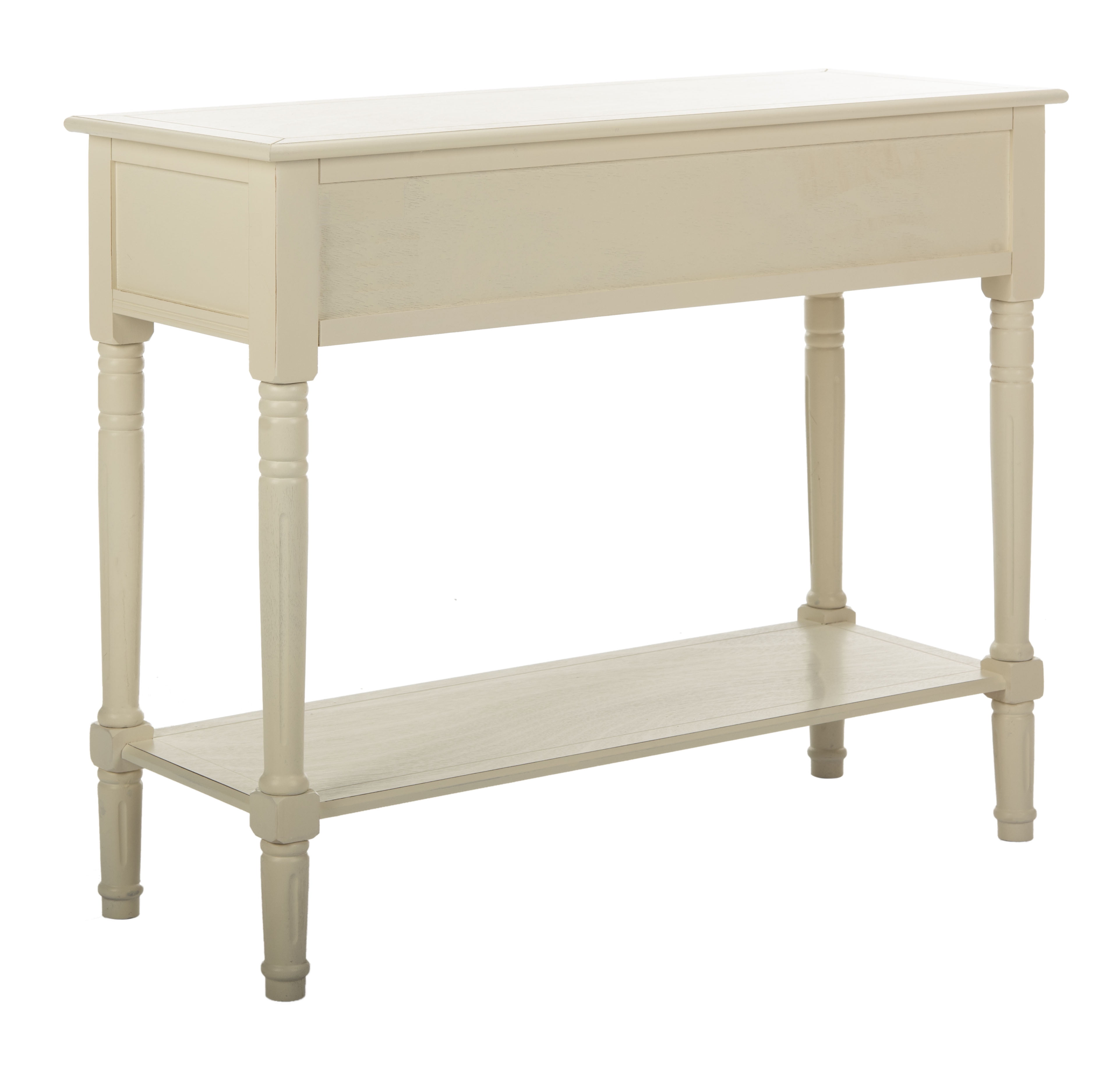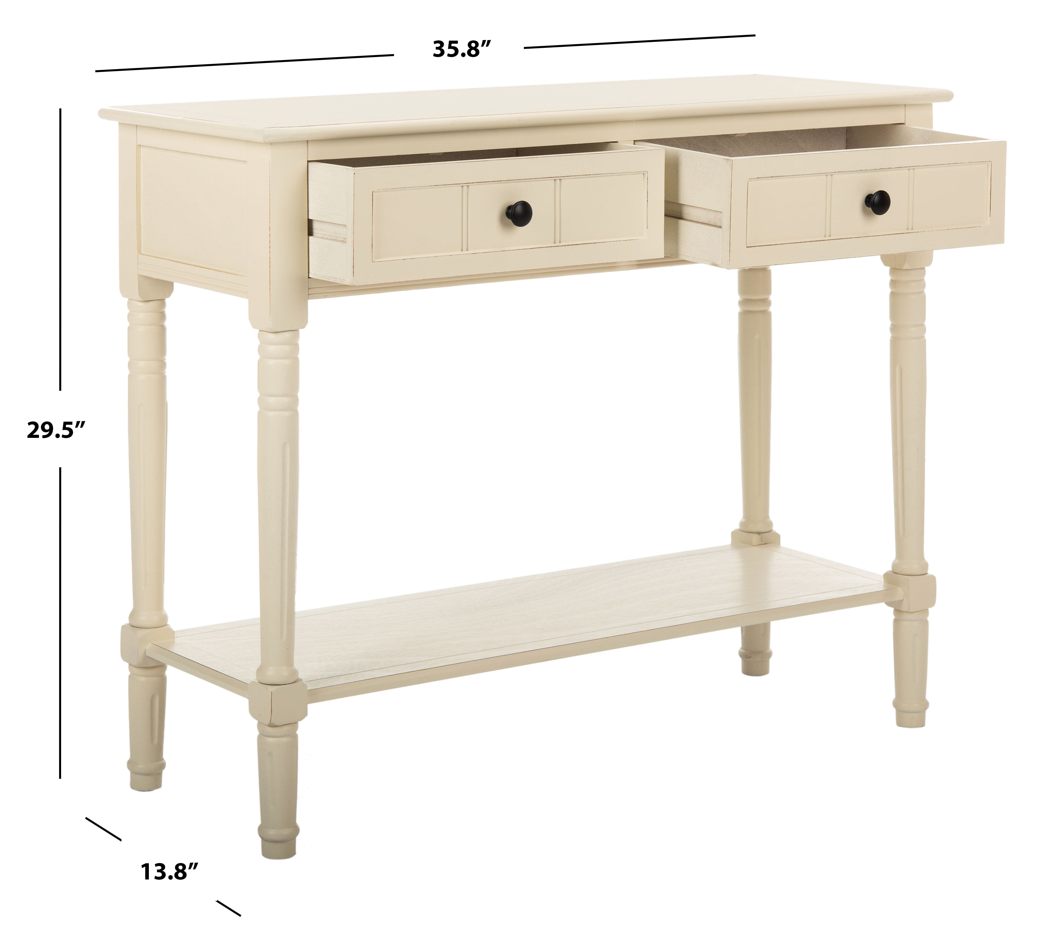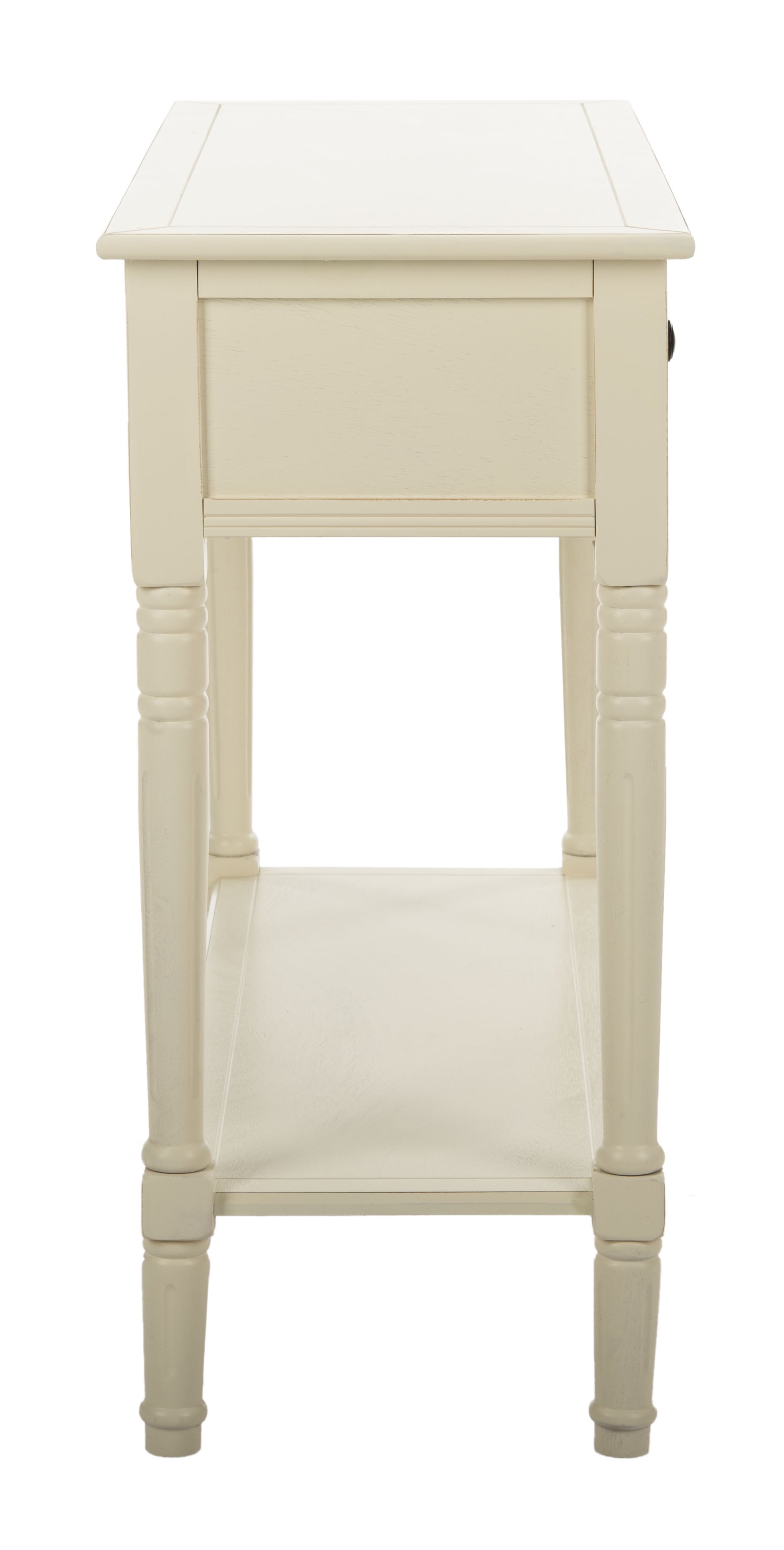Contemporary design adds a chic look to your home Durable pine wood frame for long lasting longevity Minor assembly needed Color: Distressed Cream Item Weight: 26.5 lbs. Weight Capacity: 60 lbs. Assembled Dimensions: 29.5 in. H x 35.8 in. W x 13.8 in. D Drawer Dimensions: 15.2 in. X 11 in. X 4.7 in. Features 2 drawers Wood is a natural material with variations of color shade, configuration, streaks, and grain structure. Each individual piece of Safavieh furniture has characteristic markings that will differ from photo and showroom samples. Regular attention and maintenance of fine furniture can ensure its beauty for years to come. Always use felt pads under all articles to prevent discoloration or softening of the lacquer. Plastic and rubber bases on items can discolor wood. Accessories in life style photo(s) not included Please note: The images and product dimensions on our website are as accurate as possible. Due to differences in computer monitors, some furniture colors may vary slightly. Lengths and widths may vary from the published dimensions. We do our best to provide you with an exact measurement, but please be advised that some variation exists. Dust regularly with a soft, dry cloth. Never use oiled or treated cloths on lacquered finishes. Some finishes can be wiped with a damp (not wet) cloth, followed at once by rubbing with a dry cloth to remove fingerprints and smudges. For persistent spots, gently clean with a soft cloth and a solution of water and mild soap, make sure to wipe dry. Use adhesive felt pads, coasters and placemats to protect your furniture.
