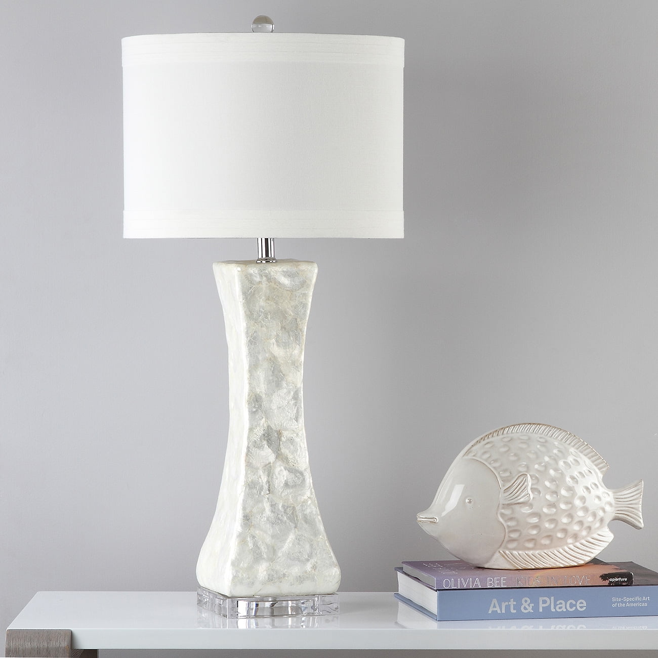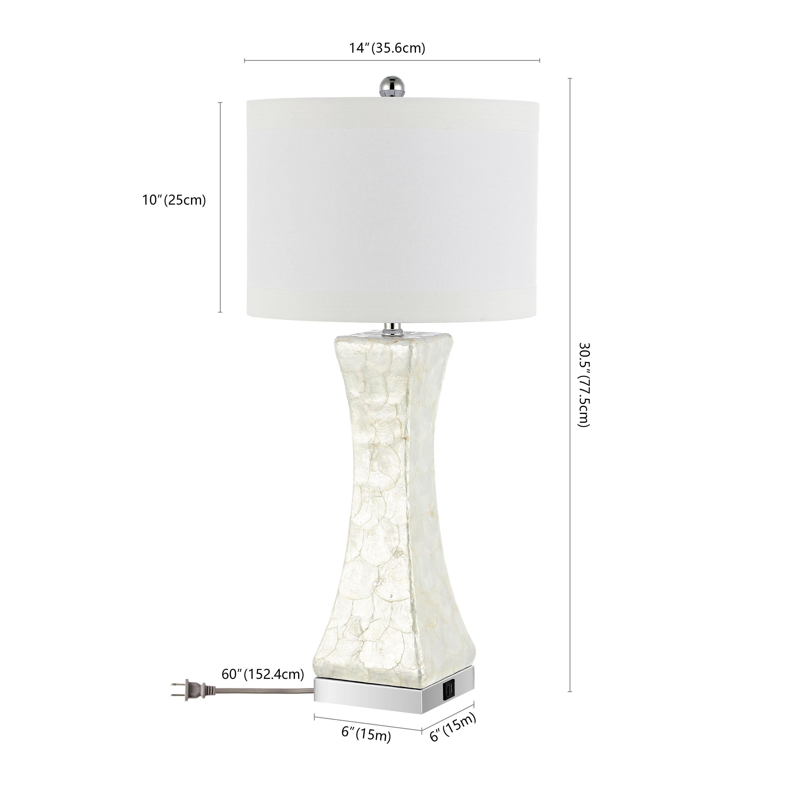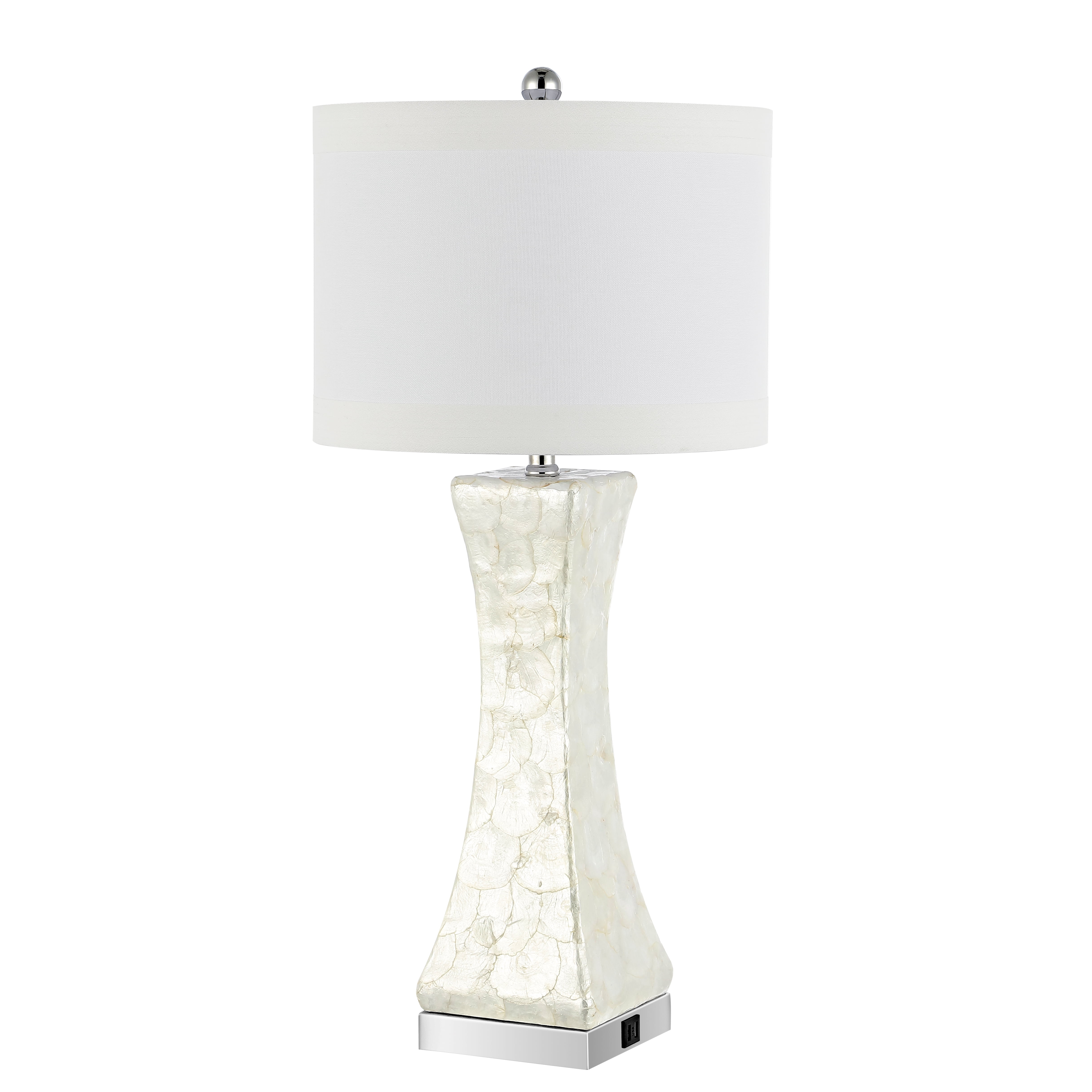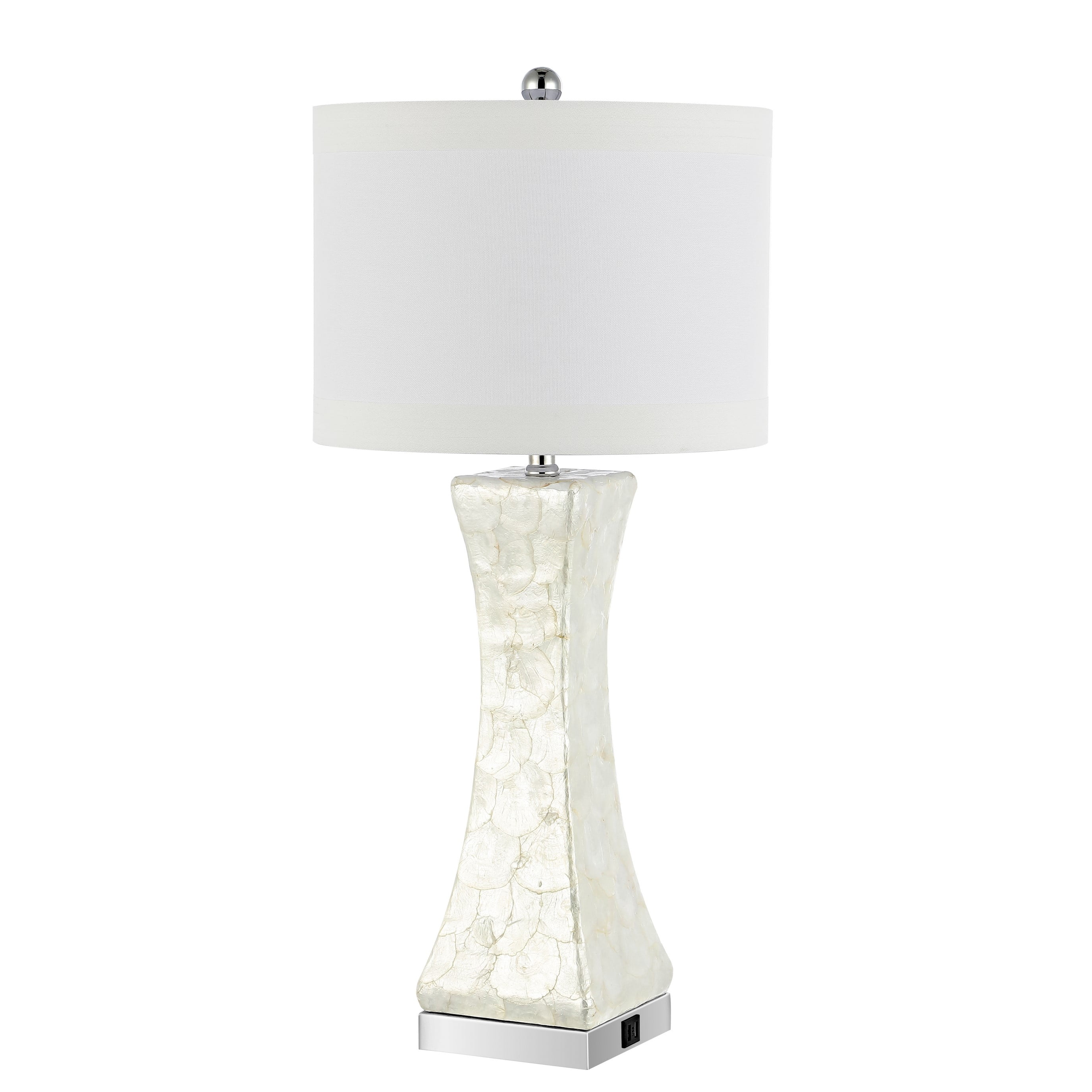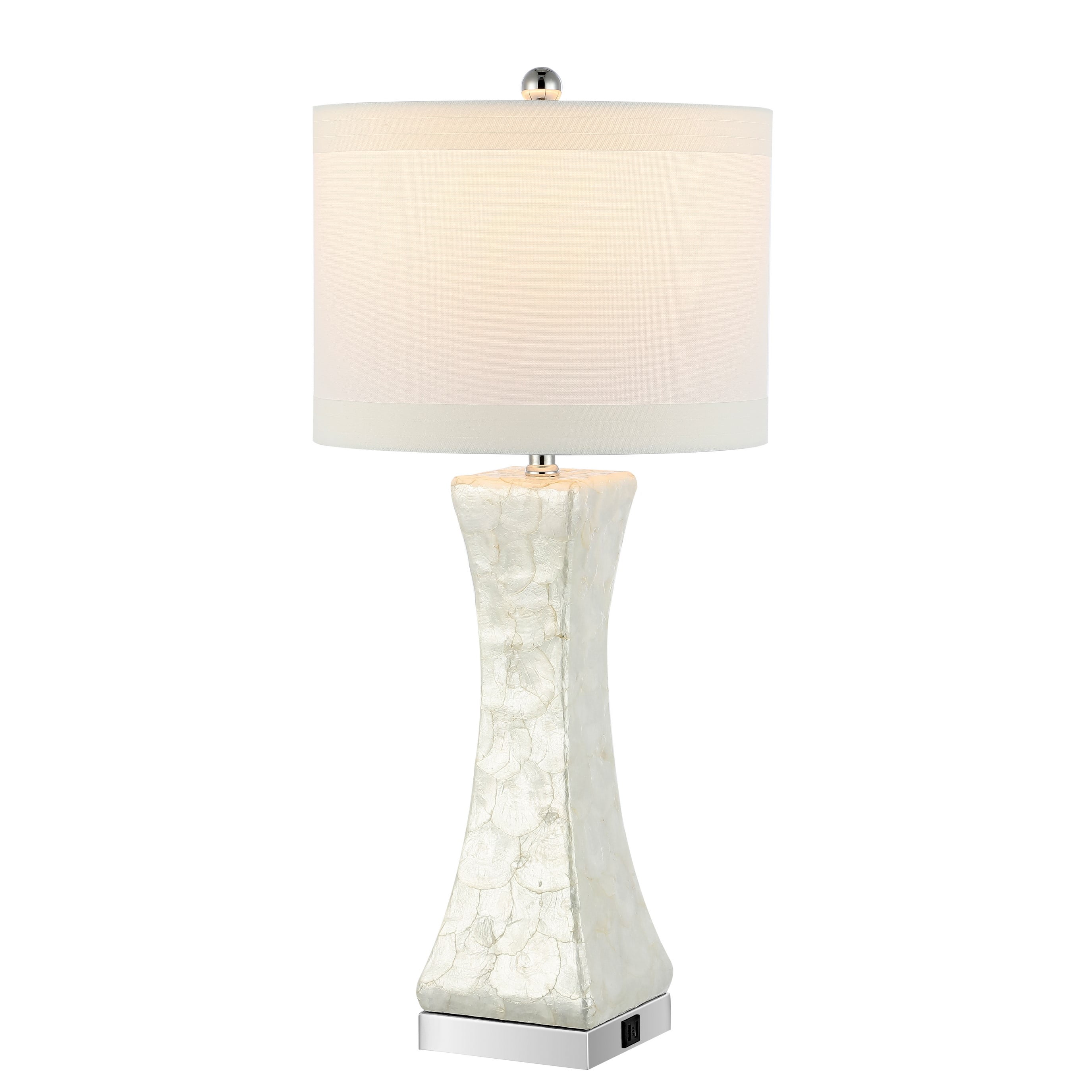 Contemporary design adds a chic look to your home Durable shell frame for long lasting longevity Easy to clean and maintain Minor assembly needed Color: White Shade Color: White Item Dimension: 14 in. W x 14 in. D x 30.5 in. H Crafted with: Shell Shade Material: Fabric Shade Height: 10 in. Shade Bottom Dimension: 14 in. W x 14 in. L Shade Top Dimension: 14 in. W x 14 in. L Harp Color: Silver Harp Height: 8 in. Cord Color: Light Grey Cord Length: 60 in. Lamp Body Dimension: 6.125 in. W x 6.125 in. D x 16.625 in. H Bottom Base Dimension: 6 in. W x 6 in. D x 1.5 in. H Item Weight: 16.28 lbs Lamp Certification: UL Light Bulb Base Type: E26 Switch Mechanism: On/Off Rotary Switch Type of Bulb Included: A19 Max Wattage: 100W Lumen: 805 Quantity of Bulb(s): 1 Finial Color: Chrome Sold in a Set of 2