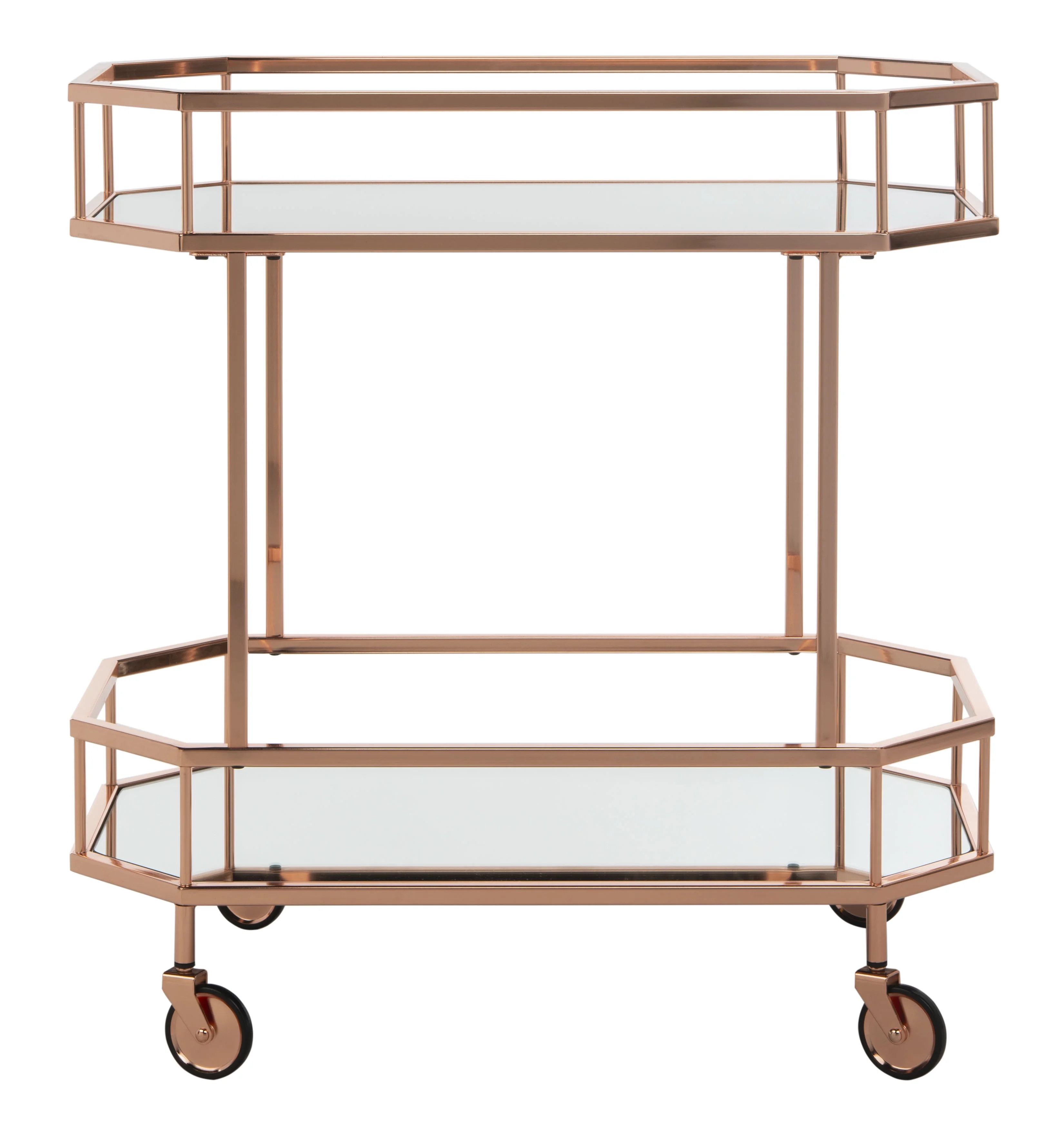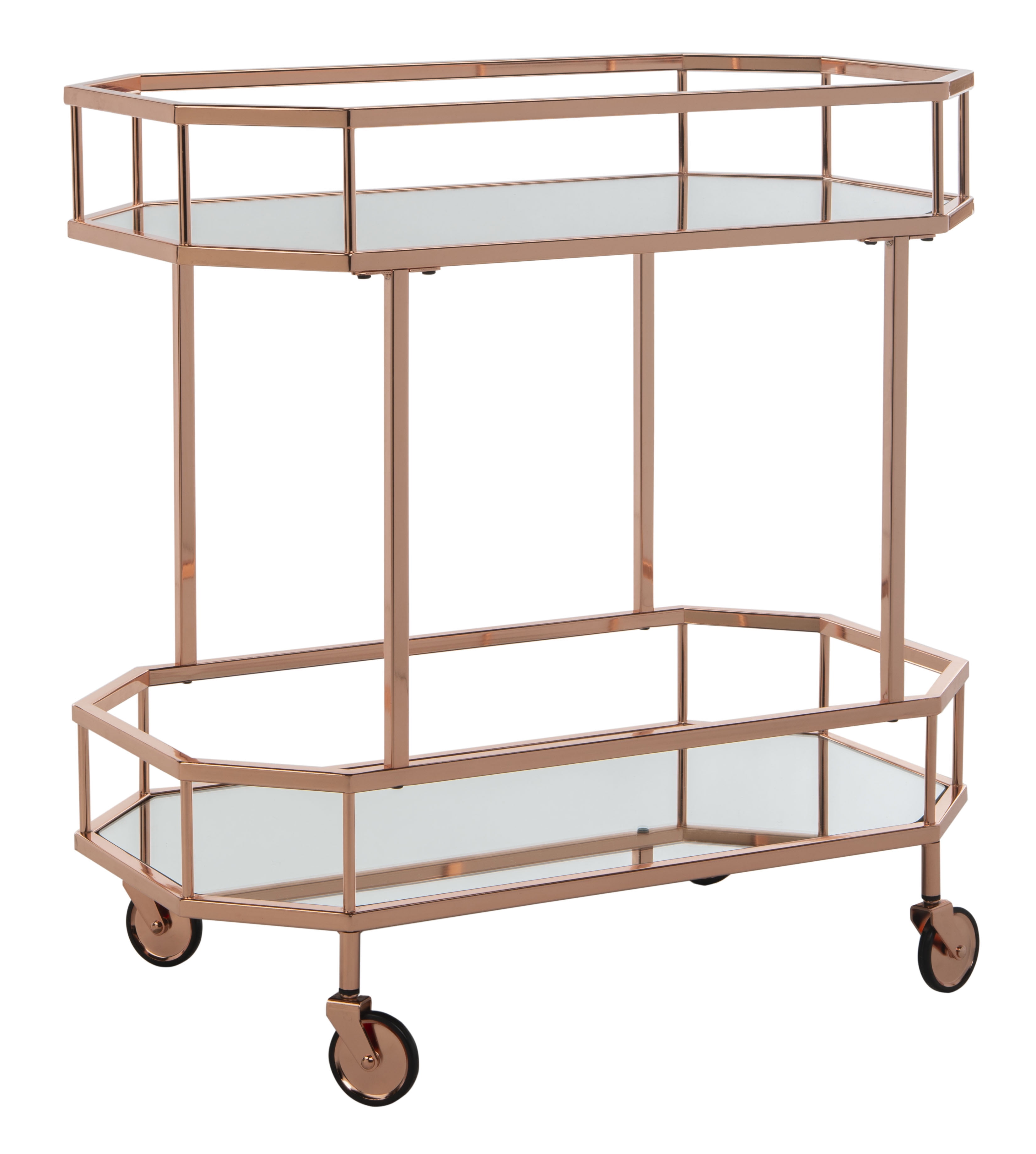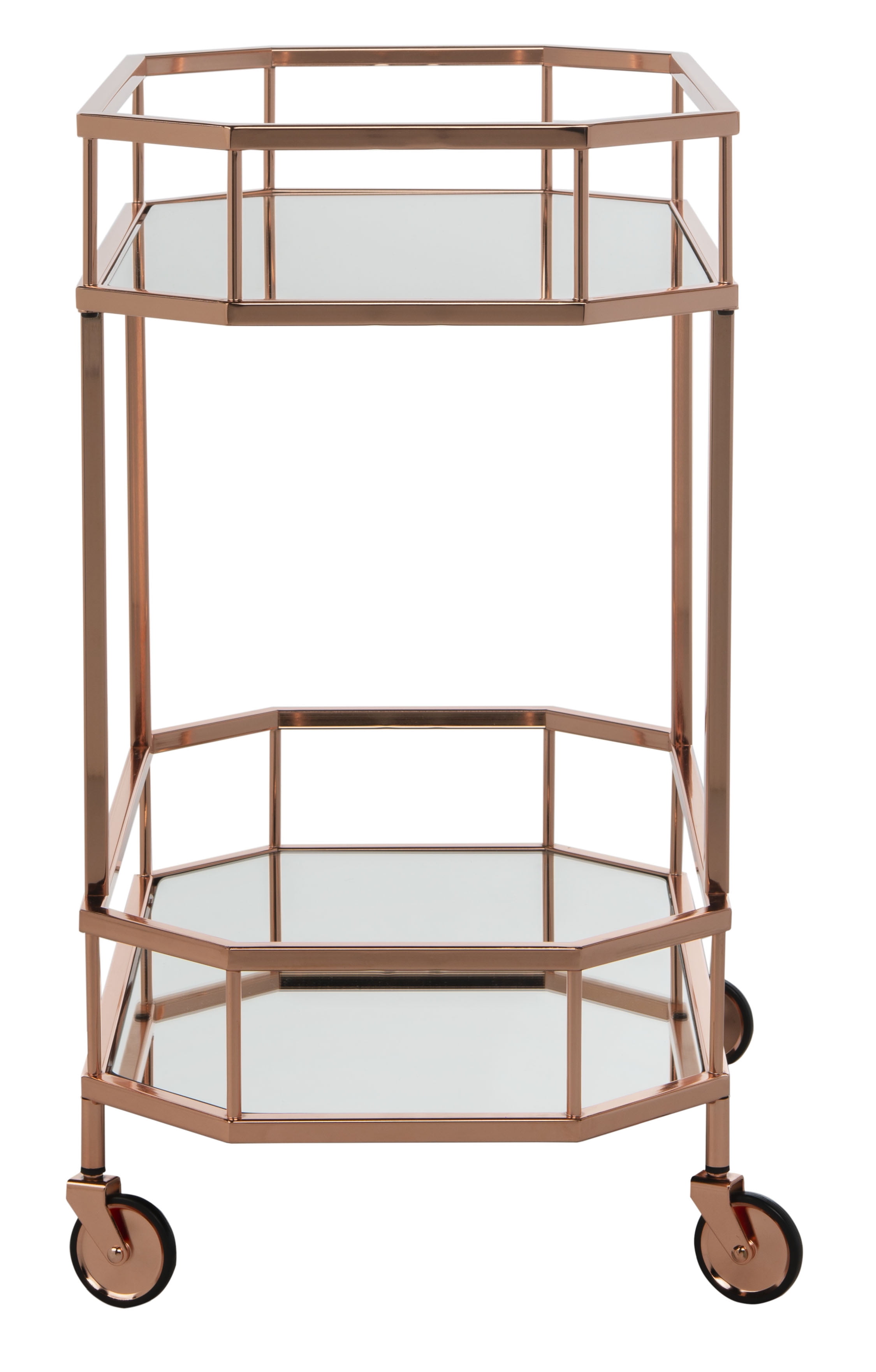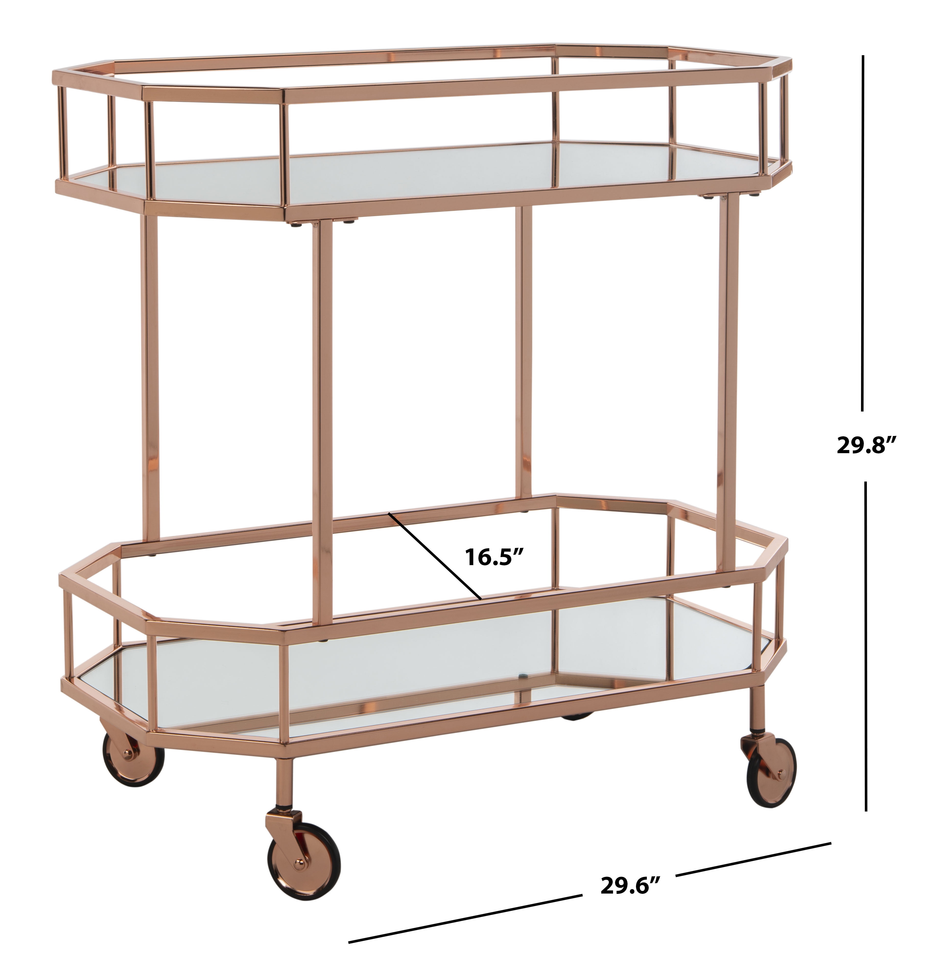 Shop SAFAVIEH at . Save Money. Live Better. SAFAVIEH Silva 2 Tier Modern Glam Octagon Bar Cart with Casters, Rose Gold A must have for entertaining, this contemporary 2 tier octagon bar cart makes it easy to serve guests in grand style. Its sleek angles highlight its clean lines while luxurious mirrored layers add glamour and drama as they reflect its rose gold finish. For over 100 years, SAFAVIEH has set the standard for finely crafted rugs and home furnishings. Begin your rug, furniture, lighting, outdoor, and home decor search and discover over 100,000 SAFAVIEH products today.