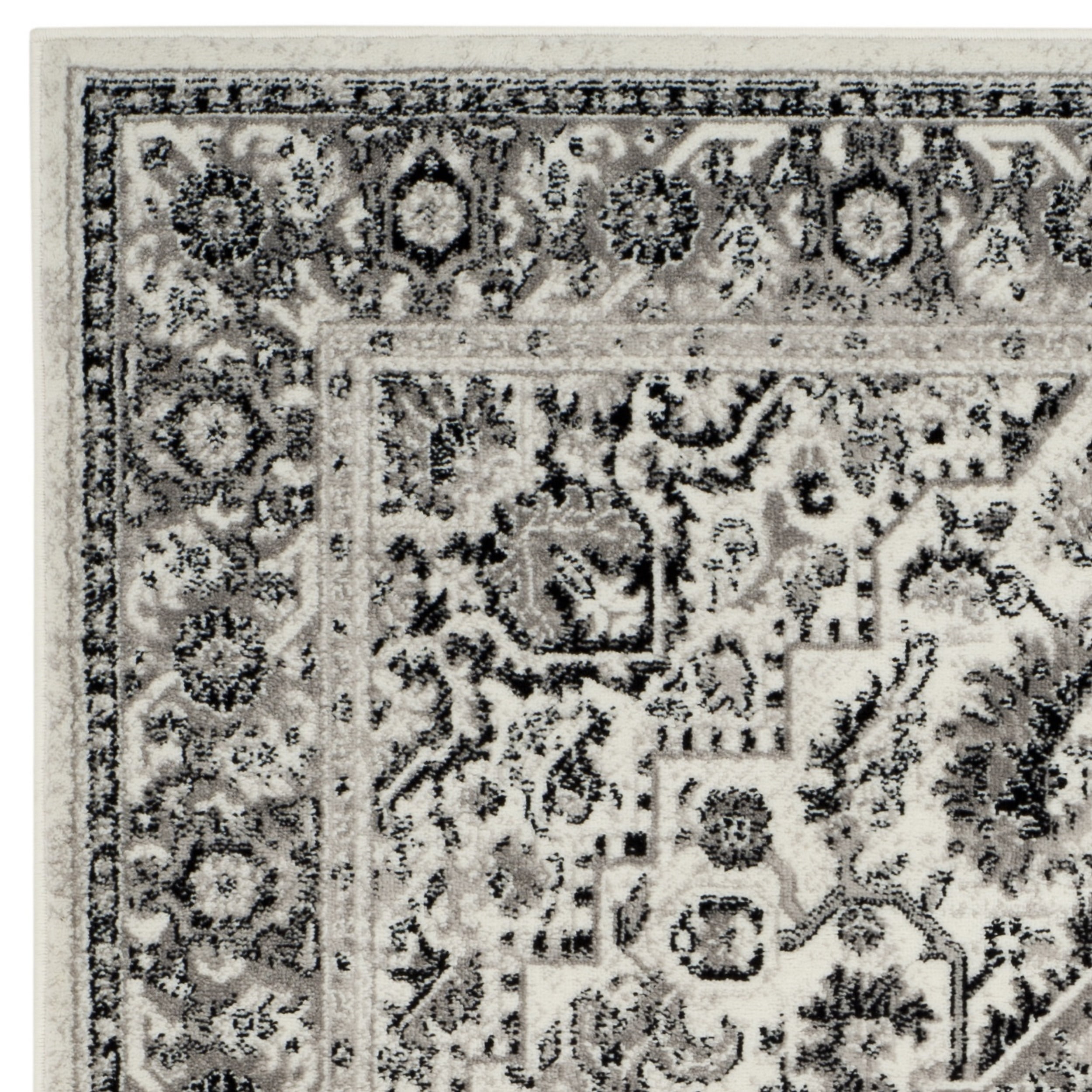 Color: Grey/Ivory Size: 5’1″ x 7’6″ Power Loomed in Turkey Pile Height: 0.25 in. No backing, rug pad (sold separately) recommended to help prevent shifting and sliding 100% Polypropylene Stylish addition for any room Accessories in lifestyle photos not included Vacuum regularly (preferably one without beater bars) and spot clean; for hard-to-remove stains, professional rug cleaning is recommended; rotating your rugs every 3-6 months will protect against uneven wear from foot traffic and furniture weight Use rug protectors under the legs of heavy furniture to avoid flattening piles Avoid direct sunlight as it will cause the colors in your area rug to fade over time; place your area rug away from direct sunlight whenever possible For an instant decorating makeover, this area rug is one of the easiest and most fashionable ways to refresh a room with character and style. Please note: The images and product dimensions on our website are as accurate as possible. Due to differences in computer monitors, some rug colors may vary slightly. Lengths and widths may vary from the published dimensions. We do our best to provide you with an exact measurement, but please be advised that some variation exists. Patterns may vary slightly according to shape and size selected. Packing and shipping of your rug may cause temporary creases; these surface waves are not imperfections or damages and will gradually recede; back-rolling or reverse rolling is the fastest and easiest way to remove creases in your area rug; allow ample time for your rug to settle, these creases and waves will normally flatten out Available in multiple sizes For carpet-to-carpet use, we recommend placing a hold pad in-between for protection