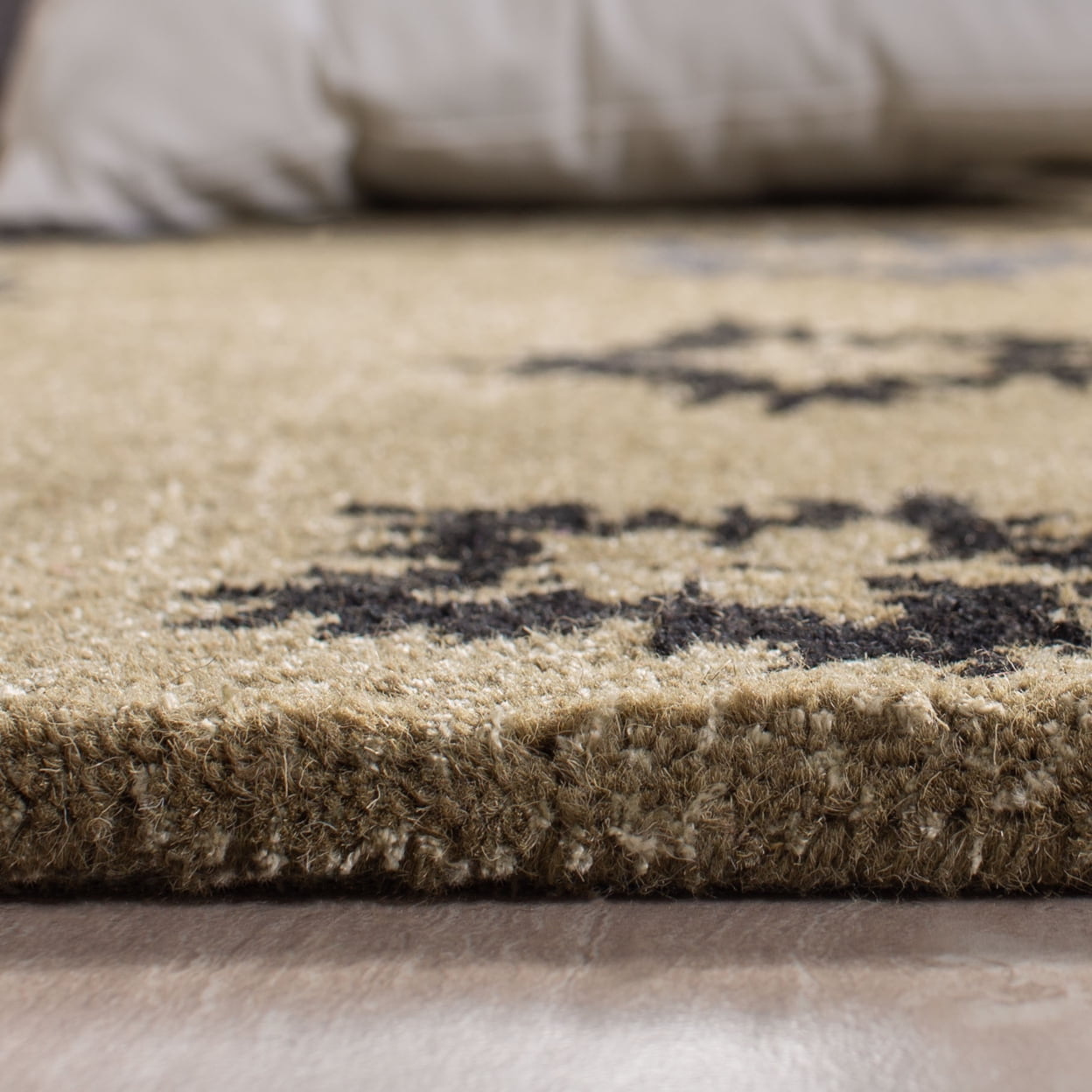 Color: Sage/Black Size: 6′ x 6′ Round Hand Tufted in India Pile Height: 0.5 in. Cotton backing, rug pad (sold separately) recommended to help prevent shifting and sliding 100% Wool Pile Stylish addition for any room Accessories in lifestyle photos not included New wool rugs shed as a natural consequence of how they are made; vacuum a new wool rug 1-2 times a week for the first few weeks using a low pressure vacuum cleaner without beater bars; vacuum in the direction of the pile, not against it; do not pull loose ends or stray loops, clip them with scissors to remove Vacuum (preferably one without beater bars) regularly and spot clean; for hard-to-remove stains, professional rug cleaning is recommended; rotating your rugs every 3-6 months will protect against uneven wear from foot traffic and furniture weight Use rug protectors under the legs of heavy furniture to avoid flattening piles Avoid direct sunlight as it will cause the colors in your area rug to fade over time; place your area rug away from direct sunlight whenever possible For an instant decorating makeover, this area rug is one of the easiest and most fashionable ways to refresh a room with character and style. Please note: The images and product dimensions on our website are as accurate as possible. Due to differences in computer monitors, some rug colors may vary slightly. Lengths and widths may vary from the published dimensions. We do our best to provide you with an exact measurement, but please be advised that some variation exists. Patterns may vary slightly according to shape and size selected. Packing and shipping of your rug may cause temporary creases; these surface waves are not imperfections or damages and will gradually recede; back-rolling or reverse rolling is the fastest and easiest way to remove creases in your area rug; allow ample time for your rug to settle, these creases and waves will normally flatten out Available in multiple color and sizes For carpet-to-carpet use, we recommend placing a hold pad in-between for protection