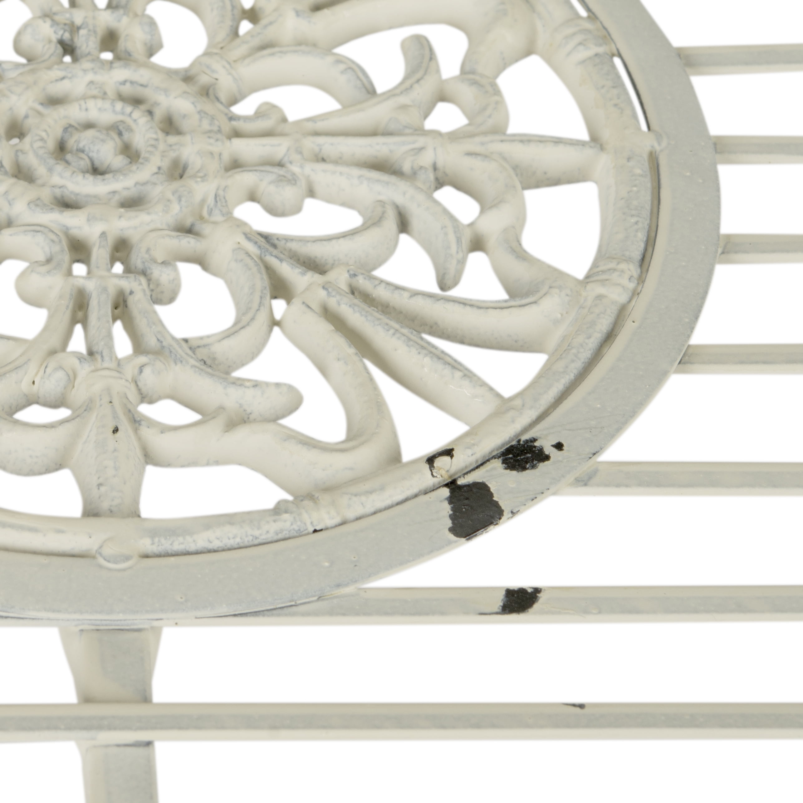 Contemporary design adds a chic look to your home Durable iron frame for long lasting longevity Minor Assembly Required Color: Antique White Table Dimension: 39.25 in. W x 23.5 in. D x 22 in. H Bench Dimension: 45.25 in. W x 22 in. D x 38.5 in. H Chair Dimension: 24 in. W x 22 in. D x 38.5 in. H Bench Seat Dimension: 42.5 in. W x 18 in. D x 17 in. H Chair Seat Dimension: 21.75 in. W x 18 in. D x 17 in. H Table Weight Capacity: 100 lbs Bench Weight Capacity: 300 lbs Chair Weight Capacity: 240 lbs Easy to clean and care for Accessories in Life Style photo not included Please note: The images and product dimensions on our website are as accurate as possible. Due to differences in computer monitors, some item’s color may vary slightly. Store outdoor furniture indoors or cover well when not in use. Remove wooden furniture from standing water. Dust regularly with small brush or vacuum. Spills should be taken care of immediately before they harden or stain with a slightly dampened sponge.