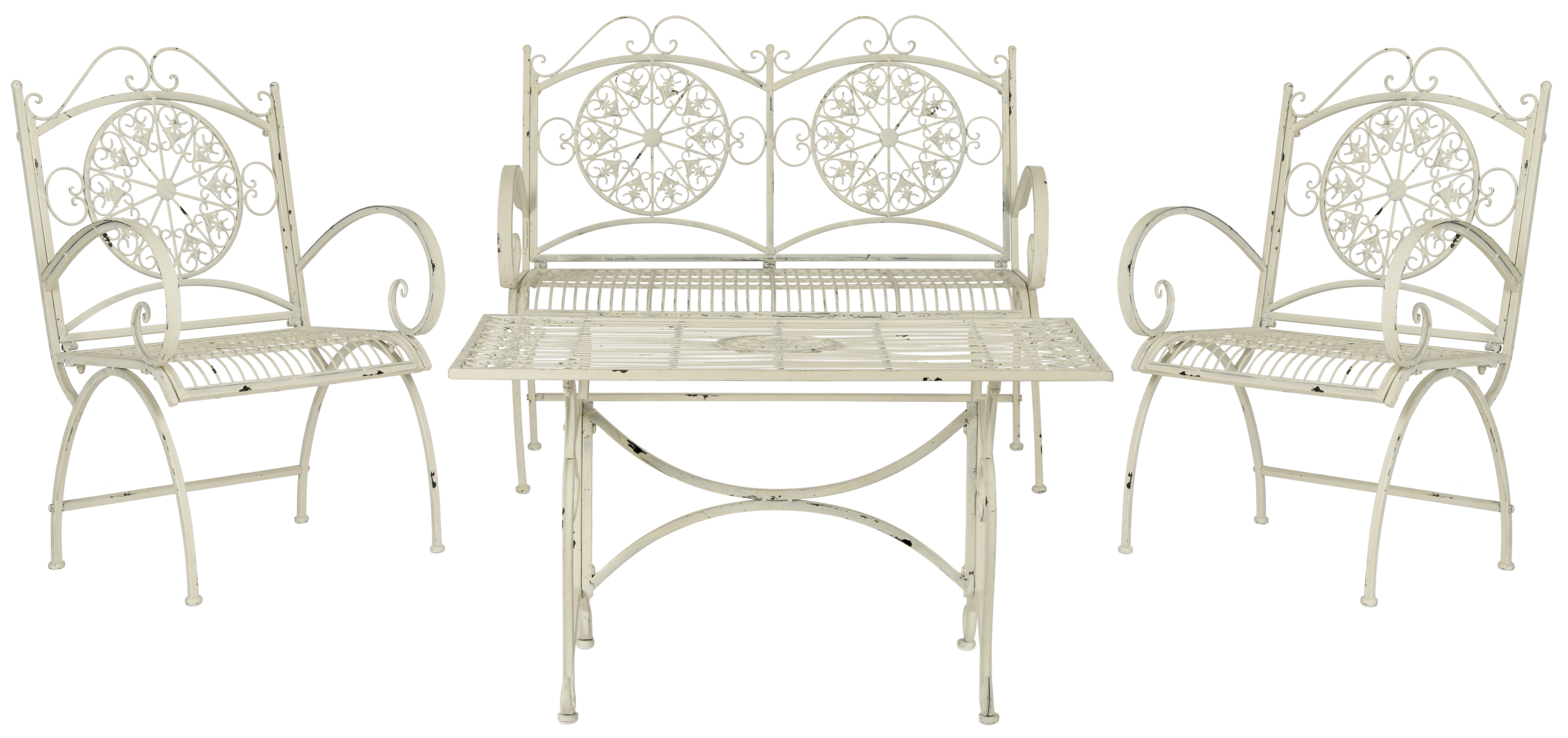Shop Safavieh at . Save Money. Live Better. Safavieh Sophie Outdoor Traditional 4 Piece Living Set As shabby-chic as a flea market find, but fresh and new, this four-piece antique white outdoor set adds a romantic look to a porch or patio. Crafted of sturdy painted iron, this filigreed set includes a love seat, two chairs and slat-top coffee table.
