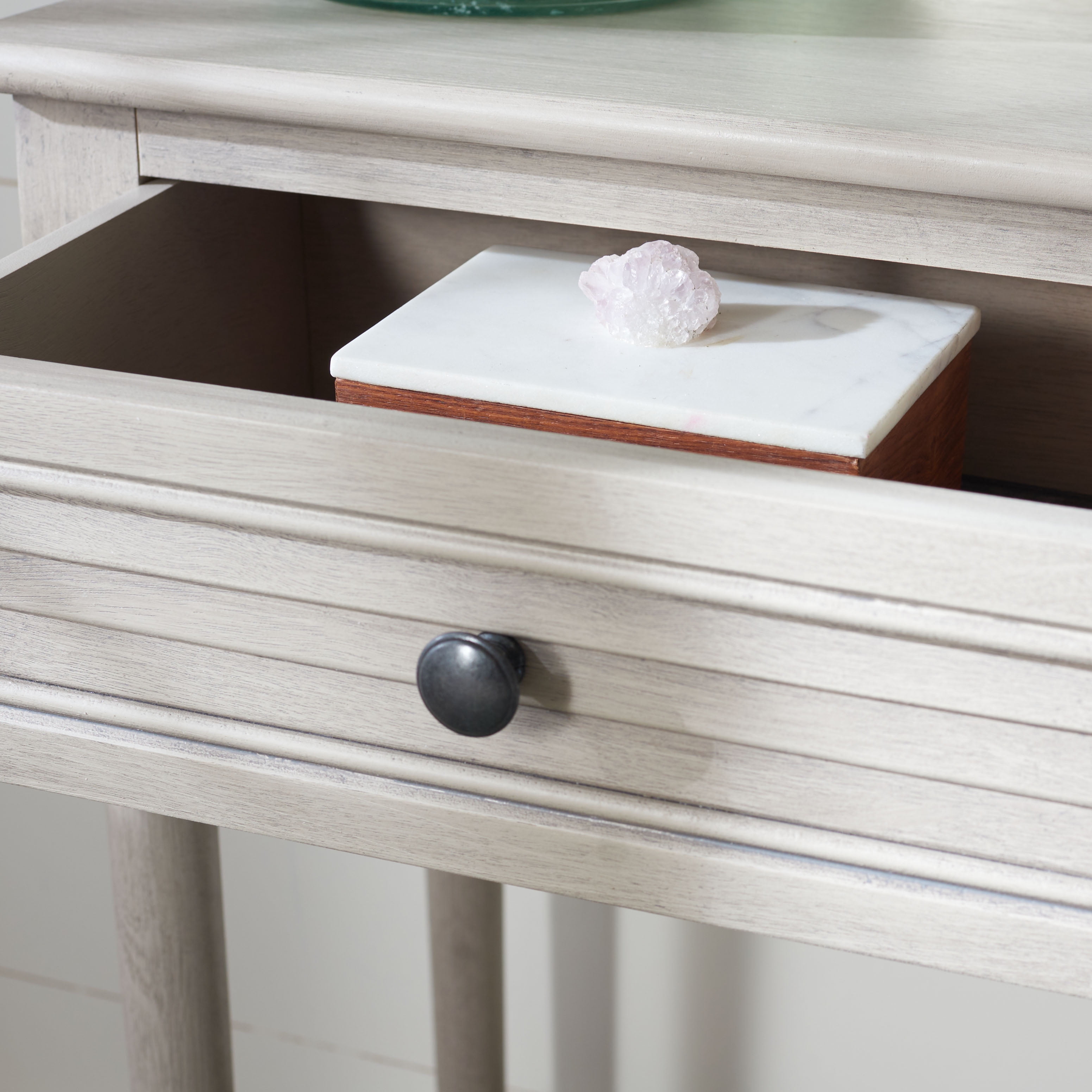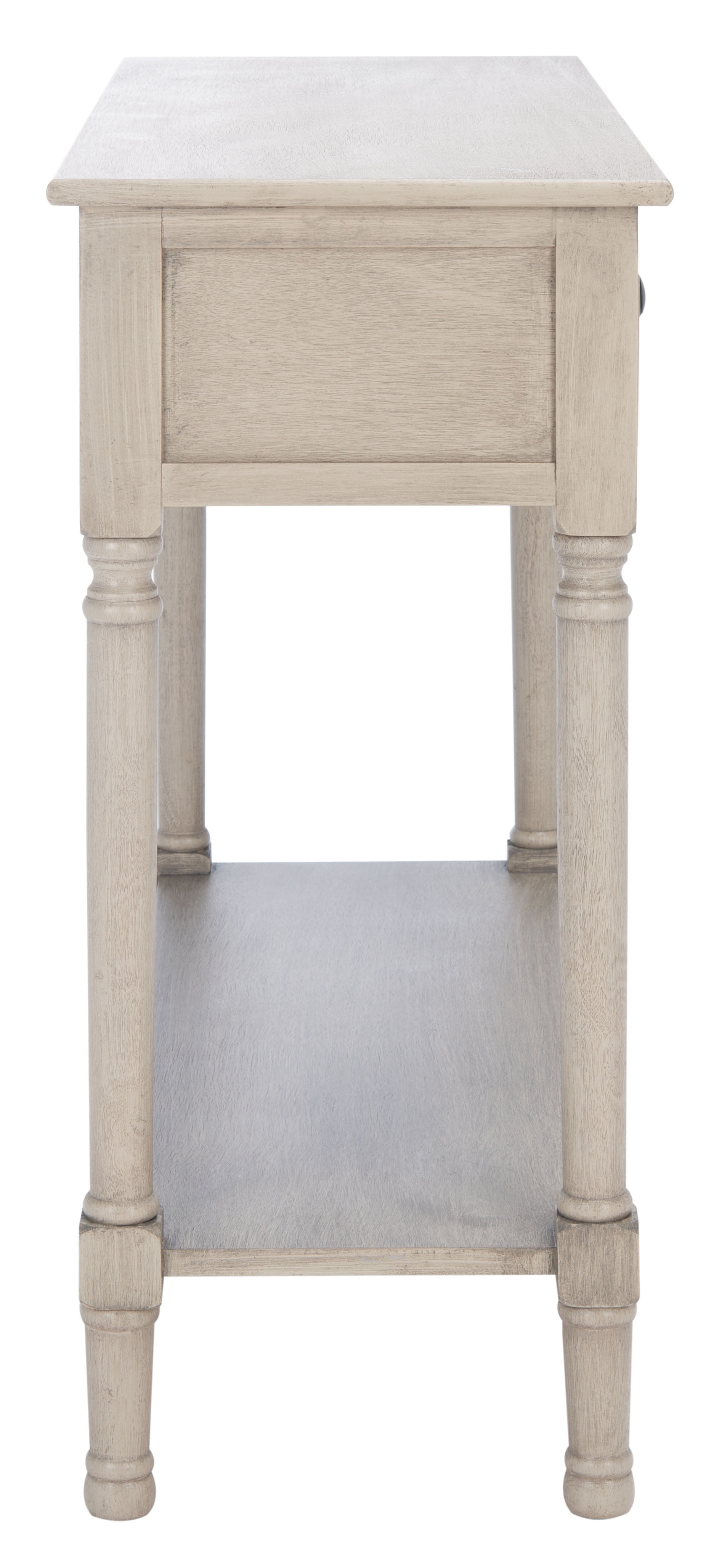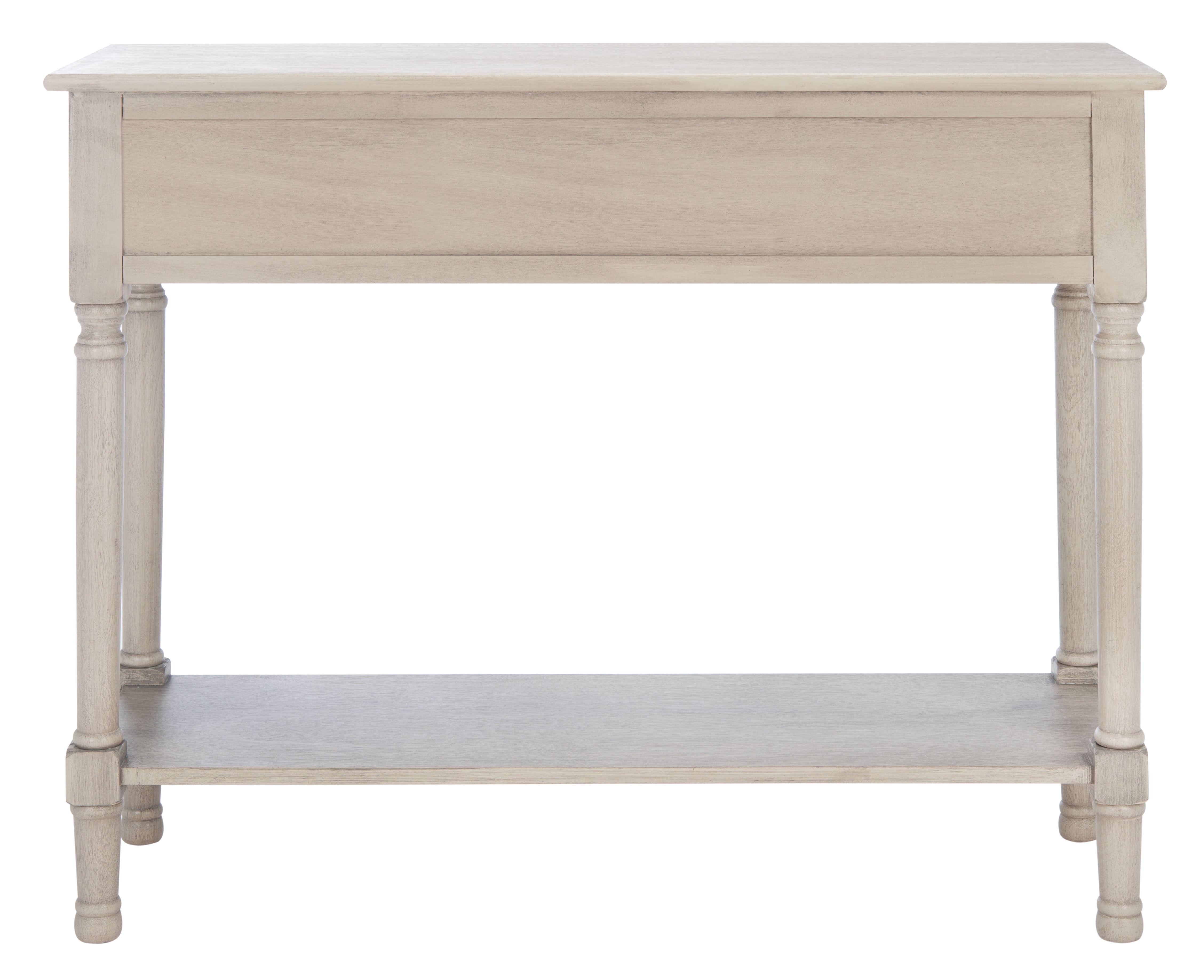 Durable wood frame for long lasting longevity Minor assembly needed Color: Greige Overall Dimension: 36 in. W x 13 in. D x 29.5 in. H Item Weight: 26.4 lbs. Weight Capacity: 40 lbs. Finish Surface Treatment: Water Based Paint Dust regularly with a soft, dry cloth. Never use oiled or treated cloths on lacquered finishes. Some finishes can be wiped with a damp (not wet) cloth, followed at once by rubbing with a dry cloth to remove fingerprints and smudges. For persistent spots, gently clean with a soft cloth and a solution of water and mild soap, make sure to wipe dry. Use adhesive felt pads, coasters and placemats to protect your furniture. Drawer Dimensions: 14 in. W x 8.7 in. D x 4.4 in. H Quantity of Drawers: 2 Shelf Dimensions: 30.9 in. W x 8.4 in. D x 15.2 in. H Frame Type: Wood Wood Content: Pine/Mdf Metal Type (Hardware Material)/Embellishment Material: Zinc Alloy