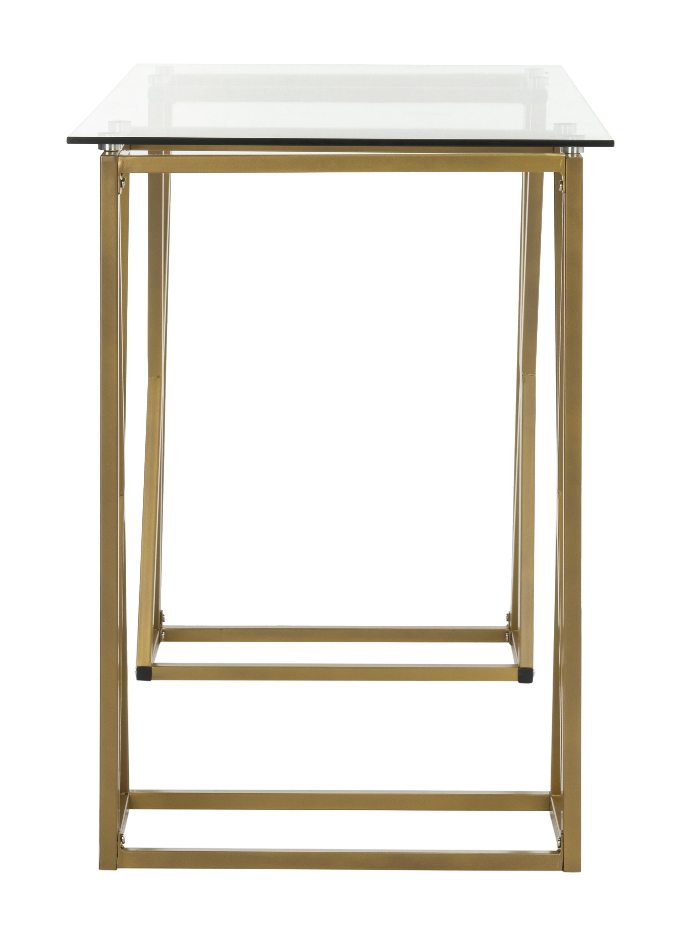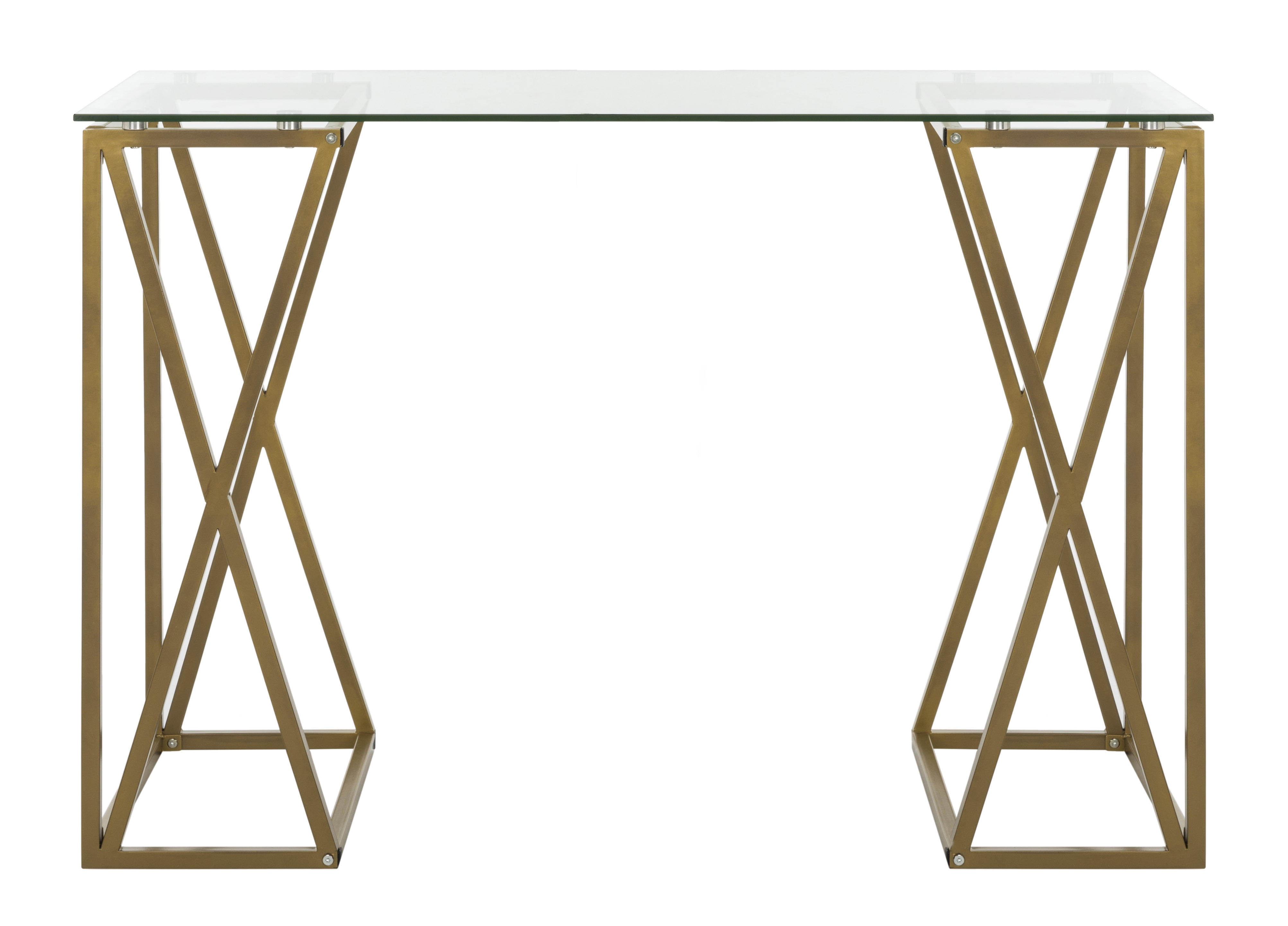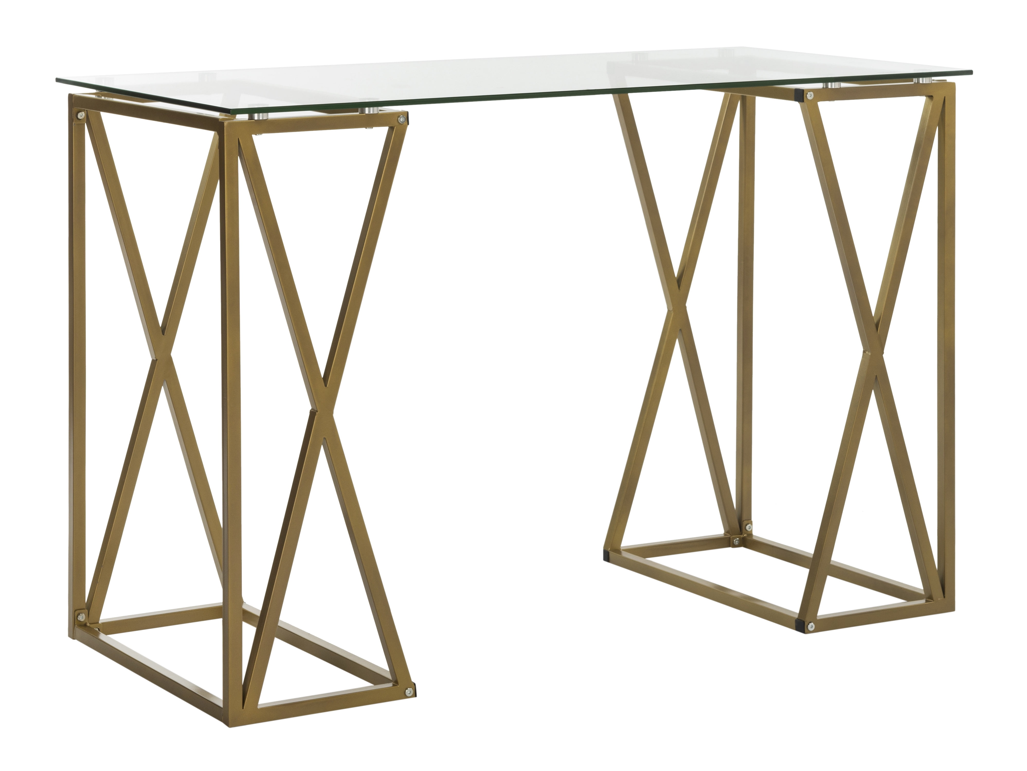 Shop SAFAVIEH at . Save Money. Live Better. SAFAVIEH Theresa Modern Glam Glass Top Desk, Clear/Gold Designed for the minimalist lifestyle, this glass top desk brings sleek modern style to the home office. Topped with a smooth transparent glass surface, its dynamic sculptural metal frame features a sophisticated gold finish that adds instant glamour. For over 100 years, SAFAVIEH has set the standard for finely crafted rugs and home furnishings. Begin your rug, furniture, lighting, outdoor, and home decor search and discover over 100,000 SAFAVIEH products today.