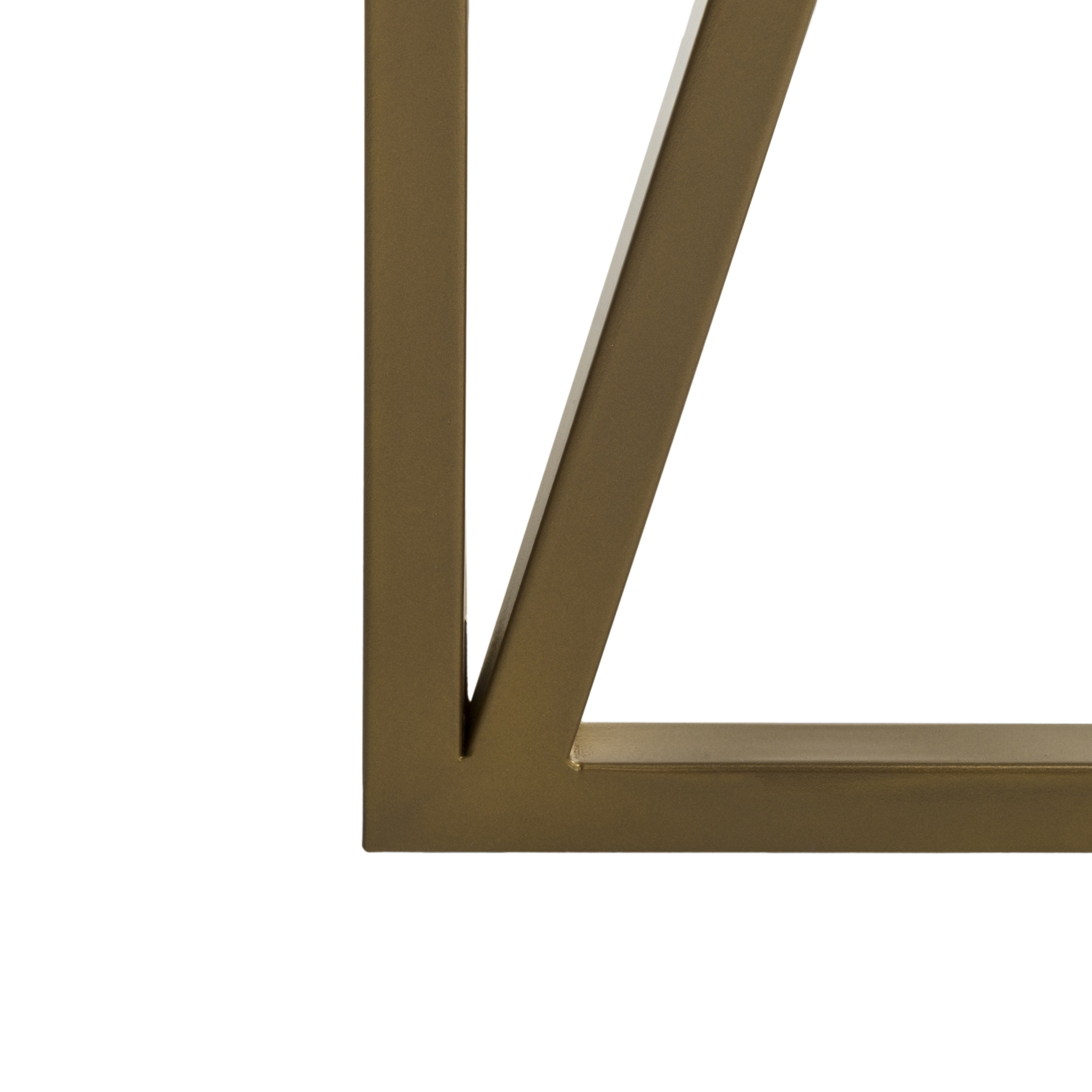 Dimensions: 43.3W x 21.65D x 29.53H in. Constructed of glass, metal, and tempered glass Features a gold finish Offers geometric style lines Assembly required