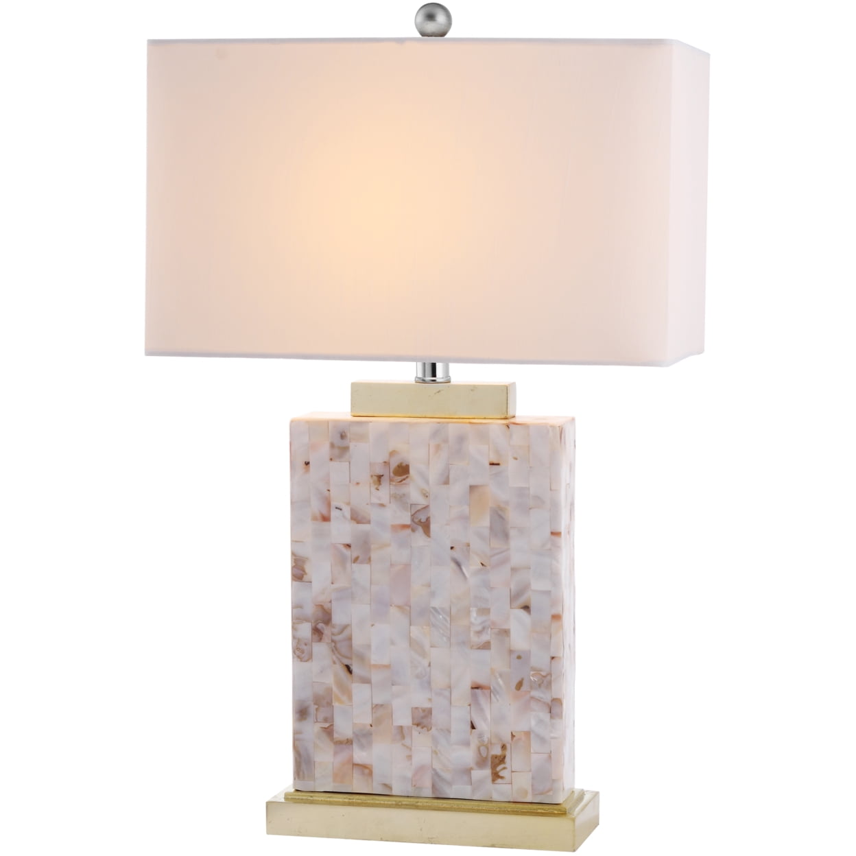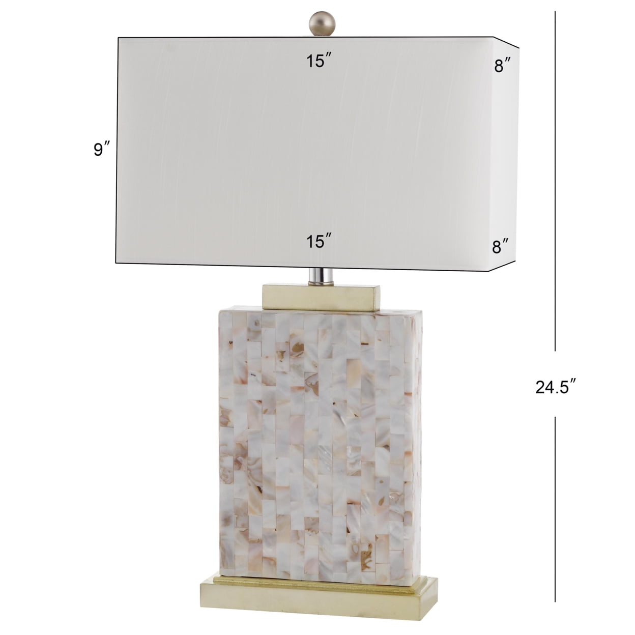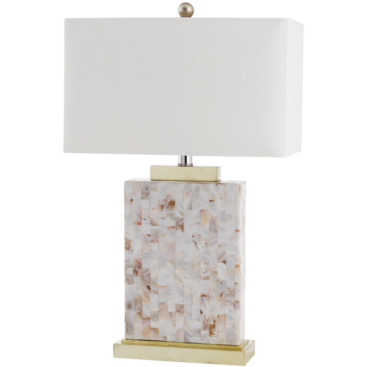 Contemporary design adds a chic look to your home Durable shell frame for long lasting longevity Easy to clean and maintain Minor assembly needed Color: Cream Metal Finish: Gold Crafted with: Shell Final Color: Bushed Gold Item Weight: 14.3 lbs Item Dimensions: 15 in. W x 8 in. D x 24.5 in. H Lamp Body Dimensions: 8 in. W x 2.25 in. D x 12 in. H Bottom Base Dimensions: 9 in. W x 3.25 in. D x 1.25 in. H Shade Color: White Shade Material: 30% Cotton; 70% Polyester Shade Height: 9 in. Shade Bottom Dimension: 8 in. W x 15 in. L Shade Top Dimension: 8 in. W x 15 in. L Shade Shape: Square Harp Color: Gold Harp Height: 7 in. Cord Color: Light Grey Cord Length: 60 in. Lamp Certification: UL Light Bulb Base Type: E26 Screw Terminal Switch Mechanism: Rotary Switch Type of Bulb Included: E26 LED A19 9W Max Wattage: 13W Watt: 13W Lumen: 830 Quantity of Bulb(s): 2 Bulb Size: 46 mm. W x 46 mm. Dx 105 mm. H Bulb Box Size: 48 mm. W x 48 mm. D x 120 mm. H Country of Origin: China