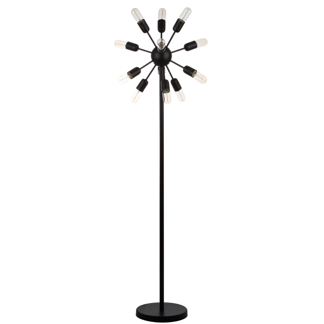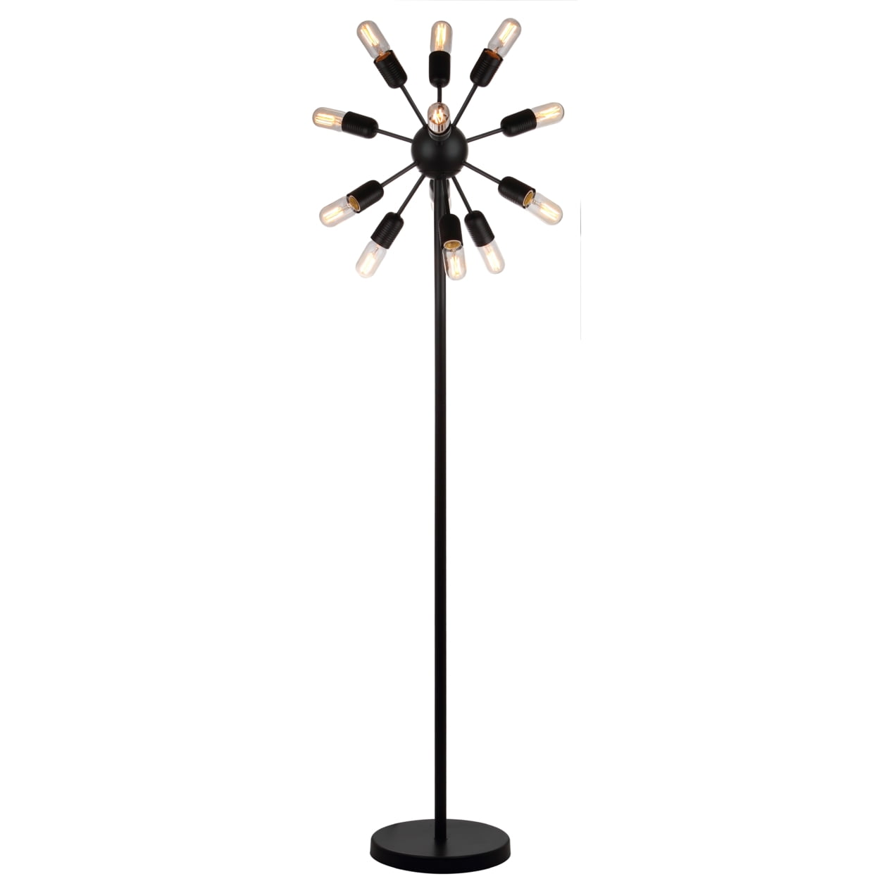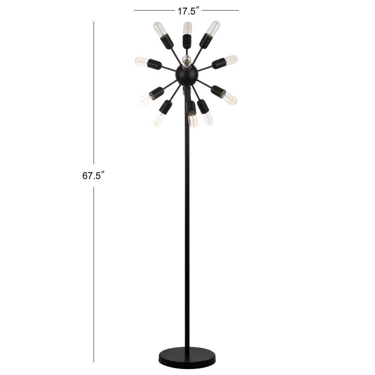 Contemporary design adds a chic look to your home Durable frame for long lasting longevity Easy to clean and maintain Minor assembly needed Color: Black Shade Color: None Item Dimensions: 17.5 in. W x 17.5 in. D x 67.5 in. H Crafted with Iron Cord Color: Black Cord Length: 72 in. Pendant Dimension: 72 in. Lamp Certification: UL Light Bulb Base Type: E26 Type of Bulb Included: E26 Edison Bulb 25W Max Wattage: Type “A” 25W or CFL 9W or LED 5W Lumen: 75 Quantity of Bulbs: 12 Accessories in life style photo(s) not included Please note: The images and product dimensions on our website are as accurate as possible. Due to differences in computer monitors, some item’s color may vary slightly. Before cleaning any lamp shade or fixture, disconnect the power source. Wipe with a soft, dry cloth. Avoid the use of chemicals and household cleaners as they may damage the finish.