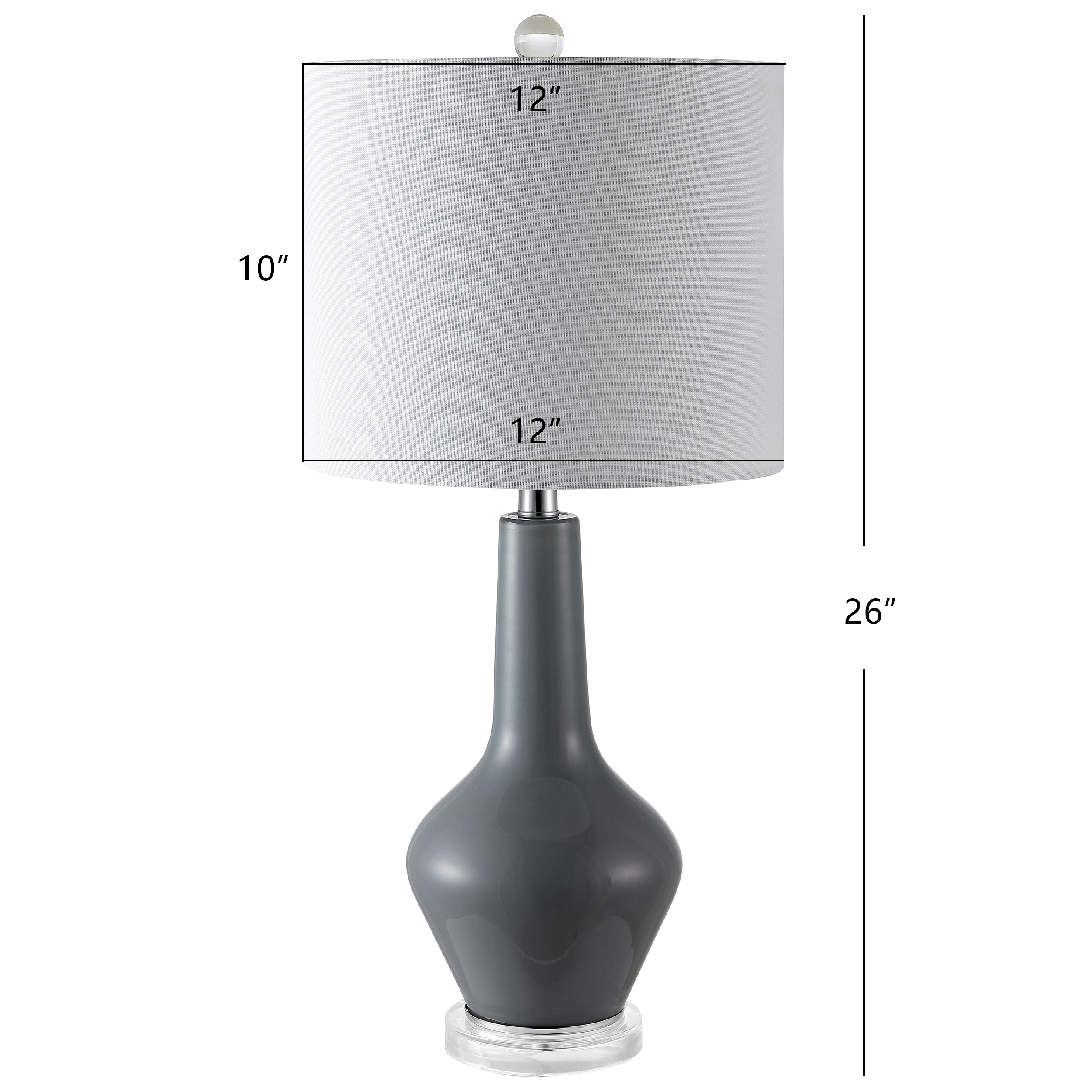 Contemporary design adds a chic look to your home Durable frame for long lasting longevity Easy to clean and maintain Minor assembly needed Color: Smoked Grey Glass Shade Color: White Item Dimension: 11 in. W x 11 in. D x 24 in. H Crafted with Glass/Acrylic Shade Material: 100% Cotton Shade Height: 10 in. H Shade Bottom Dimension: 12 in. W x 12 in. L Shade Top Dimensions: 12 in. W x 12 in. L Traditional Harp Style Harp Color: Silver Harp Height: 7.5 in. Cord Color: Clear Cord Length: 60 in. Lamp Body Dimension: 7 in. W x 7 in. D x 12.75 in. H Bottom Base Dimension: 5.125 in. W x 5.125 in. D x 1 in. H Lamp Certification: UL Light Bulb Base Type: E26 Screw Terminal Switch Mechanism: Rotary Switch Type of Bulb Included: LED A19 9W Max Wattage: TYPE “A” 60W OR CFL 13W OR LED 9W Lumen: 800 Quantity of Bulb(s): 2 Accessories in life style photo(s) not included Please note: The images and product dimensions on our website are as accurate as possible. Due to differences in computer monitors, some item’s color may vary slightly. Before cleaning any lamp shade or fixture, disconnect the power source. Wipe with a soft, dry cloth. Avoid the use of chemicals and household cleaners as they may damage the finish.