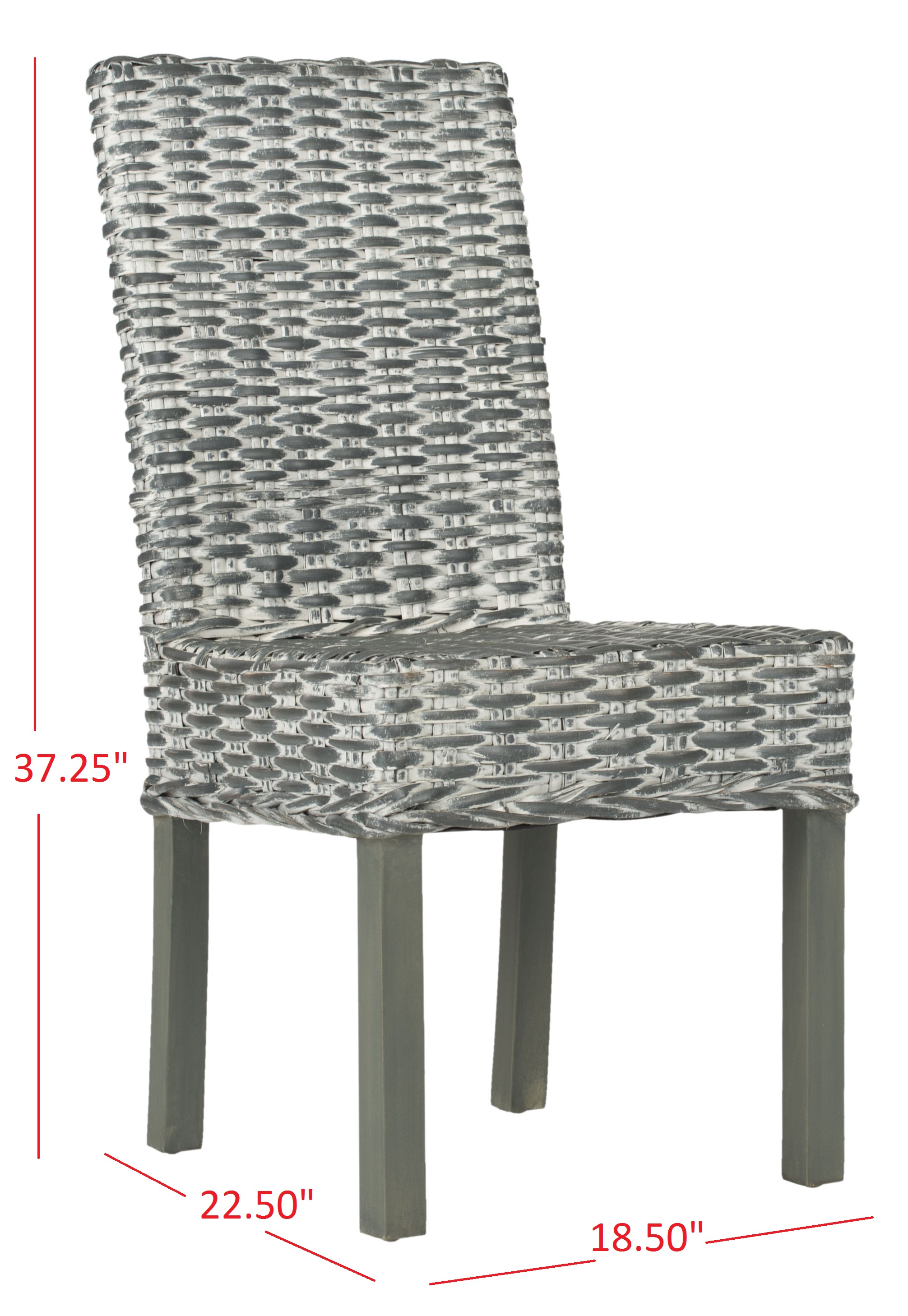 Durable wood frame for long lasting longevity No assembly needed Color: Grey White Washed Product Dimensions: 18.5 in. W x 23.5 in. D x 37.5 in. H Weight Capacity: 275 lbs Set of 2 Seat Dimensions: 18.5 in. W x 16 in. D x 18.5 in. H