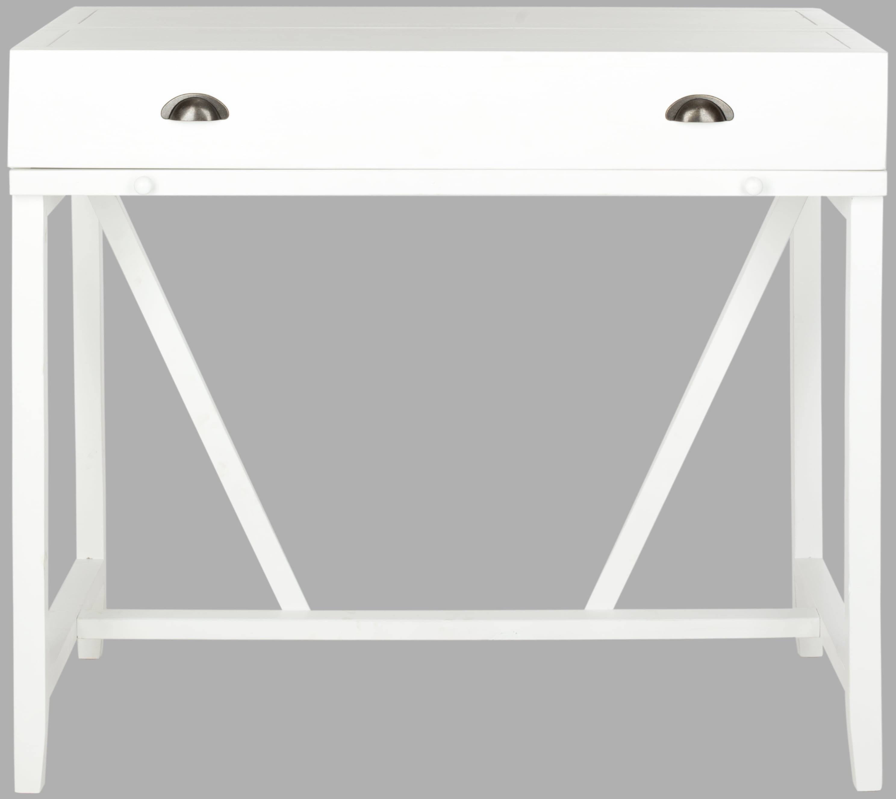 Contemporary design adds a chic look to your home Durable poplar wood frame for long lasting longevity Minor assembly needed Color: White Item Dimension: 40.2 in. W x 22 in. D x 36 in. H Drawer: 17.9 in. W x 10.6 in. D x 3 in. H Shelf: 38.4 in. W x 18.9 in. D Shelf Pulls Out 8.3 in. Height Of Writing Shelf: 29.20 in. Leg Height: 29.3 in. Item Weight: 52.9 lbs Weight Capacity: 40 lbs Wood is a natural material with variations of color shade, configuration, streaks, and grain structure. Each individual piece of Safavieh furniture has characteristic markings that will differ from photo and showroom samples. Regular attention and maintenance of fine furniture can ensure its beauty for years to come. Always use felt pads under all articles to prevent discoloration or softening of the lacquer. Plastic and rubber bases on items can discolor wood. Accessories in life style photo(s) not included Please note: The images and product dimensions on our website are as accurate as possible. Due to differences in computer monitors, some furniture colors may vary slightly. Lengths and widths may vary from the published dimensions. We do our best to provide you with an exact measurement, but please be advised that some variation exists. Dust regularly with a soft, dry cloth. Never use oiled or treated cloths on lacquered finishes. Some finishes can be wiped with a damp (not wet) cloth, followed at once by rubbing with a dry cloth to remove fingerprints and smudges. For persistent spots, gently clean with a soft cloth and a solution of water and mild soap, make sure to wipe dry. Use adhesive felt pads, coasters and placemats to protect your furniture.