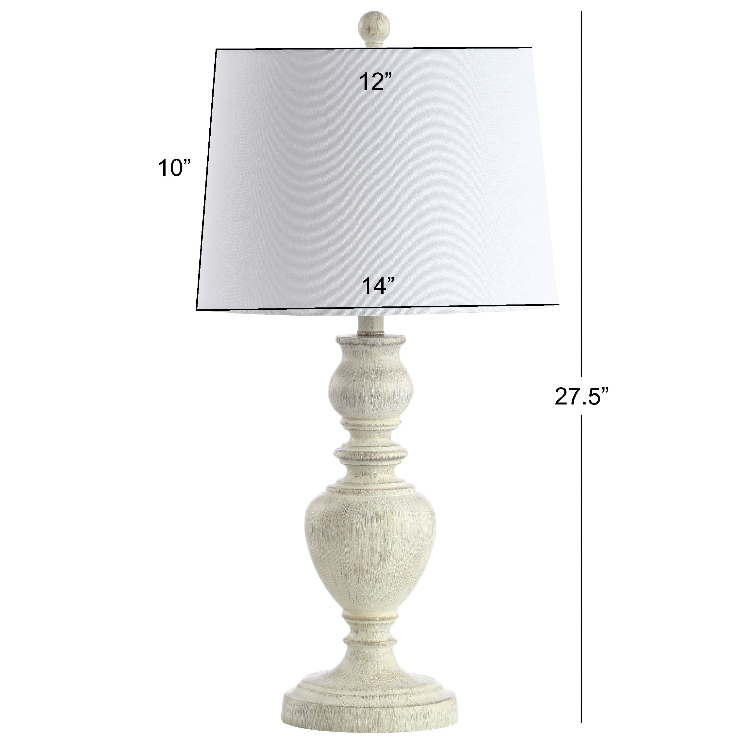 Contemporary design adds a chic look to your home Durable frame for long lasting longevity Easy to clean and maintain Minor assembly needed Color: White Wash Shade Color: Off-White Item Dimensions: 14 in. W x 14 in. D x 27.5 in. H Crafted with Polyresin Shade Material: 100% Cotton Shade Height: 10 in. H Shade Bottom Dimensions: 14 in. L x 14 in. W Shade Top Dimensions: 12 in. W x 12 in. L Traditional Harp Style Harp Color: Silver Harp Height: 7.5 in. H Cord Color: Light Grey Cord Length: 60 in. Lamp Body Dimensions: 7 in. W x 7 in. D x 15 in. H Pendant Dimension: 60 in. Lamp Certification: UL Light Bulb Base Type: E26 Switch Mechanism: Rotary Switch Type of Bulb Included: LED A19 9W Max Wattage: Type “A” 100W or CFL 23W or LED 12W Lumen: 800 Quantity of Bulbs: 1 Accessories in life style photo(s) not included Please note: The images and product dimensions on our website are as accurate as possible. Due to differences in computer monitors, some item’s color may vary slightly. Before cleaning any lamp shade or fixture, disconnect the power source. Wipe with a soft, dry cloth. Avoid the use of chemicals and household cleaners as they may damage the finish.