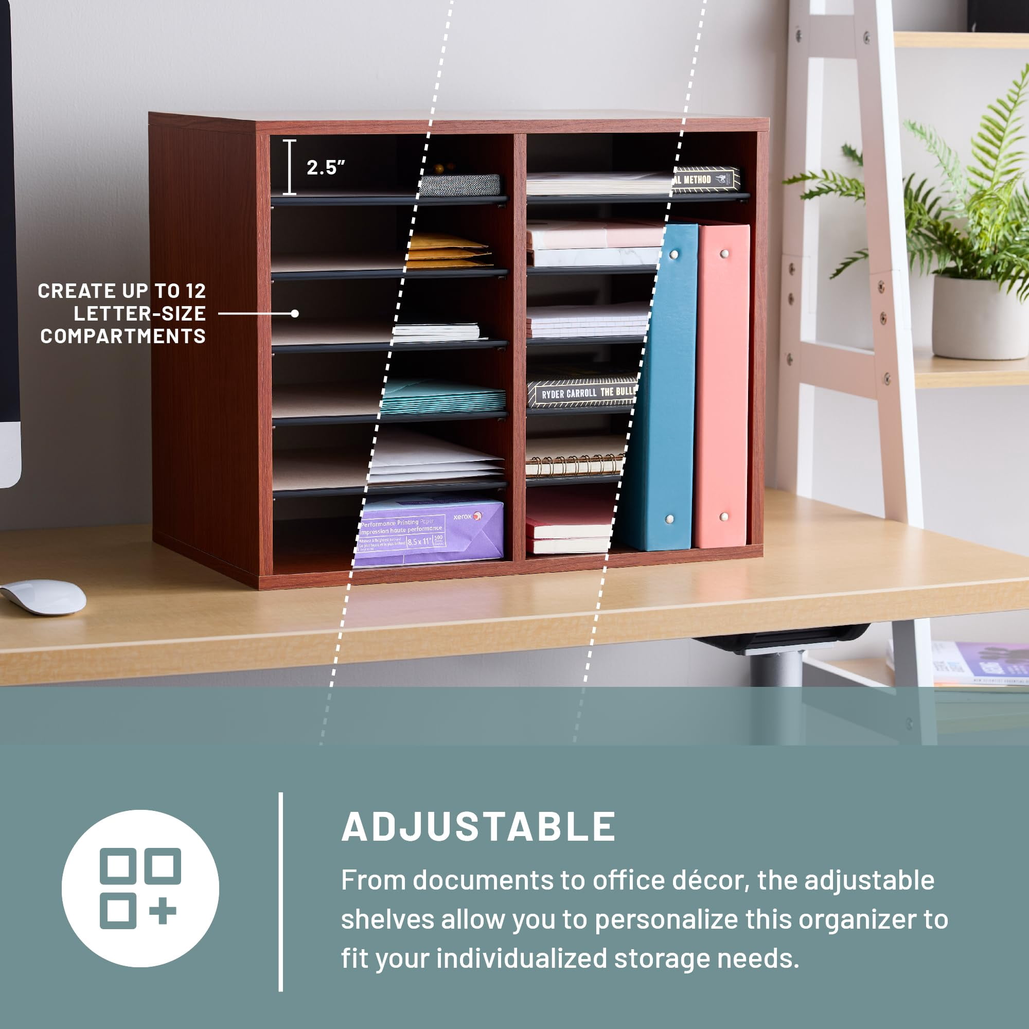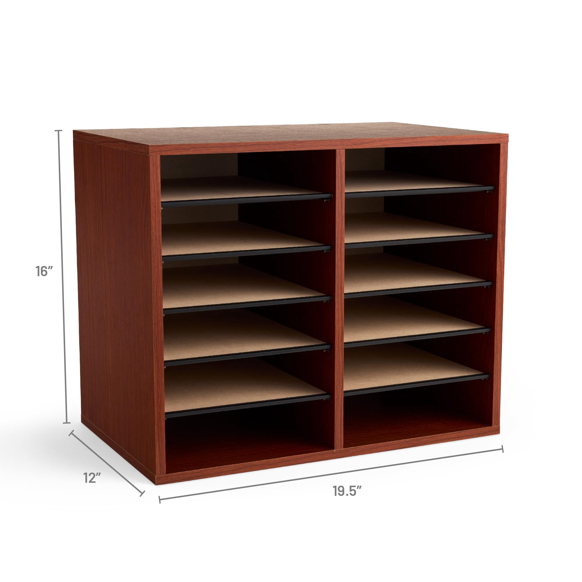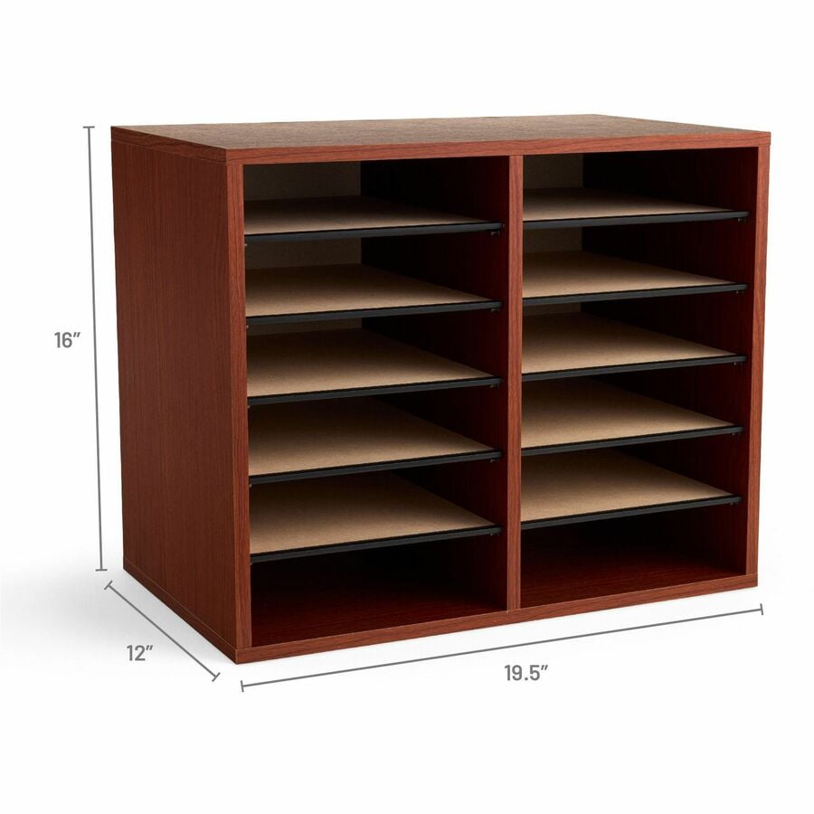 Safco’s Wood Adjustable Literature Organizer is a literature storage organizer with 10 hardboard shelves that form up to 12 letter-size compartments. The shelves are adjustable and removable. Built from compressed wood with laminate finish and solid fiberboard back. Features: Finish: Gray Material: Steel Desk organizer 10 hardboard shelves form up to 12 letter-size compartments Adjustable or removable shelves Compressed wood with laminate finish and solid fiberboard back Specifications: Product Dimensions: 16″ H x 19.5″ W x 12″ D Product Weight: 15 lbs