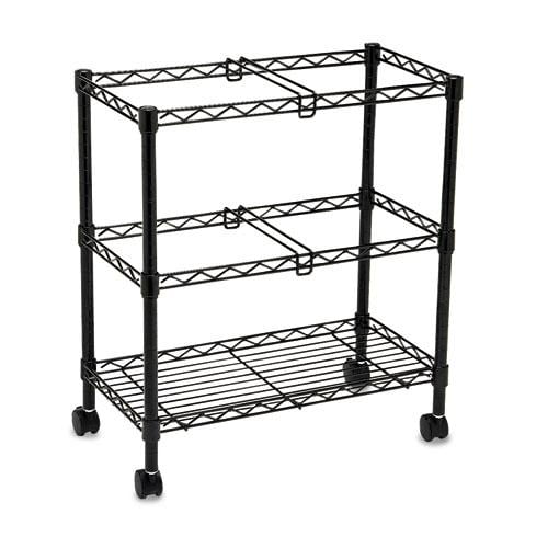Commercial-grade quality file storage cart Two full tiers of filing space Steel wire construction with scratch-resistant black powder coat finish Accommodates letter and legal-size folders Letter-size files can be placed in two rows front to back or one, lengthwise row Mobile cart on four swivel wheels (two locking) Upright rods, 1″ diameter. Horizontal support rails, ¼” diameter. 15 Internal shelf rods per shelf, 1.6″ diameter Double ribbed plastic clips for extra support and secure positioning