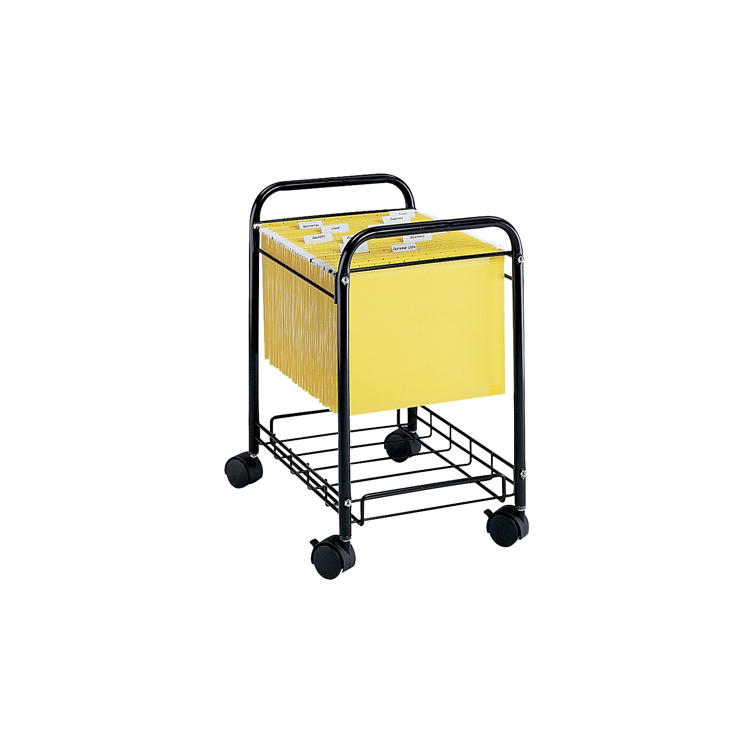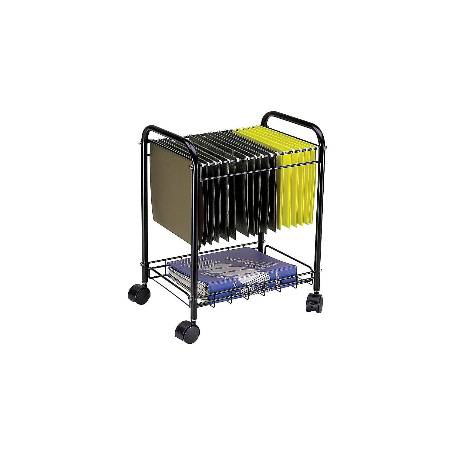 Desk side hanging folder file mobile cart; Accommodates letter or legal-size folders (folders not included); 3/4″ tubular steel frame with wire file supports; Bottom storage shelf with lip; Tubular steel frame with durable powder coat finish, mobile on four swivel casters, two locking