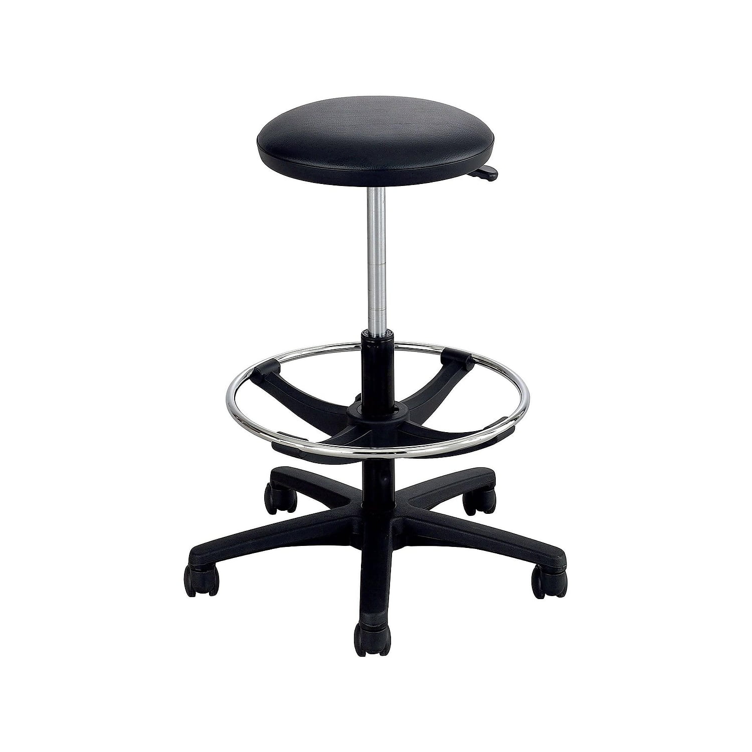 The Extended-Height Lab Stool is a backless lab stool that pairs well with any drafting table, work bench or other standing-height work surface. Pneumatic height adjustment allows the user to customize it to their height and the height of their working area from 22-32″H. The stool also includes an 18″ chrome foot ring that wraps all the way around for access from any seated position. The footrest is adjustable to suit the needs of the individual user, and use of it may help to support muscular relaxation and less restricted blood circulation. The seat rotates a full 360 degrees in either direction for enhanced user mobility and a more active seating experience. It also comes with an upholstered vinyl seat that can be easily cleaned, making it great for industrial or hospitality settings. The stool’s base incldues five-star hooded casters (wheels) that allow the user to roll from one area to another without standing, or provide easy mobility across work areas. Rated up to 250 lbs. Features: Finish: Black Seat height range: 22-32″ H Extended-height, adjustable, backless lab stool with upholstered vinyl seat; Pair with a drafting table, work bench or other standing height work surface Pneumatic seat height adjustment allows user to raise and lower seat to suit different workstations and activities; Make adjustments manually by lifting lever under seat Adjustable-height, 18″ chrome foot ring prevents feet from swinging and wraps around the stool for access from any seated position; Raising legs and feet onto the footring may support muscular relaxation & less restricted blood circulation Stool rotates full, 360-degrees in either direction for enhanced user mobility and a more active seating experience Black five-star hooded caster base with dual wheel casters allows user to roll form one work area to another without standing Assembly required Product meets or exceeds ANSI/ BIFMA office furniture safety and performance standards Specifications: Product Dimensions: 32″ H x 18″ W x 18″ D Product Weight: 14 lbs Weight Capacity: 250 lbs. Seat Dimensions: Seat Diameter 13.5″