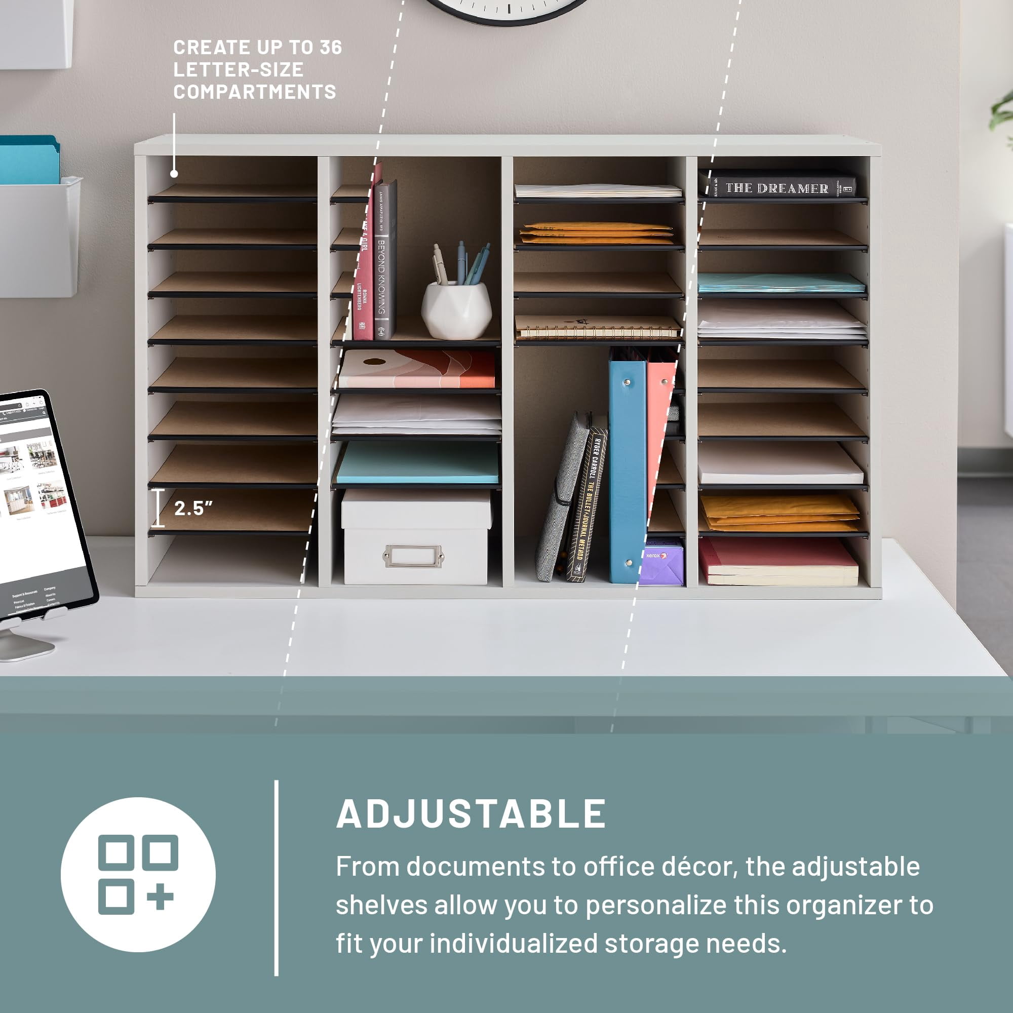 Tools Required: Yes Compartment Capacity: 15 lbs. Compartment Quantity: 36 Compartment Adjustability: 2 1/2″ increments Compartment Size: 9″w x 11 3/4″d x 2 1/2″h Material Thickness: 5/8″ Paint / Finish: Laminate Shelf Quantity: 32 Stackable: Yes, 3 high/up to 72 compartments Material(s): Corrugated Fiberboard (back), Furniture Grade Particleboard, Solid Fiberboard (back), Hardboard (shelves) Fits Paper Size(s): Letter Assembly Required: Yes Color: Grey Finished Product Dimensions: 39 1/4″w x 11 3/4″d x 24″h Finished Product Weight: 45 lbs.