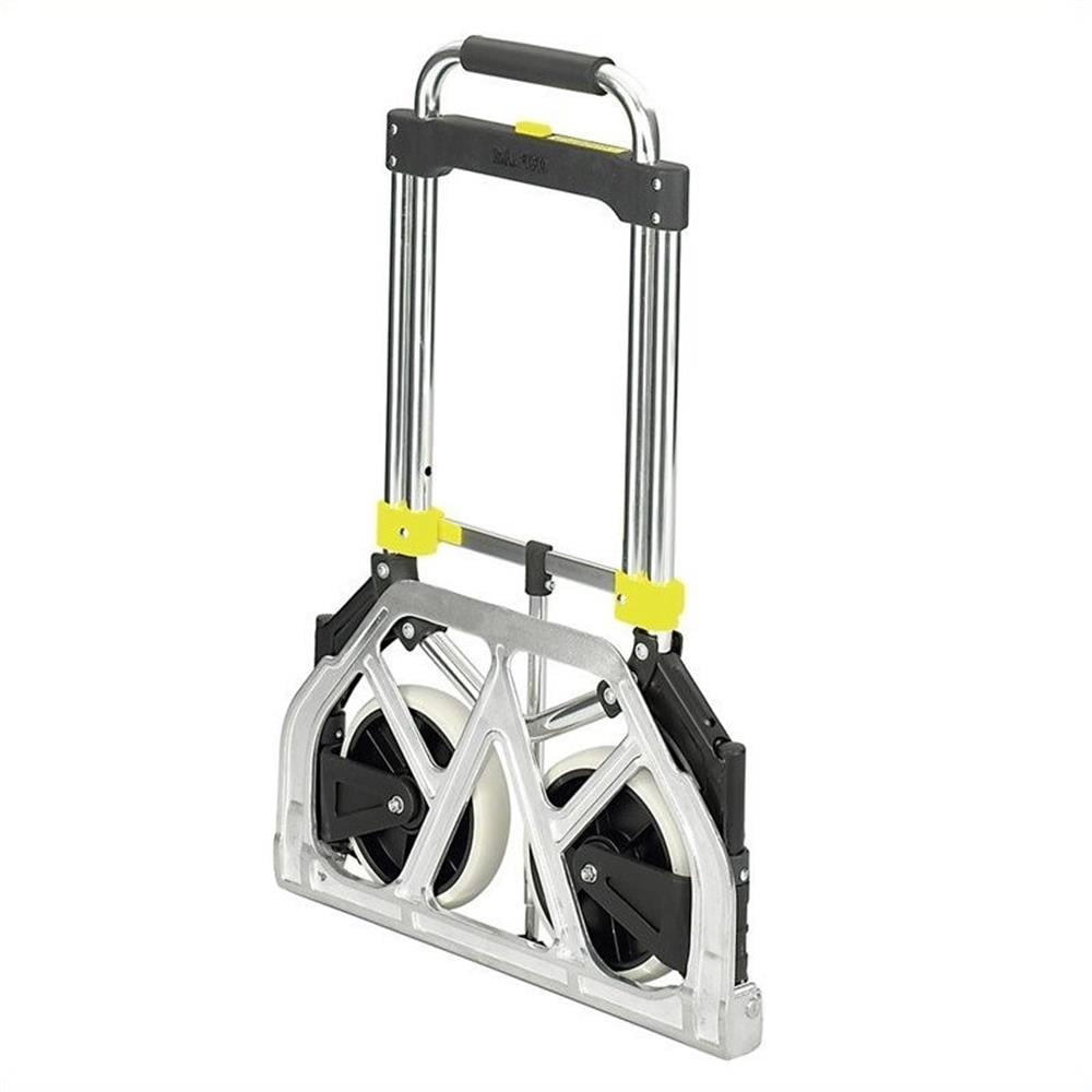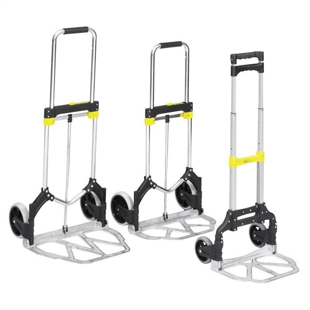 Safco, SAF4062, Stow-Away Medium Hand Truck, 1 Each, Silver: Features a telescoping handle and fold-up toe plate for compact storage Lightweight frame with 19″ x 11″ toe plate and 2 retractable wheels with 7″ diameter, solid rubber tires for smooth movement Collapsed hand truck measures 19.5″W x 2.75″D x 28.75″H Lightweight aluminum hand truck with 275 lbs capacity can carry a variety of items Ideal for sales staff, travelers and small offices Fits in small spaces when not in use Contoured handle on top for a comfortable grip