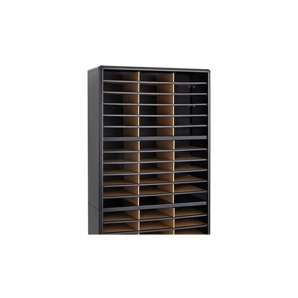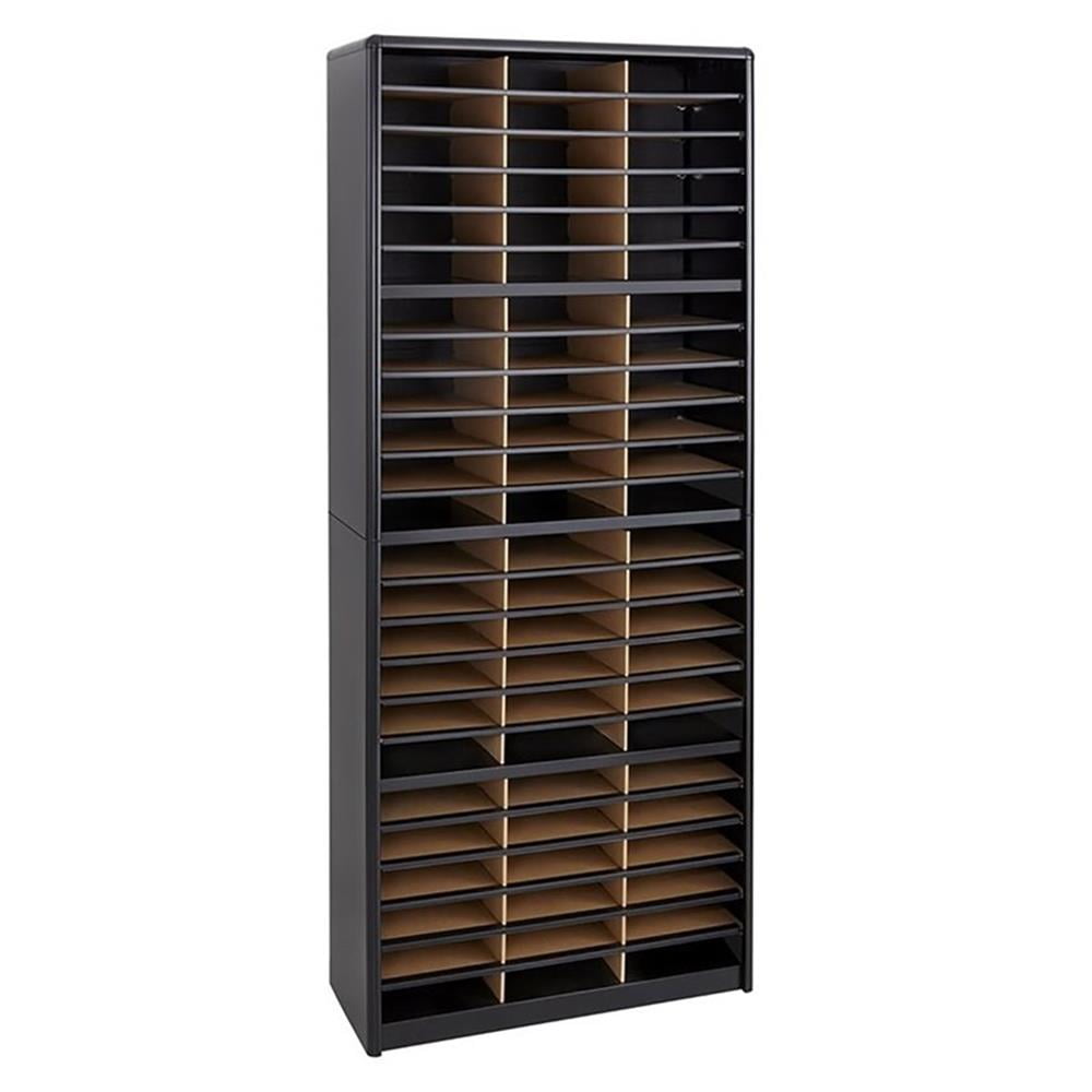 There is always value in organizing! To organize effectively you need the right tools for the right space. The Value Sorter will improve neatness and is a great addition to any mailroom, office, school, or store. Use compartments as a mailbox, material holder, or stationary sorter. The steel shell complete with support shelves and a solid fiberboard back ensure stability and durability. Compartments are formed with heavy-duty corrugated fiberboard. Unit has oversized compartments that comfortably hold up to 550 sheets of letter-size paper. Compartments are wide enough to easily accommodate letter-size file folders. Wide shelf fronts have built-in label holders (labels included). Features: Tools Required: Yes Capacity – Sheet: 550 Compartment Capacity: 5 lbs. Compartment Quantity: 72 Compartment Size: 9 3/4″w x 12 1/2″d x 2 1/2″h Fits Folder Size(s): Letter Paint / Finish: Baked Enamel Material(s): Steel (shell, support shelves), Corrugated Fiberboard (shelves) Fits Paper Size(s): Letter Assembly Required: Yes Color: Black Finished Product Dimensions: 32 1/4″w x 13 1/2″d x 75″h Finished Product Weight: 59 lbs.