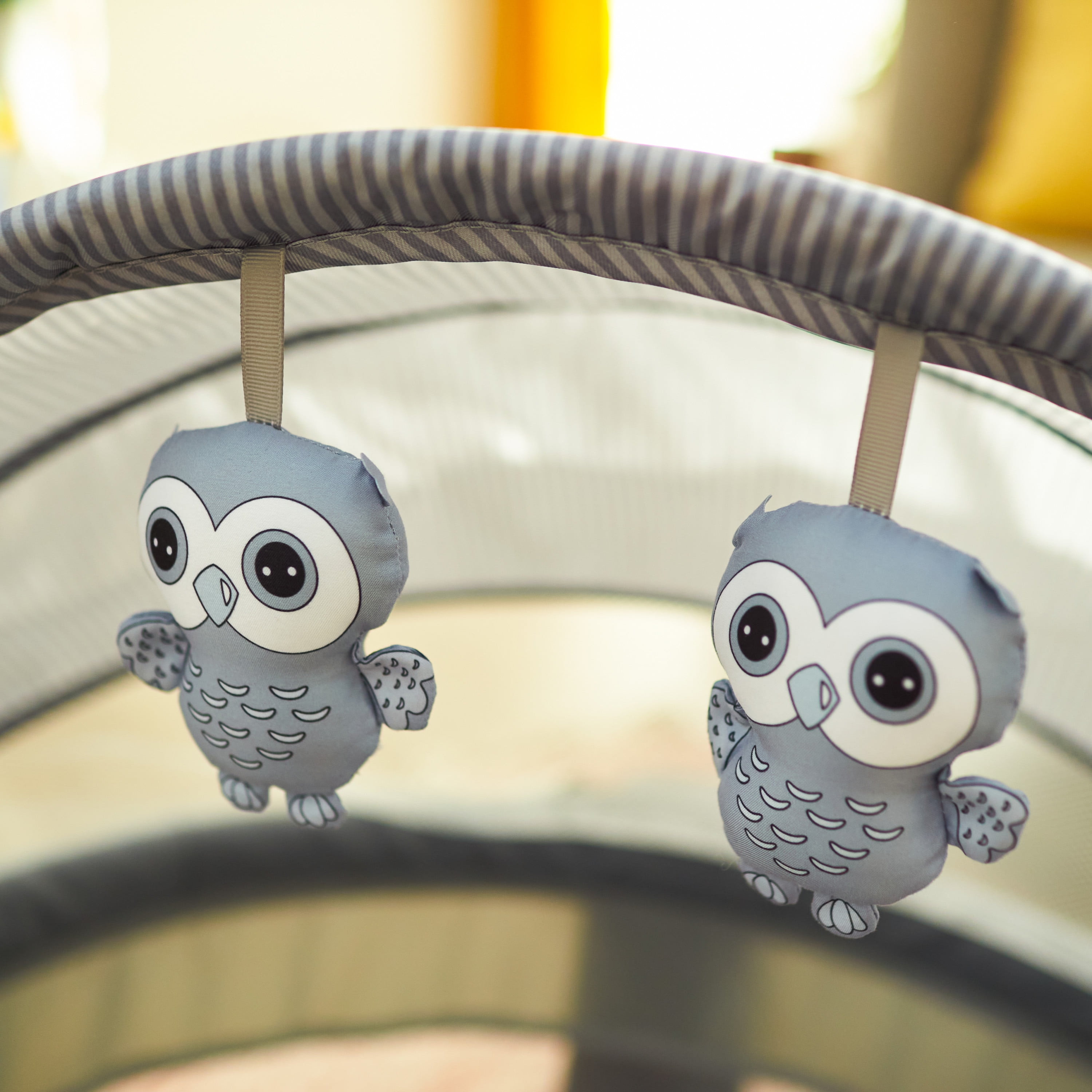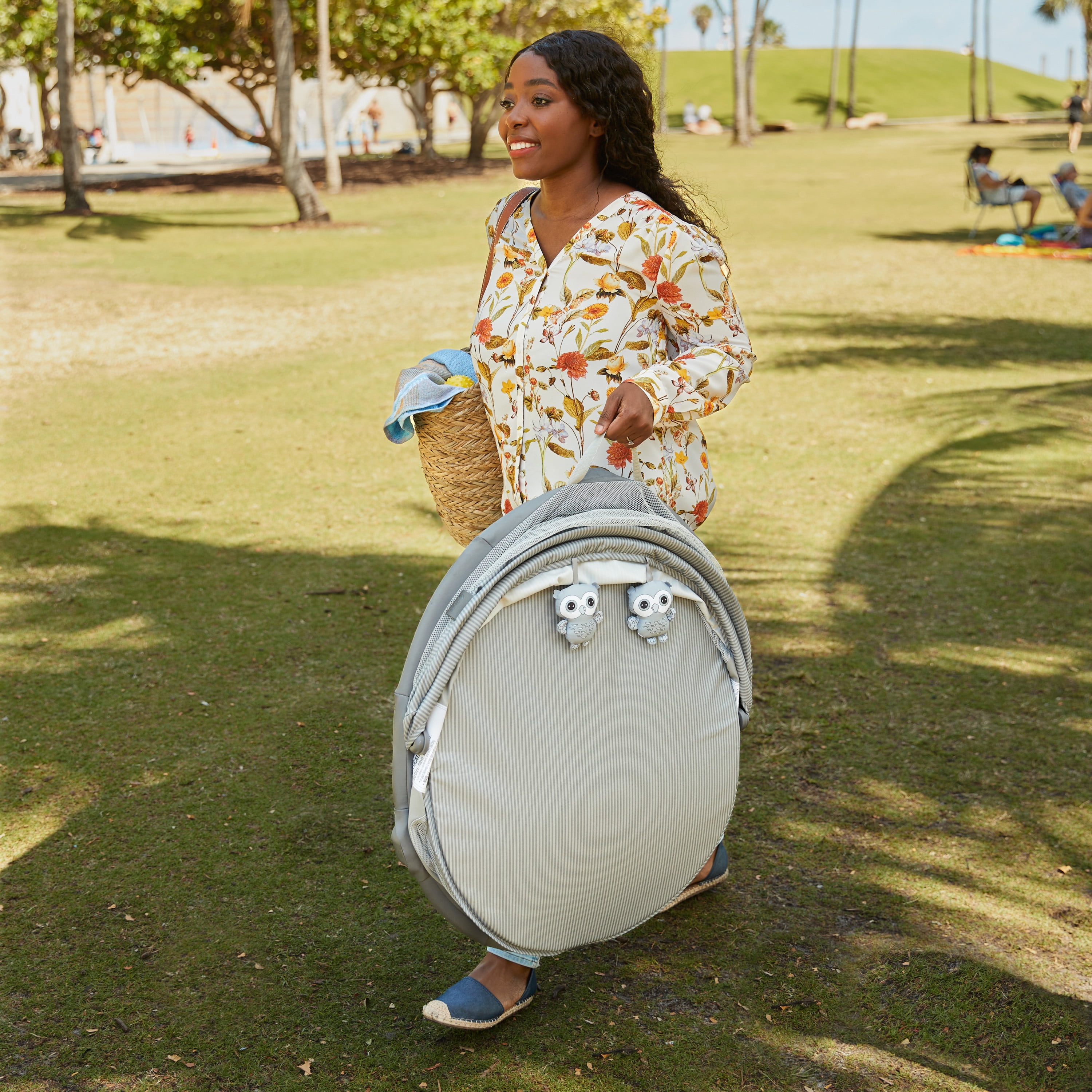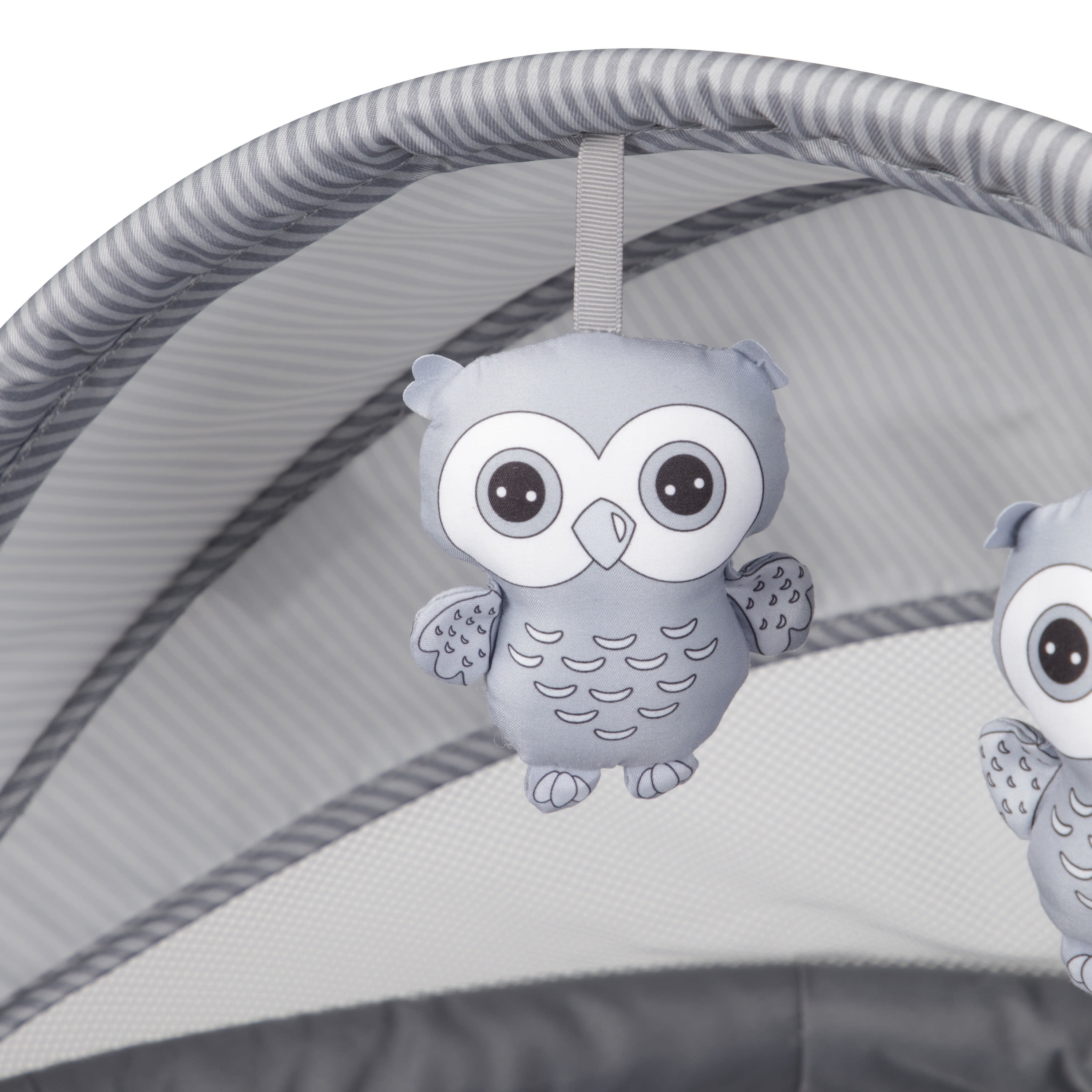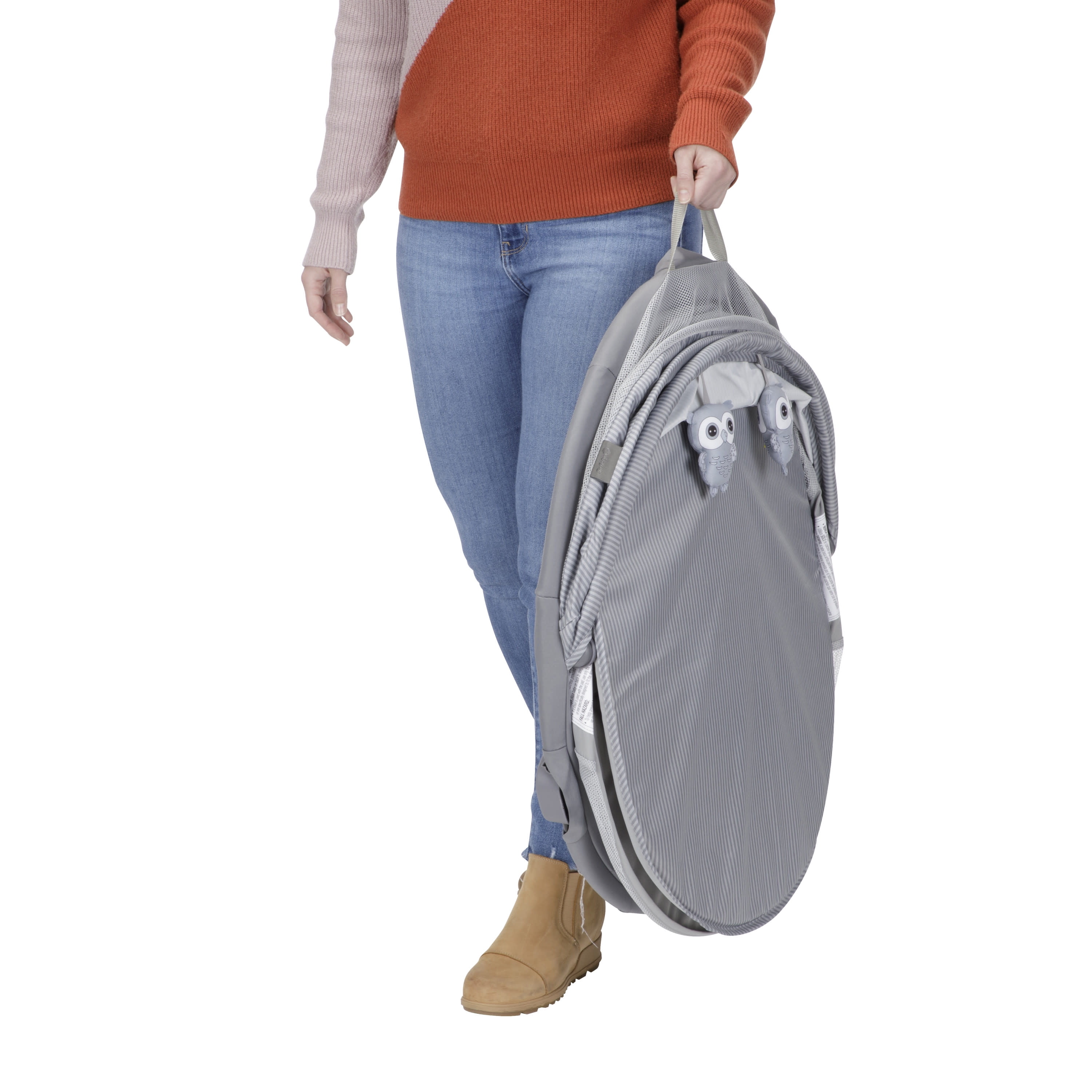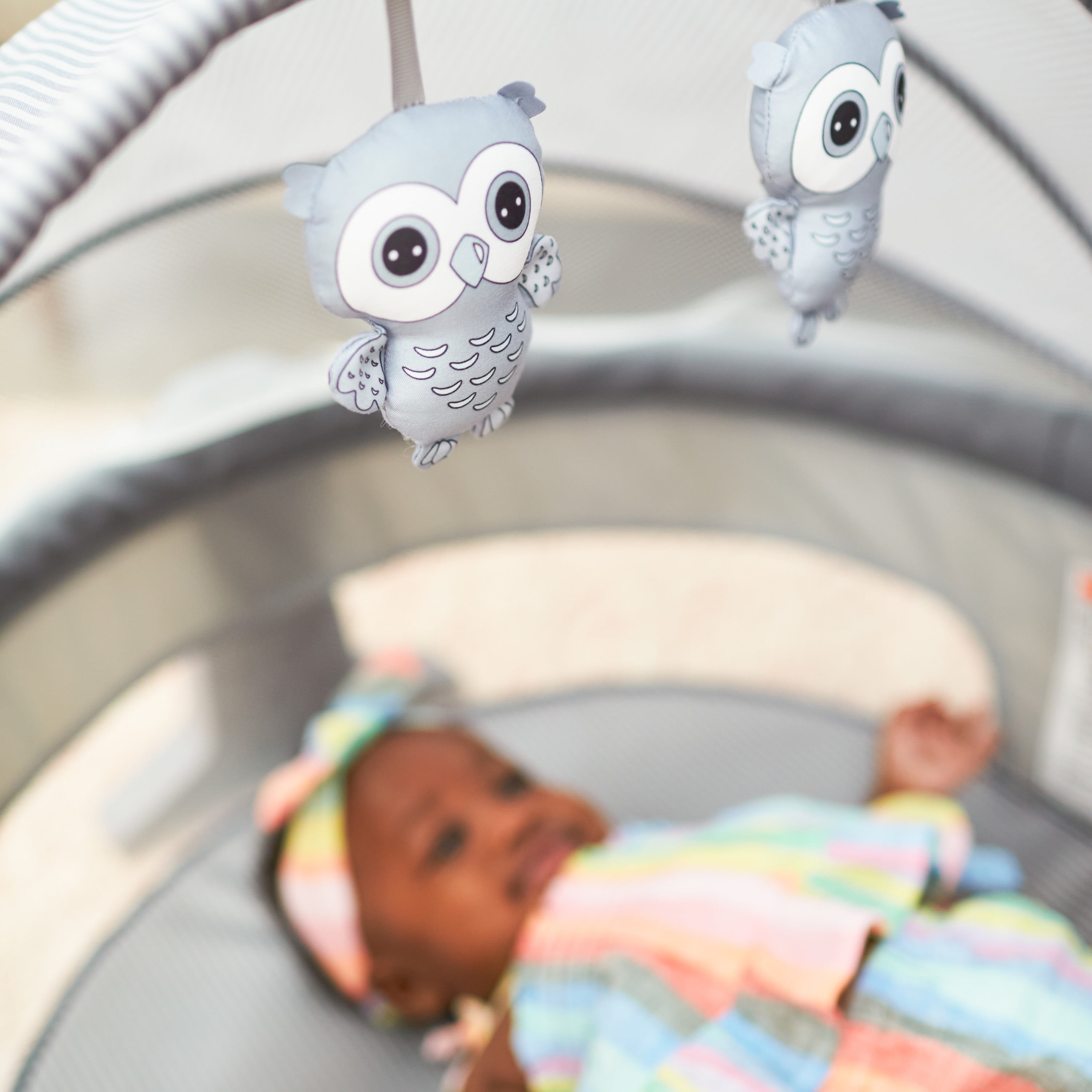 Foldable legs for stability Portable—great for travel and outdoors Semi canopy for breathability and coverage Comfortable mattress pad Plush hanging toys for entertaining infants Easy-to-remove mattress pad and spot clean with a damp cloth Fits babies up to 20 lbs. Designed with a firm, flat sleeping surface that meets the Consumer Product Safety Commission’s recommendations for safe sleep Color: Dreamscape Assembled dimensions: 9.46 x 24.03 x 29.76 Assembled weight: 7.94 lb