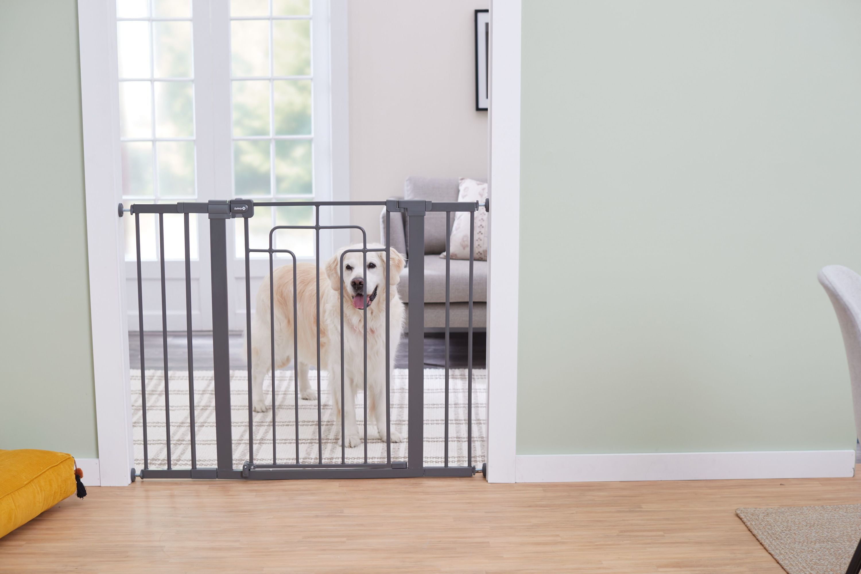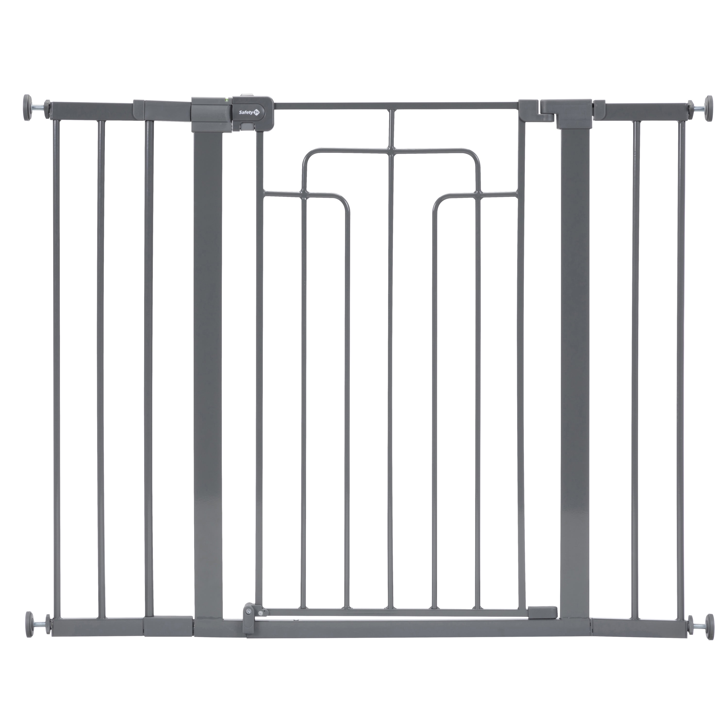 Safety 1ˢᵗ Contemporary Tall-and-Wide Gate, Grey Modern design and color blend with your home décor Quick and easy to install with just one screw Fits most doorways and works between rooms or at the bottom of the stairs Perfect for children 6–24 months Great for pets too 29”–47” wide 36” tall Features SecureTech®, Safety 1st’s red-to-green indicator on the top rail that allows you to see when your gate is securely locked Note: When the gate is uninstalled, the frame may appear bent. This is normal. The frame is constructed in this manner to provide pressure to remain in place when installed properly.