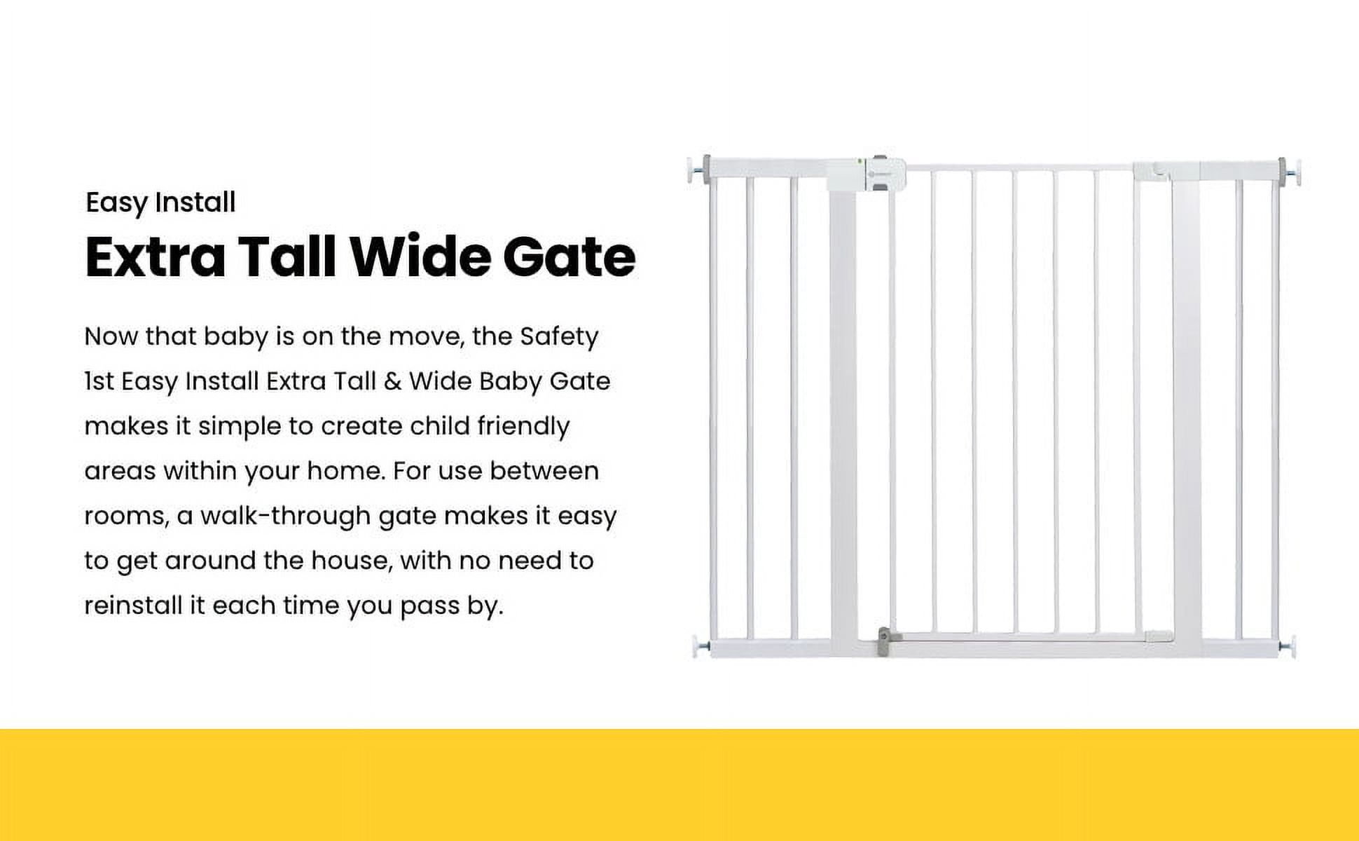 Now that baby is on the move, the Safety 1st Easy Install Tall & Wide Baby Gate makes it simple to create child friendly areas within your home. For use between rooms, this walk-through baby gate makes it easy to get around the house without the need to reinstall it each time you pass by. This gate features SecureTech®, our red-to-green indicator on the top rail that allows you to see when your gate is securely locked. Pressure-installed gates are a great way to provide flexibility while using them throughout your home. Wall cups stay installed to the wall while the gate can easily be removed for the times it isn’t needed. An extra-wide gate lets you easily block off the larger throughways in your home. The gate is 36” high and can be adjusted from 29”–47” for doorways of varying widths throughout your home.The Safety 1st Easy Install Tall & Wide gate isn’t just for kids either. It comes in handy when you’re trying to keep pets out of certain rooms as well.