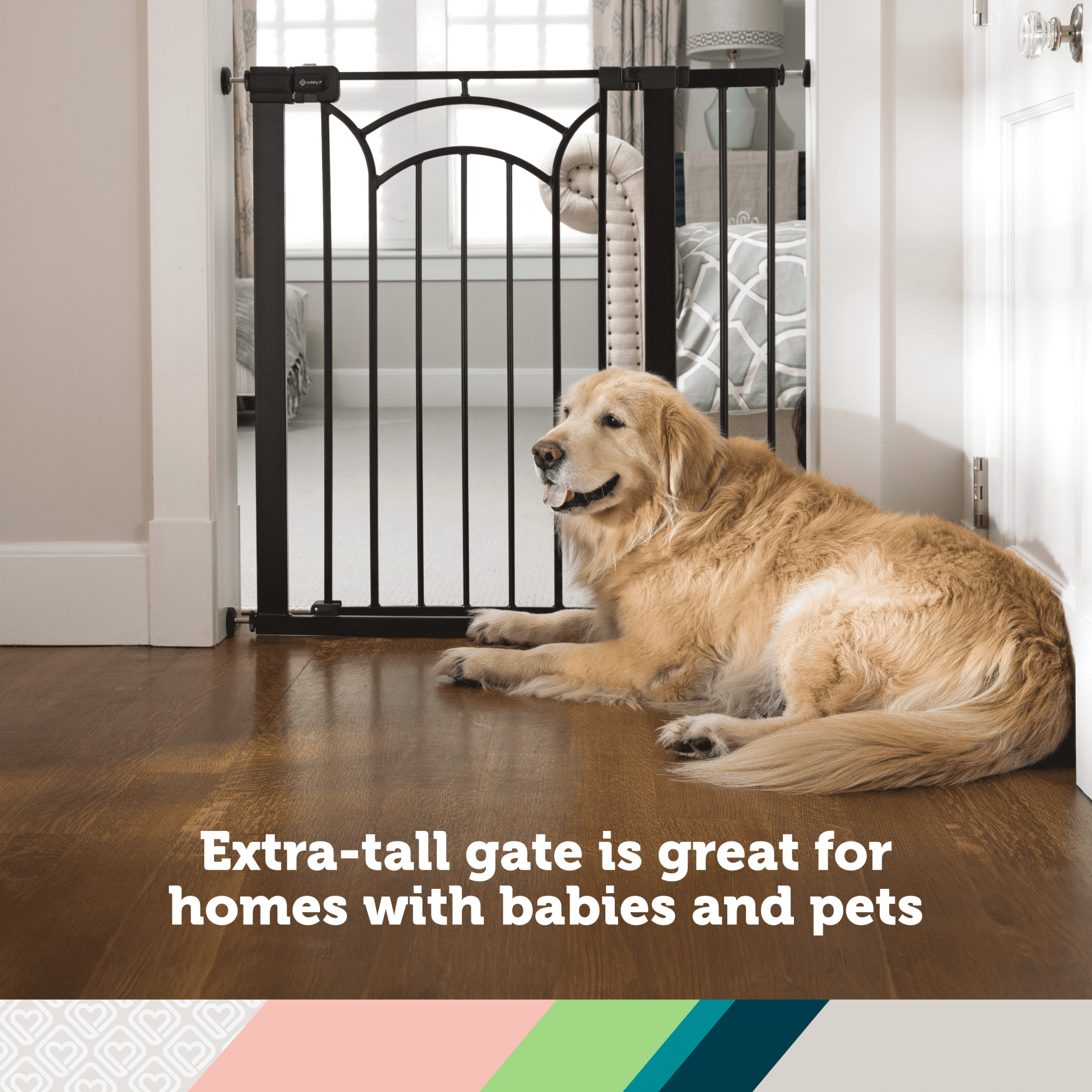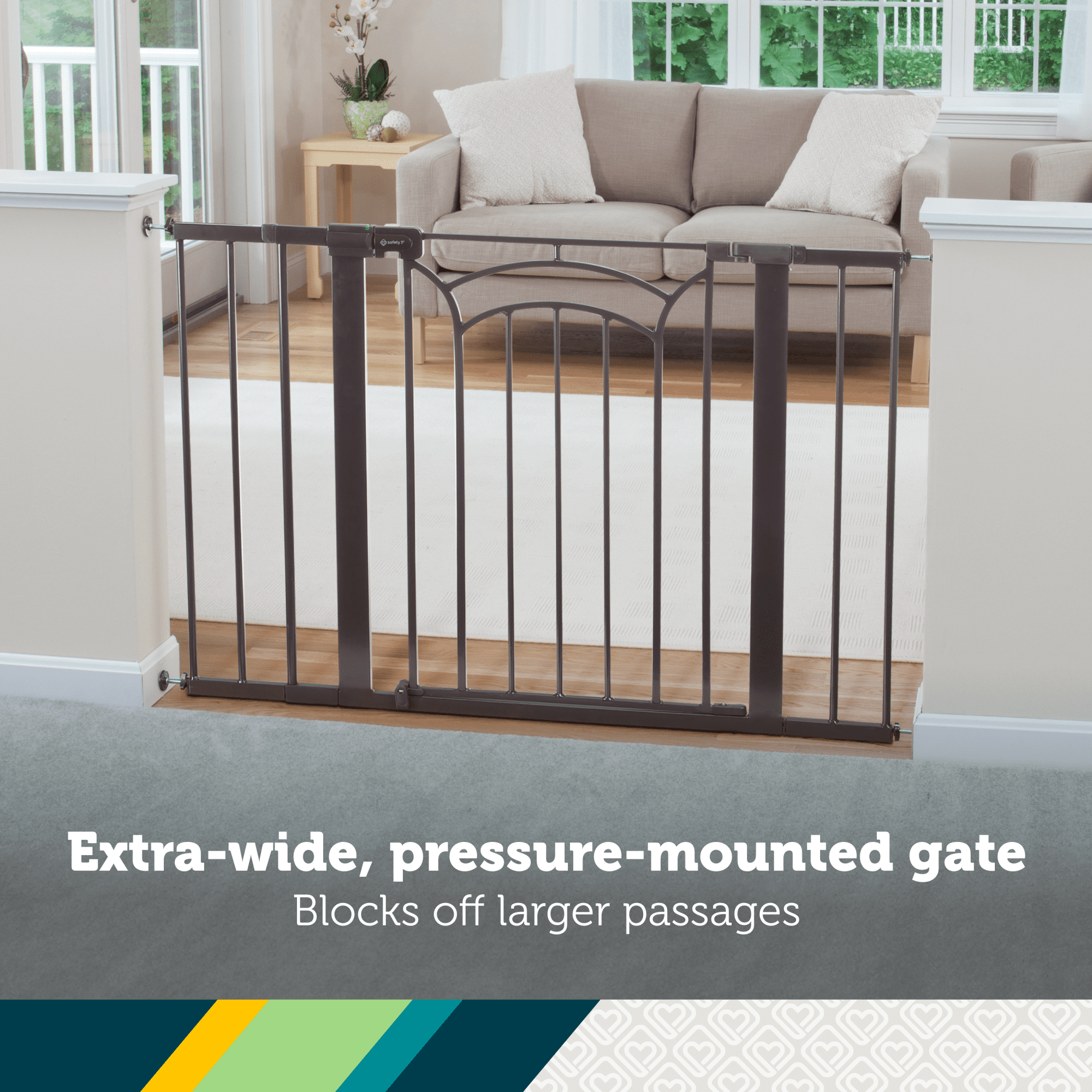 Now that baby is on the move, the Safety 1st Easy Install Décor Tall & Wide Gate makes it simple to create child friendly areas within your home and has a modern finish that blends in seamlessly with your home décor. For use between rooms, a walk-through gate makes it easy to get around the house, with no need to reinstall it each time you pass by. This gate features SecureTech®, our red-to-green indicator on the top rail that allows you to see when your gate is securely locked. Pressure-installed gates provide flexibility in usage around the home. Wall cups stay installed to the wall while the gate can easily be removed for periods of non-use. An extra-wide gate lets you easily block off the larger throughways in your home. The gate is 36 inches high and can be adjusted from 29 to 47 inches. The Safety 1st Easy Install Decor Tall & Wide Gate’s design provides additional height protection that isn’t just great for kids. It comes in handy when you’re trying to keep pets out of certain rooms as well.