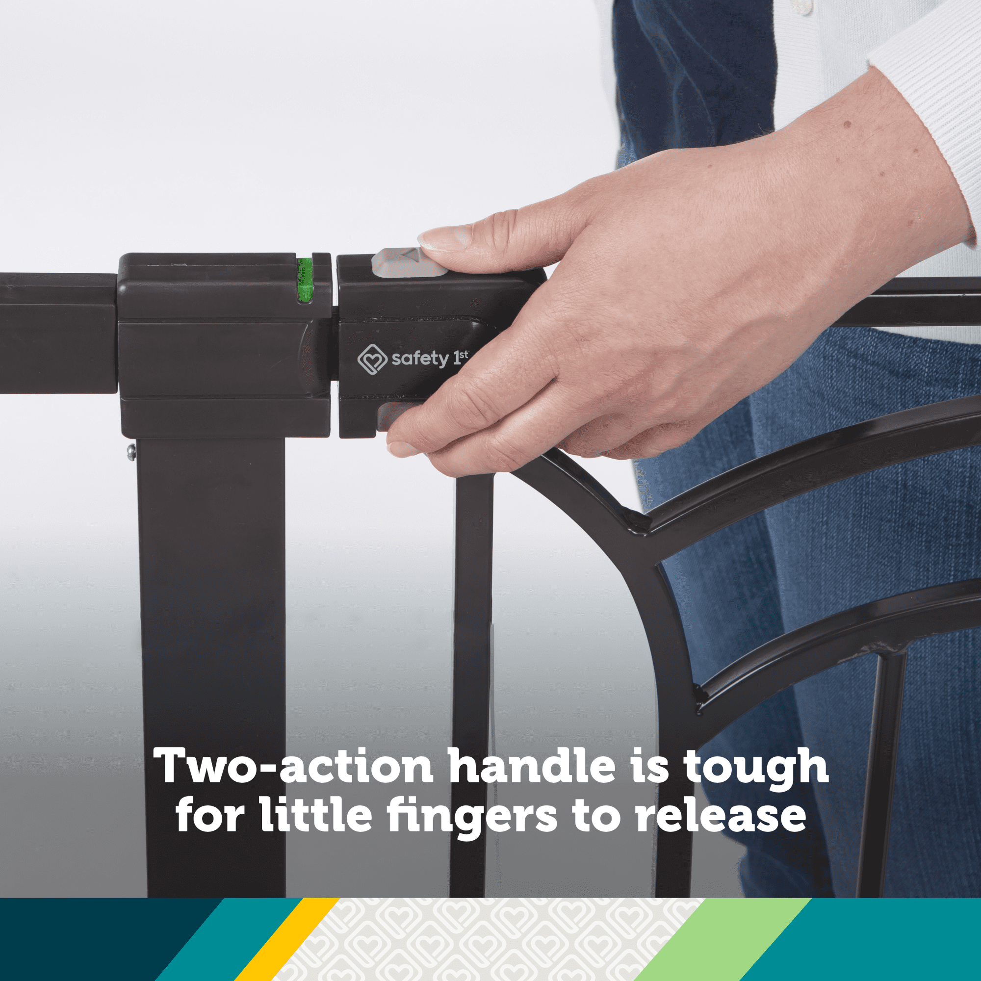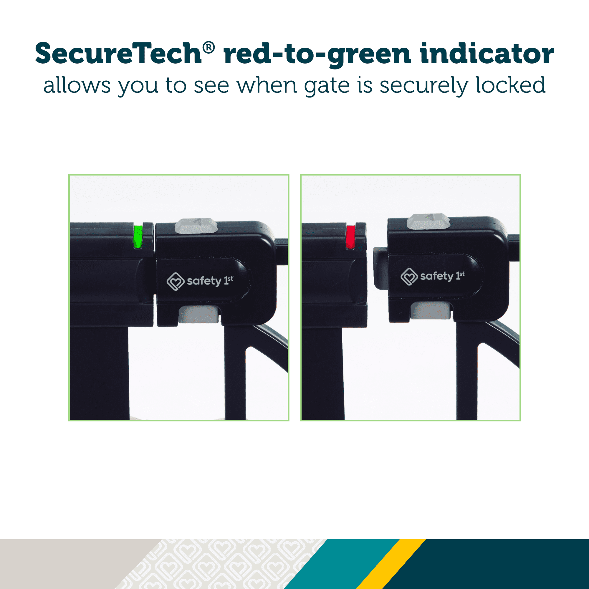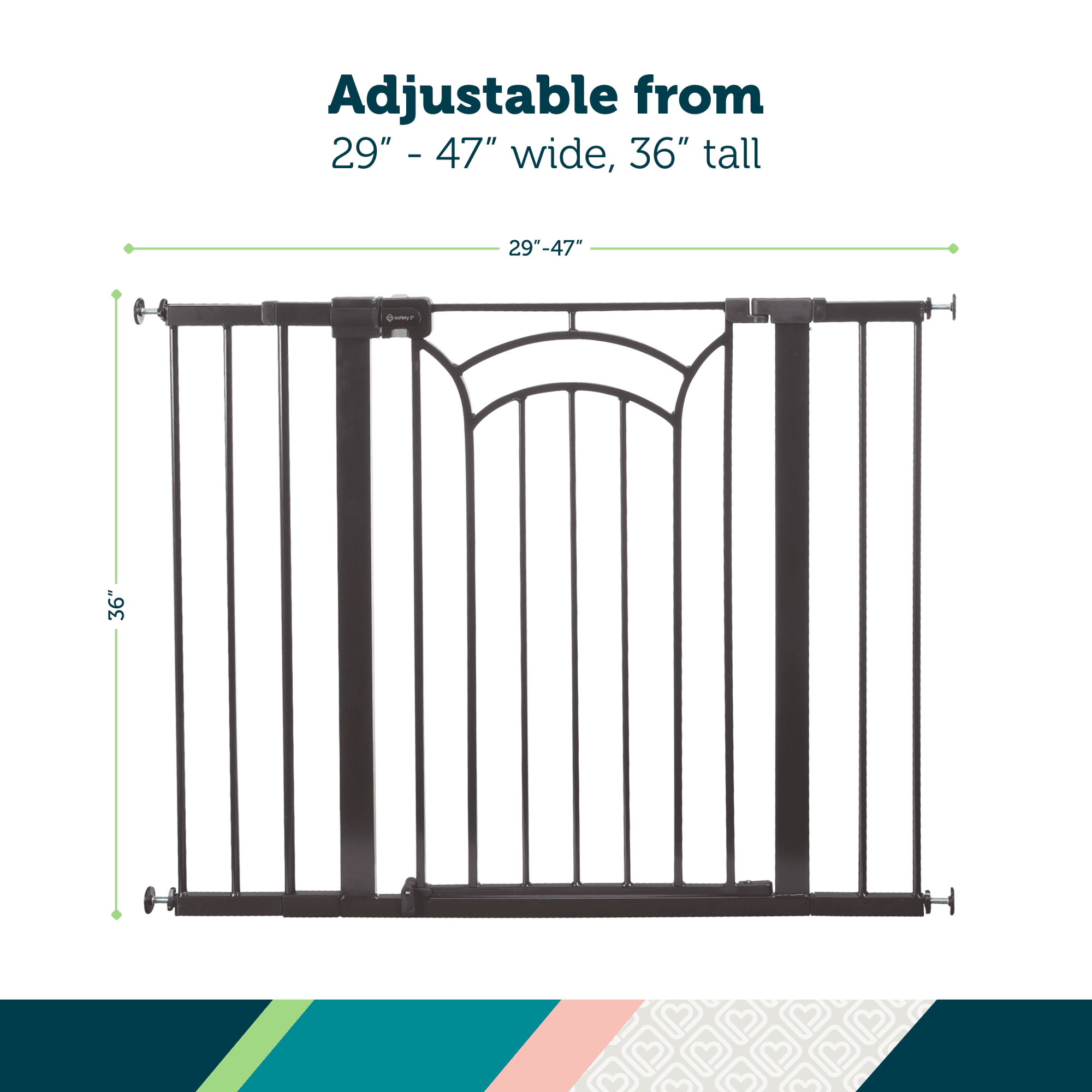 SecureTech®, Safety 1st’s red-to-green indicator on the top rail allows you to see when your gate is securely locked Pressure-installed gate is quick to set up and easy to take down when not in use The two-action handle is tough for little fingers to release TO PREVENT FALLS, NEVER use pressure-installed gate at top of stairs Fits most doorways and works between rooms or at the bottom of the stairs Includes four wall cups. Must install with wall cups to keep gate in place 29”– 47” wide 36” high JPMA certified and meets CPSC requirements Perfect for children 6-24 months and great for pets too