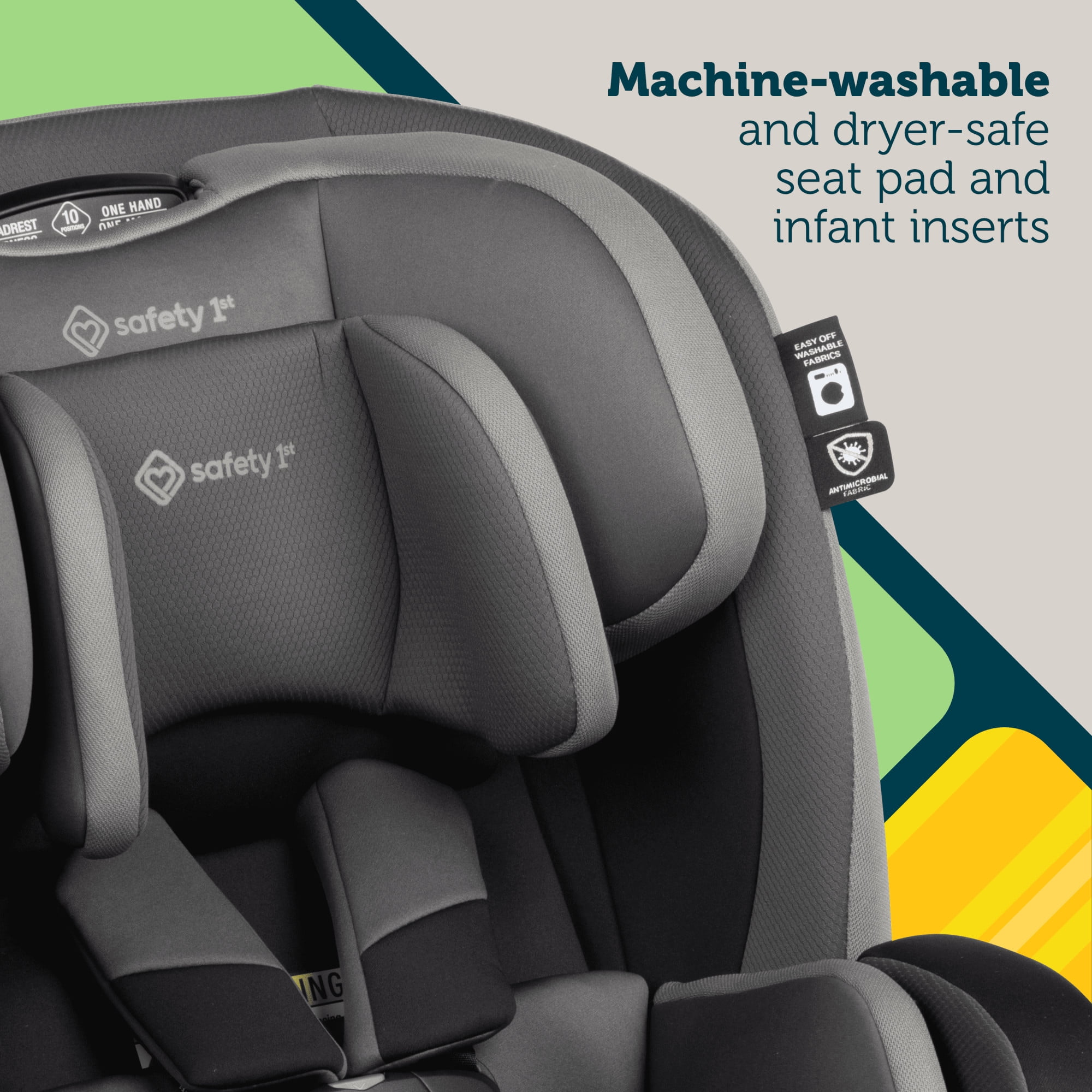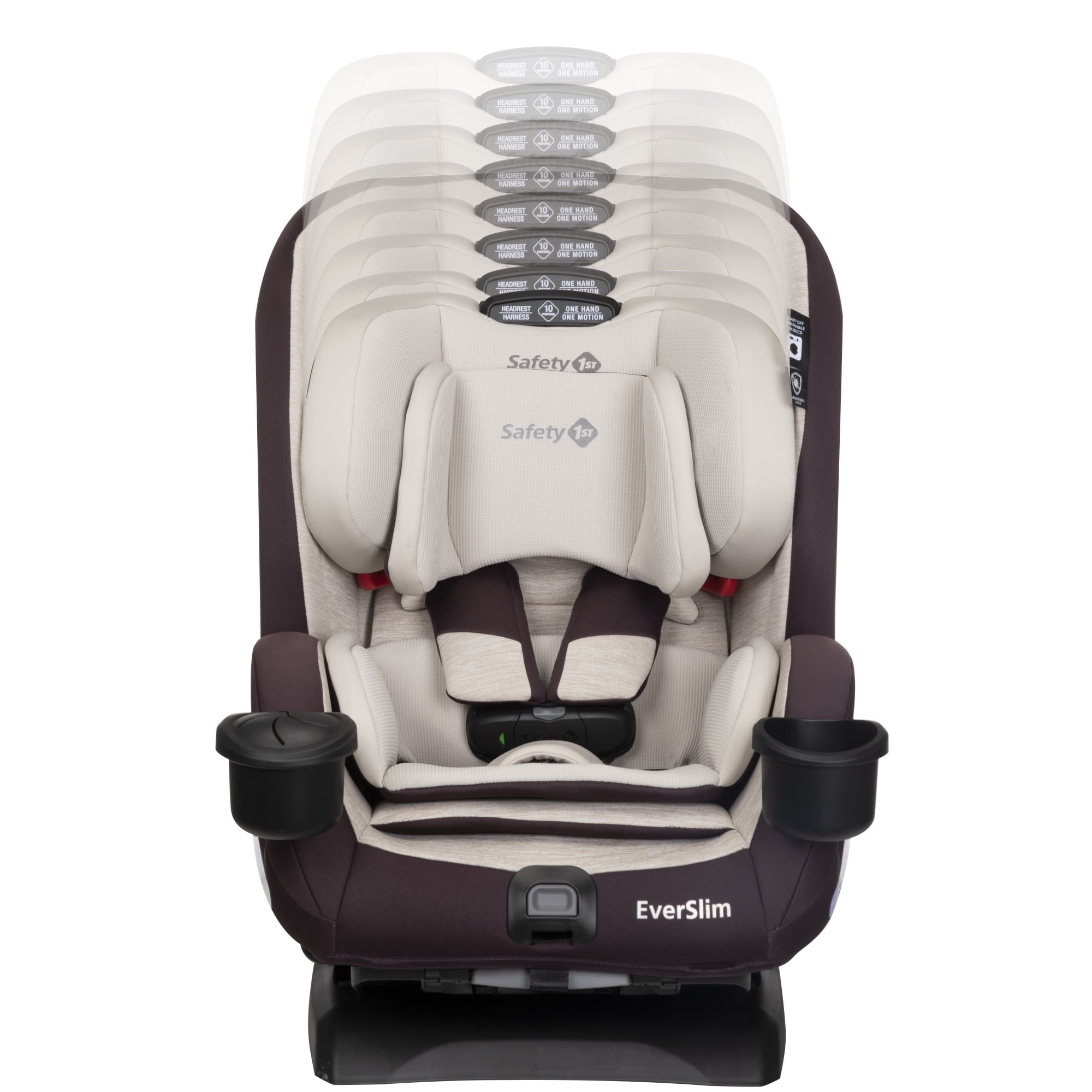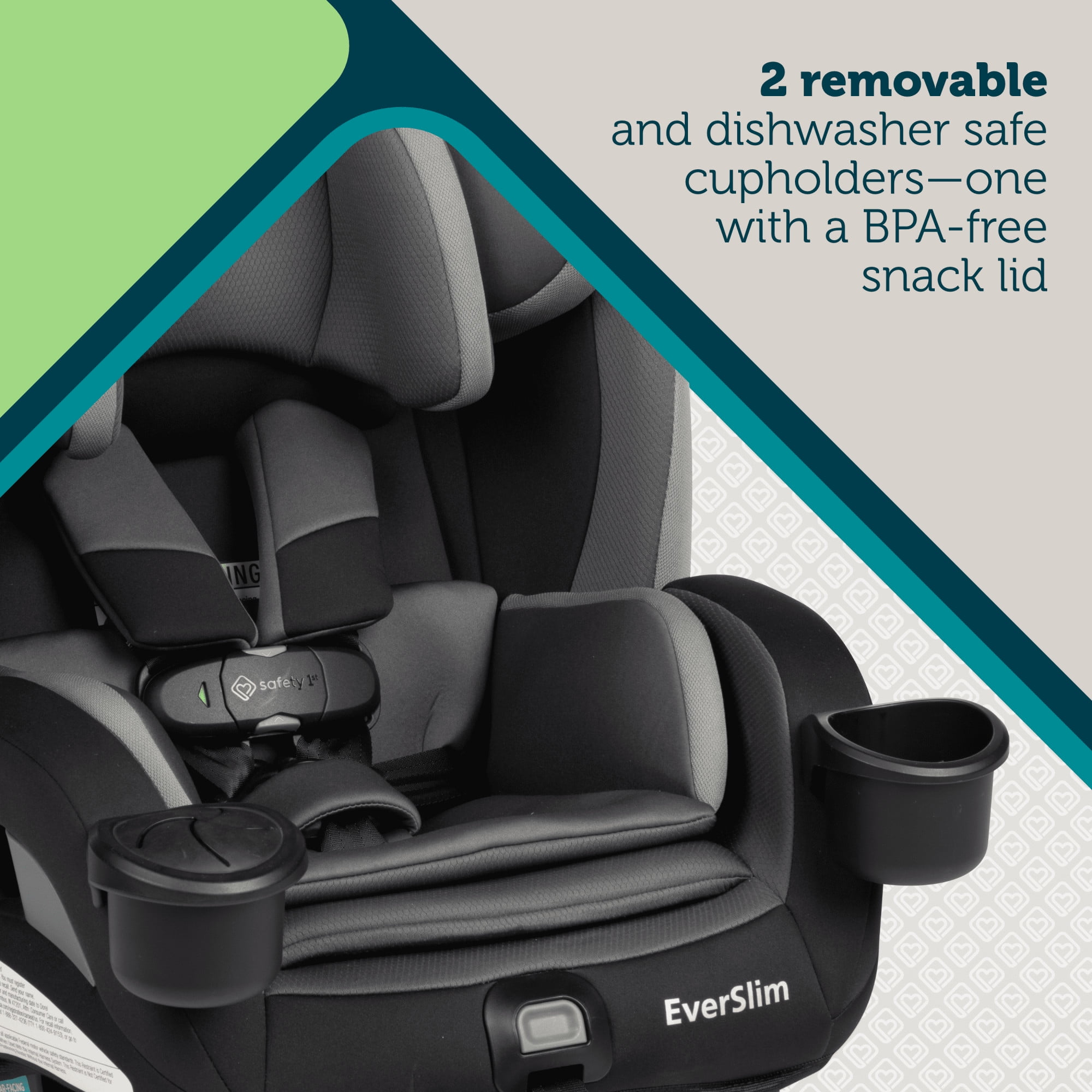 GROWS WITH YOUR CHILD 4 modes of use accommodate children from birth to age 10: rear-facing (5–40 lbs.), forward-facing (22–65 lbs.), belt-positioning booster (40–100 lbs.), and backless booster (40–100 lbs.). Converts to backless booster with one hand. FITS 3 ACROSS IN STANDARD BACK SEATS This convertible car seat’s slim design allows parents to comfortably fit more in the back seat without sacrificing comfort or safety. VISUAL INDICATOR ON THE CHEST CLIP The red-to-green indicator on the SecureTech™ chest clip visually shows parents if the chest clip is buckled or not. ADJUSTABLE BASE AND HEADREST The EverSlim All-in-One Convertible Car Seat features a 5-position adjustable base and a 10-position adjustable headrest for maximum comfort and safety. EASILY CLEAN UP SPILLS AND MESSES Removable seat cover and infant inserts are machine washable and dryer safe. The seat pad is made with antimicrobial fabric to inhibit the growth of bacteria and odor-causing microbes. ADDITIONAL FEATURES YOU’LL LOVE Includes 2 removable dishwasher-safe cup holders—one with a BPA-free snack lid, an easily removable backless booster, and a harness that adjusts without rethreading. The seat cushion is made of comfy, memory foam. The red-to-green indicator on the SecureTech™ chest clip visually shows parents if the chest clip is buckled or not. Fit 3 car seats across in standard back seats Converts to backless booster with just one hand Base features 5-position recline Machine-washable and dryer-safe seat pad and infant inserts Seat cushion is made of comfy, memory foam Seat pad is made with antimicrobial fabric to inhibit the growth of bacteria and odor-causing microbes