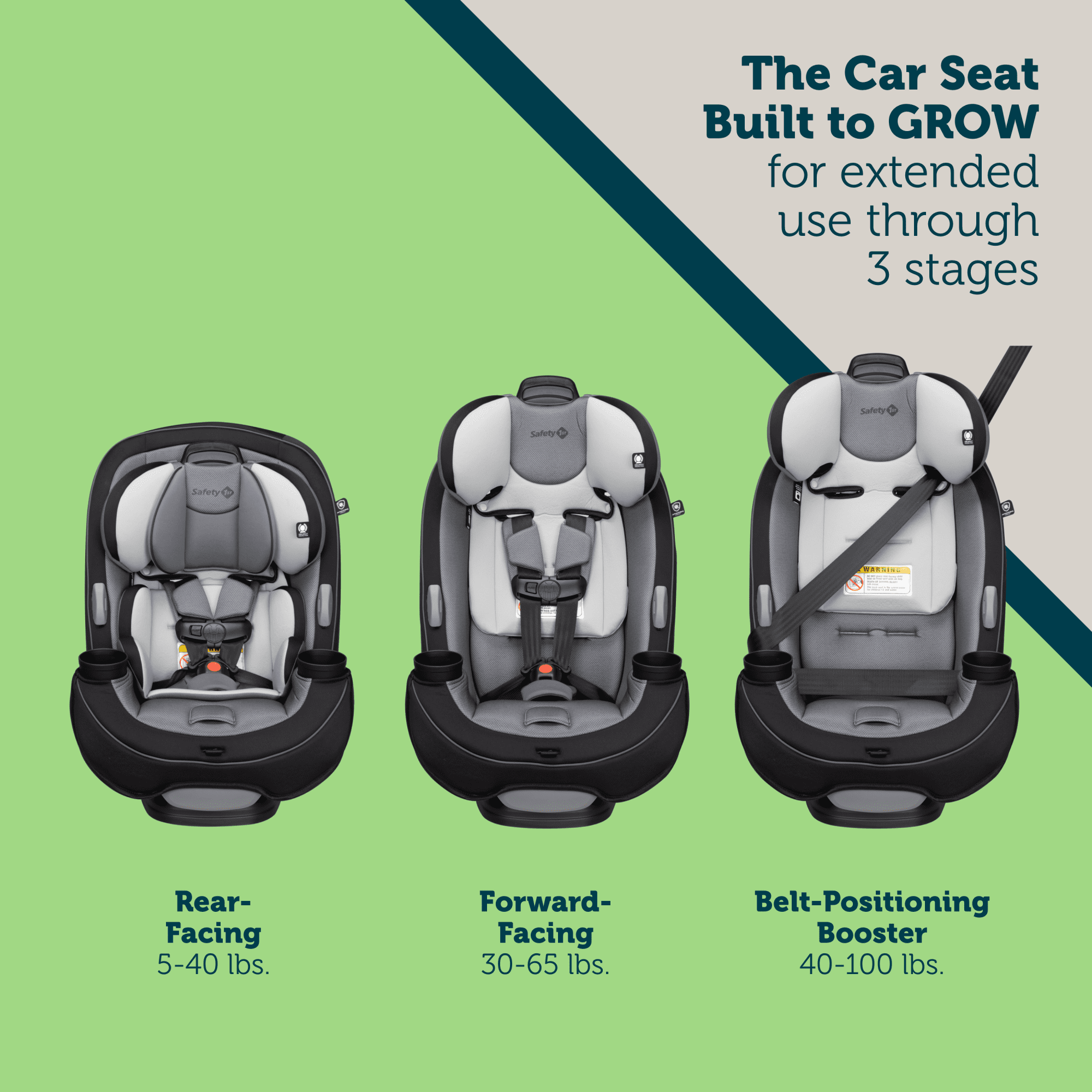 Get the car seat that’s built to grow! From your first ride together coming home from the hospital to soccer day carpools, the Safety 1st Grow and Go™ All-in-One Convertible Car Seat will give your child a secure and comfortable ride. The Grow and Go™ All-in-One Convertible Car Seat is designed to last through all your firsts with your child, from 5 to 100 lbs. and can be used in rear-facing, forward-facing, and belt-positioning booster mode. Fits children through 3 stages: rear-facing (5–40 lbs., 19″–40″), forward-facing (30–65 lbs., 34.4″–49″), and belt-positioning booster (40–100 lbs., 43.4″–52″). (Actual fit may vary. Not all children will comfortably fit in the seat for the full weight and height ranges listed.) As your little one grows, you can easily adjust the headrest and harness in 1 quick motion, without re-threading the harness or re-installing the car seat. The crotch strap and harness have multiple adjustment options to fit growing kids. When your child is ready to use the vehicle seat belts, buckling is made easy with the visible belt path guiding the way.You’ll appreciate the parent-friendly design. As your tiny baby grows into a big kid, messes are bound to happen, but we’ve made cleaning easy. The seat pad snaps off easily without removing the harness and is machine-washable and dryer-safe. Dual cup holders transport favorite drinks and snacks, and are easily removable and dishwasher-safe. Getting kids in and out of the car is made easier with harness holders that keep harness straps out of the way. Built for child comfort, the Grow and Go™ Convertible Car Seat includes 2 removable grow-with-baby pillows to give your new travel companion a snug fit. 3-position recline makes it easy to get a good fit in your car.