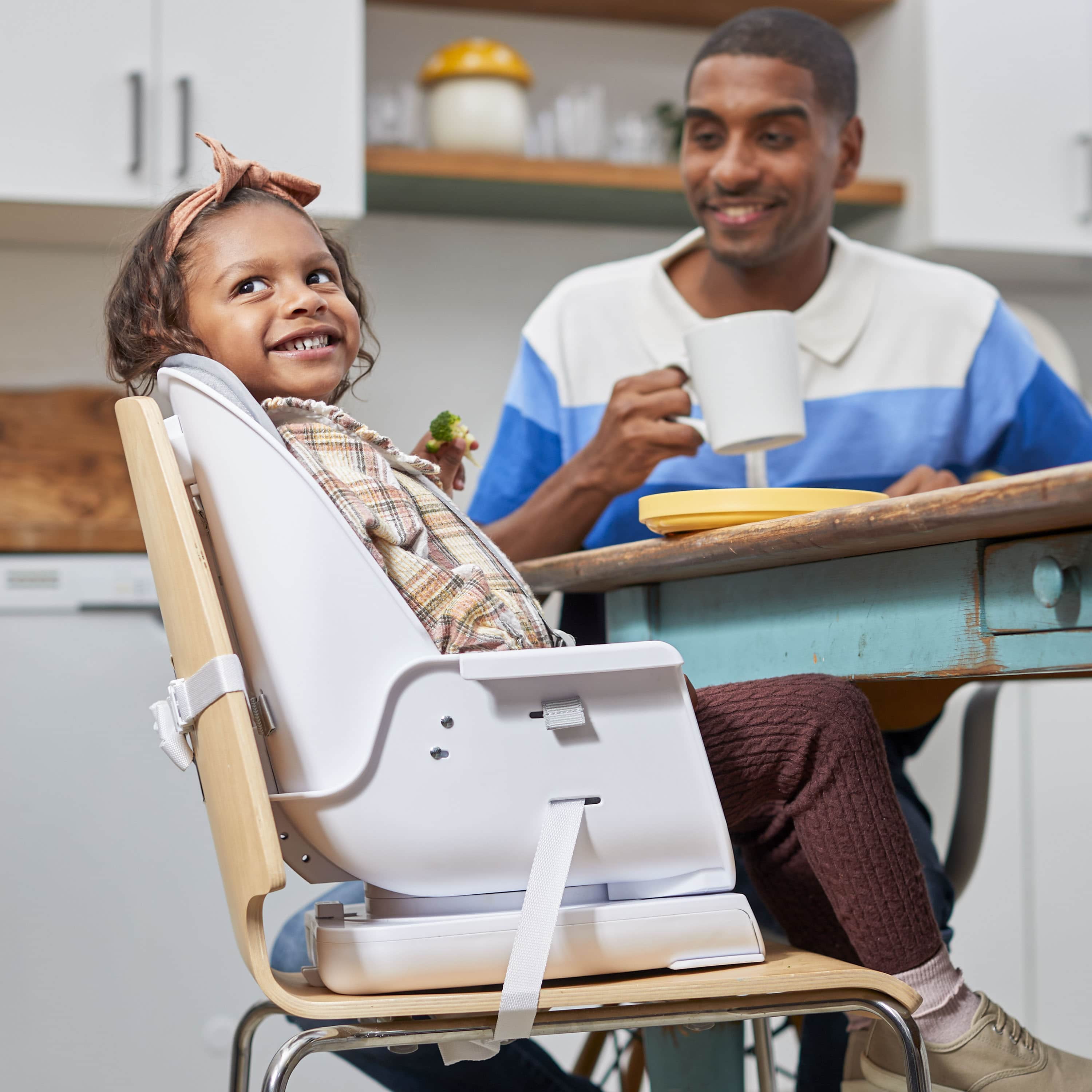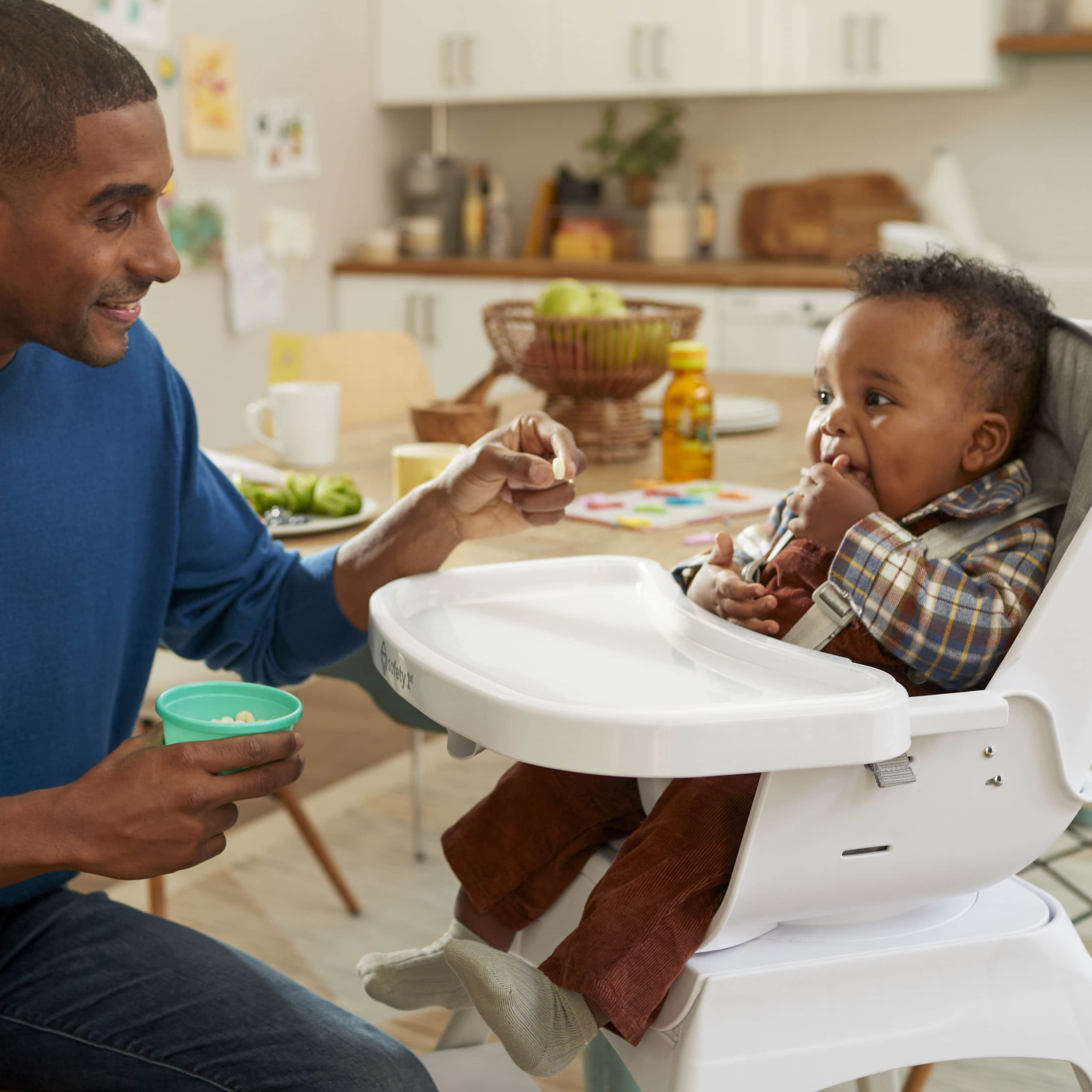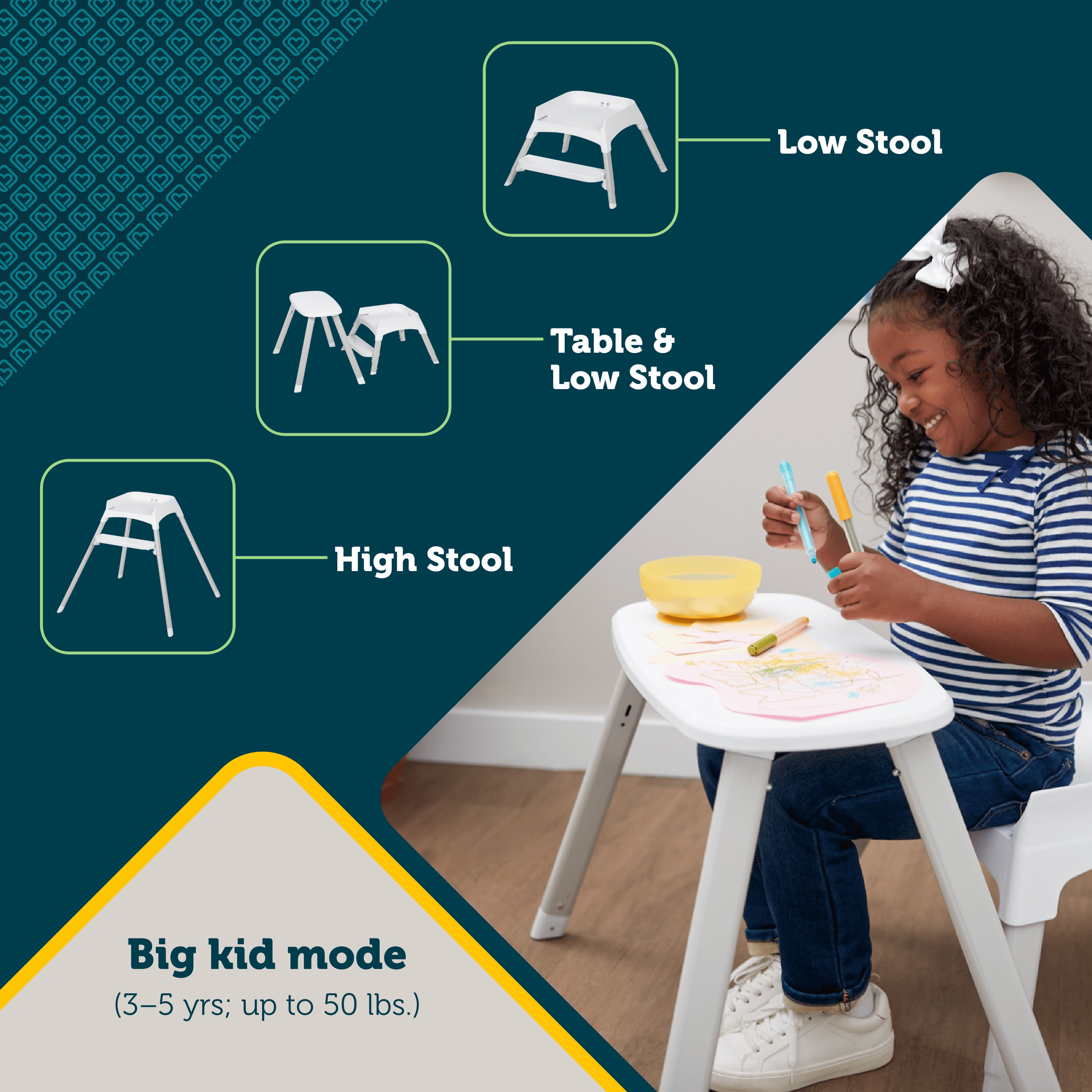Safety 1st Grow and Go Rotating High Chair, Soft Ash 9-in-1 high chair grows with your child from infant to toddler up to 5 years and 50 lbs. 3 high chair modes: Infant mode with 3 recline positions, and upright mode with or without tray. (0–3 yrs; up to 40 lbs.) 2 booster modes: Infant mode and toddler mode (with no tray) (6 mo–5 yrs; up to 50 lbs.) 3 big kid modes: low stool, table and low stool, and high stool (3–5 yrs; up to 50 lbs.) Seats two at once: with the booster (6 mo–5 yrs) and stool (3–5 yrs.), you can seat two kids at the same time. Both seats fit kids up to 50 lbs. Removable, washable seat cover, infant insert, and harness covers 1-hand removable tray Easy-to-remove, dishwasher-safe insert tray 5-point harness for safety 2-position adjustable footrest to accommodate your growing child Assembled Weight: 17.4 lb