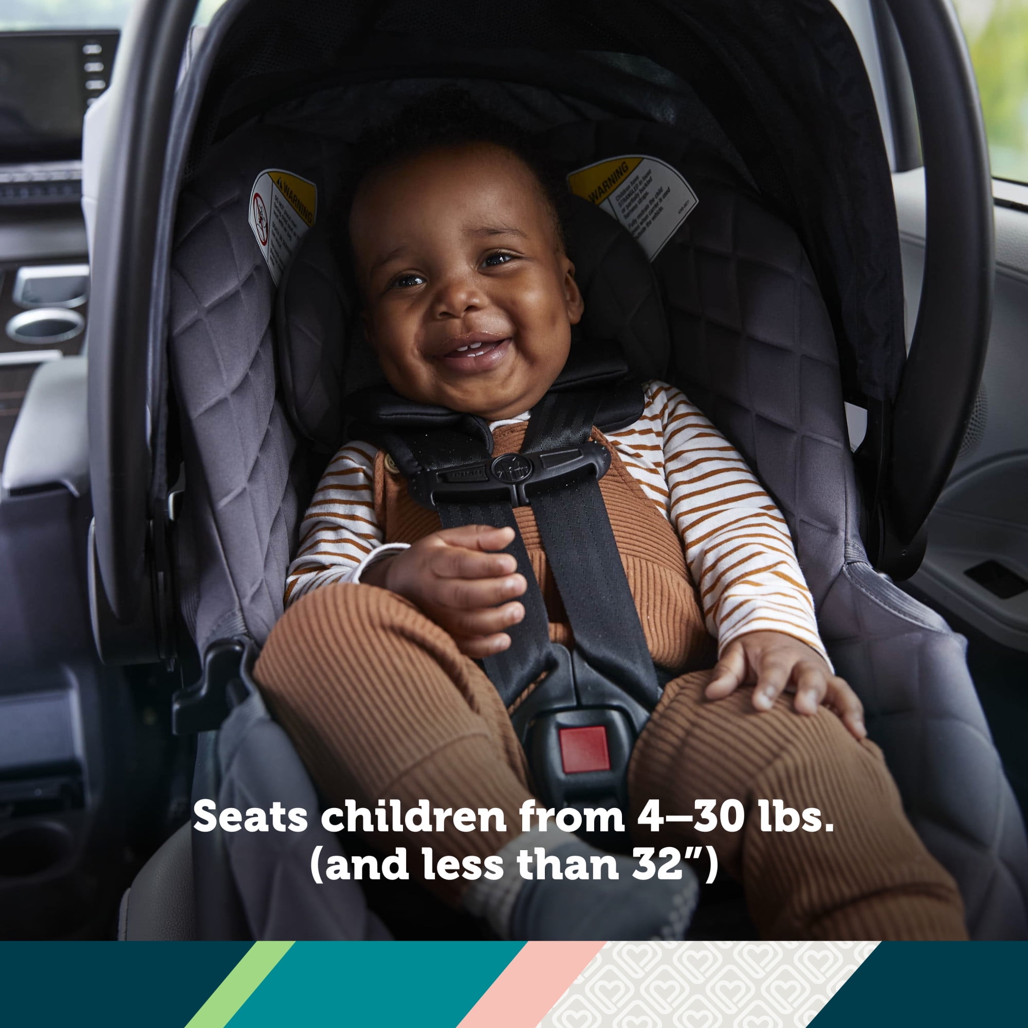 SecureTech™, Safety 1st’s red-to-green indicators on the seat’s base allow you to see when your base is secured from the LATCH or vehicle belt SecureTech™, Safety 1st’s red-to-green indicators on the seat’s base allow you to see when your base is secured from the LATCH or vehicle belt Ultra-lightweight design, weighs only 7.5 lbs. Seats children from 4–30 lbs. (and less than 32″) Faux-leather handle grip Zippered mesh extension on canopy Rigorously crash and side-impact tested to meet safety standards Machine-washable and dryer-safe seat pad Adjustable base for the right fit to your car LATCH equipped and airplane ready
