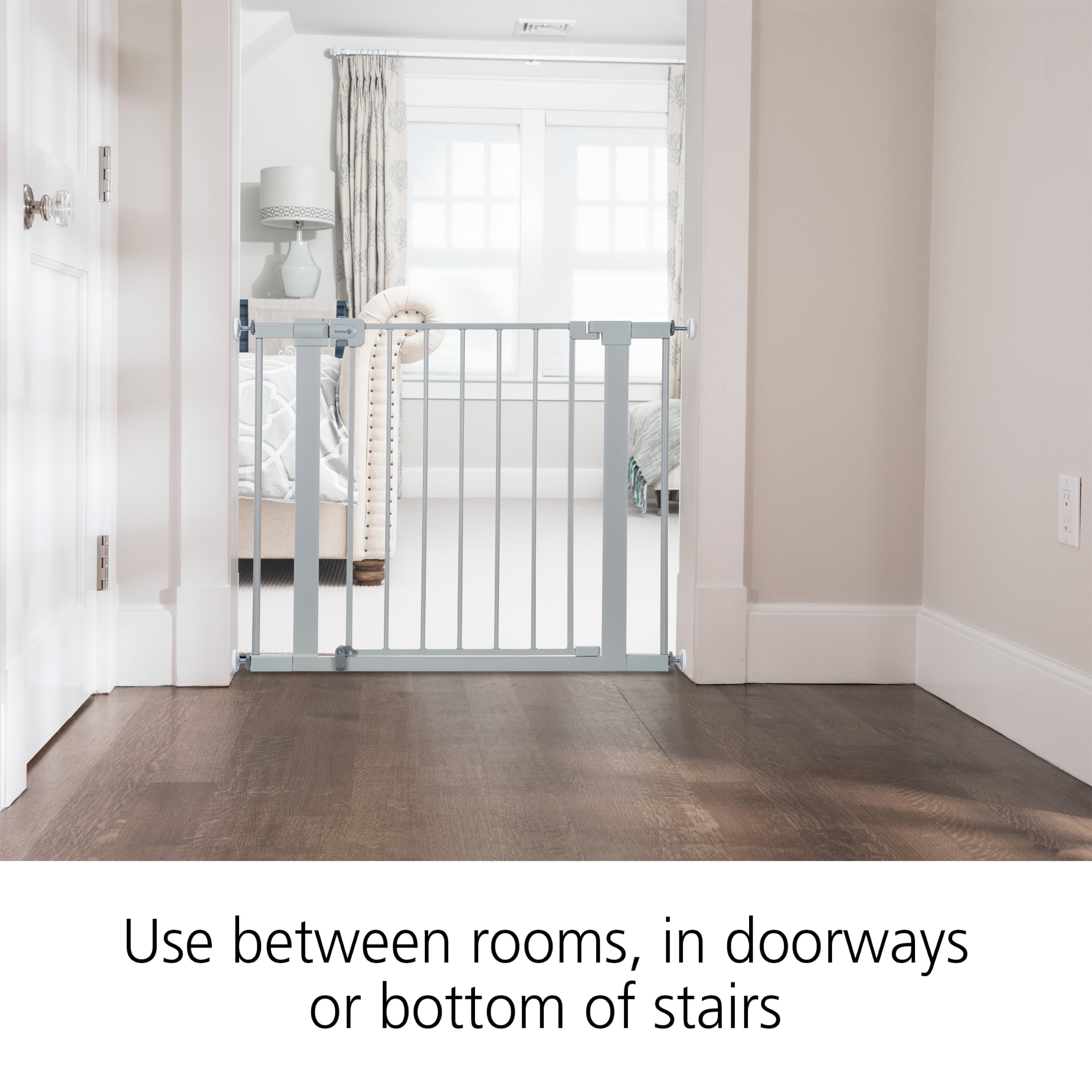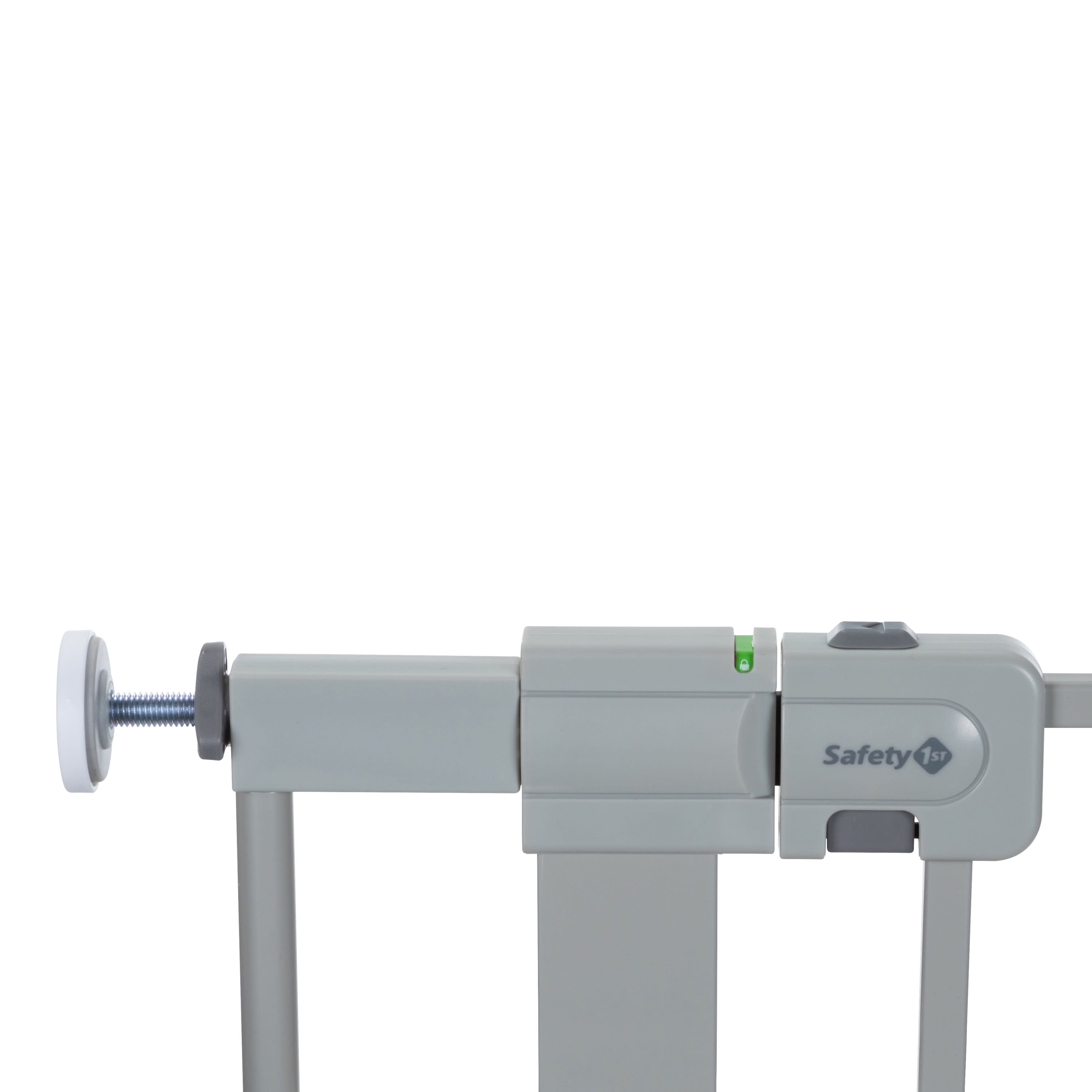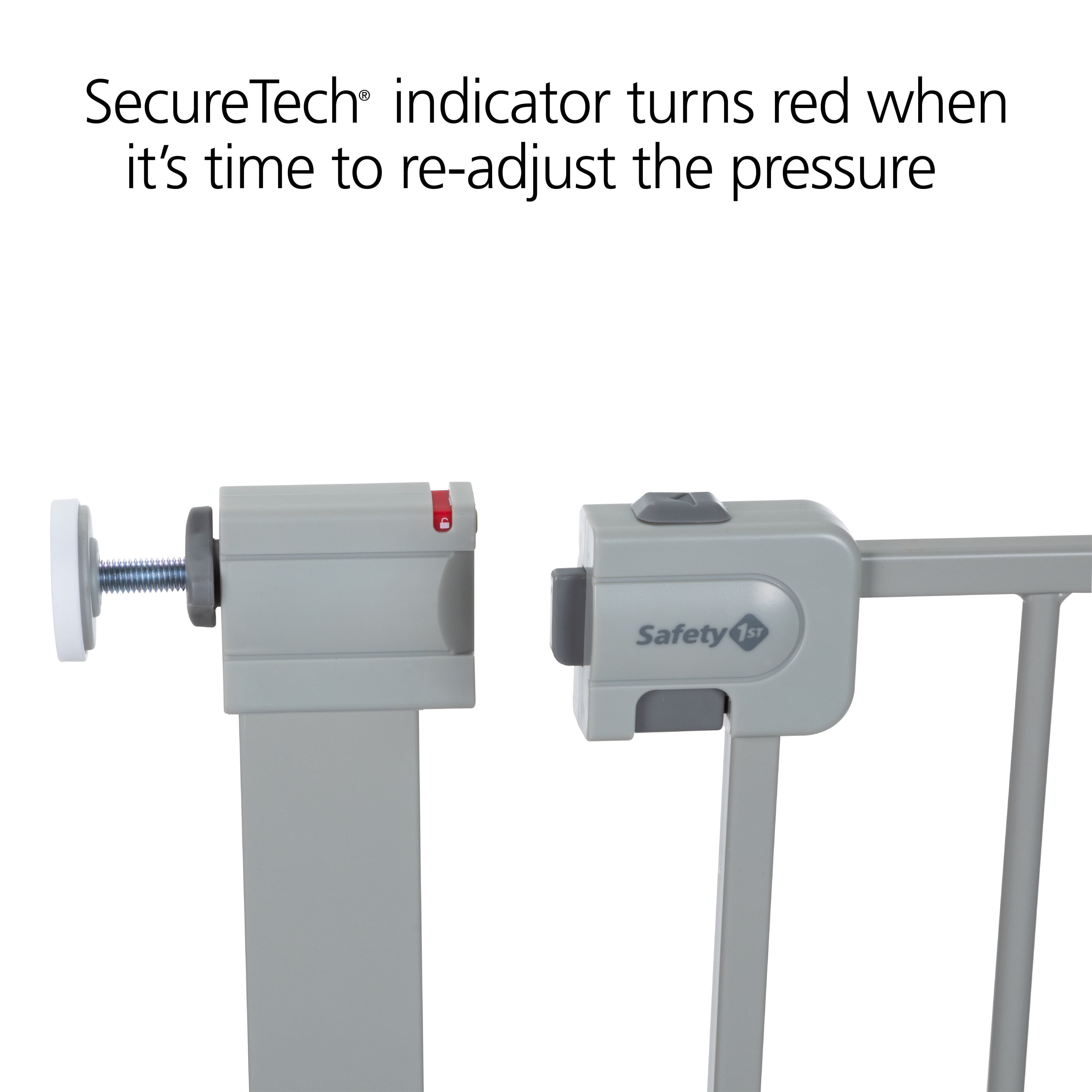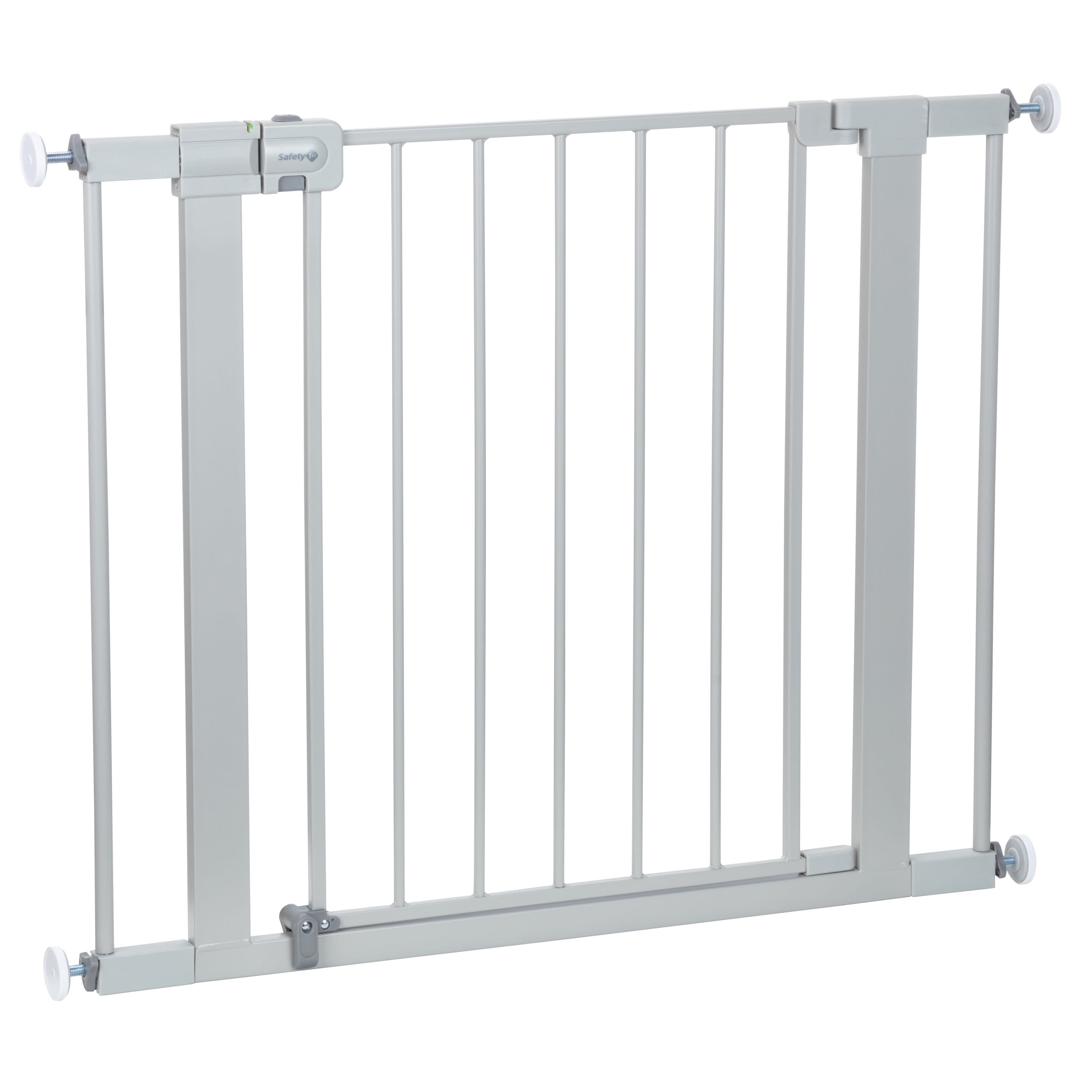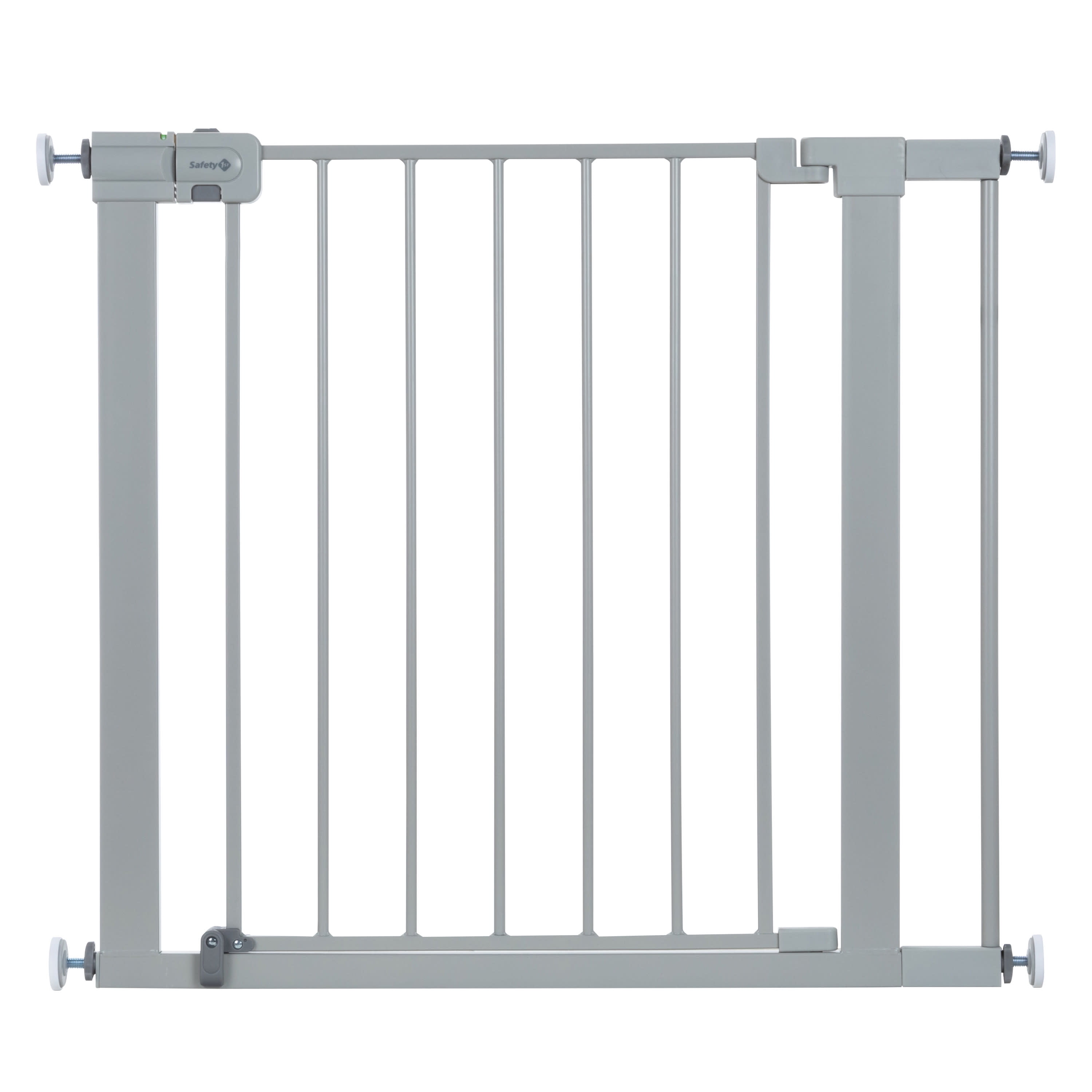 Safety 1st Simple Pass Walk-Through Gate, Grey Quick and easy install: Visual red indicator lets parent know gate is unlatched or unproperly pressurized Pressure-installed gate is quick to set up and easy to take down when not in use The two-action handle is tough for little fingers to release Fits most doorways and works between rooms or at the bottom of the stairs TO PREVENT FALLS, NEVER use pressure-installed gate at top of stairs Includes four wall cups. Must install with wall cups to keep gate in place Adjustability in width: 29″ to 32″ with main gate; up to 35″ with one extension (included); up to 38″ with two extensions (included) 28″ high JPMA certified and meets CPSC requirements Perfect for children 6-24 months and great for pets too 28″ high