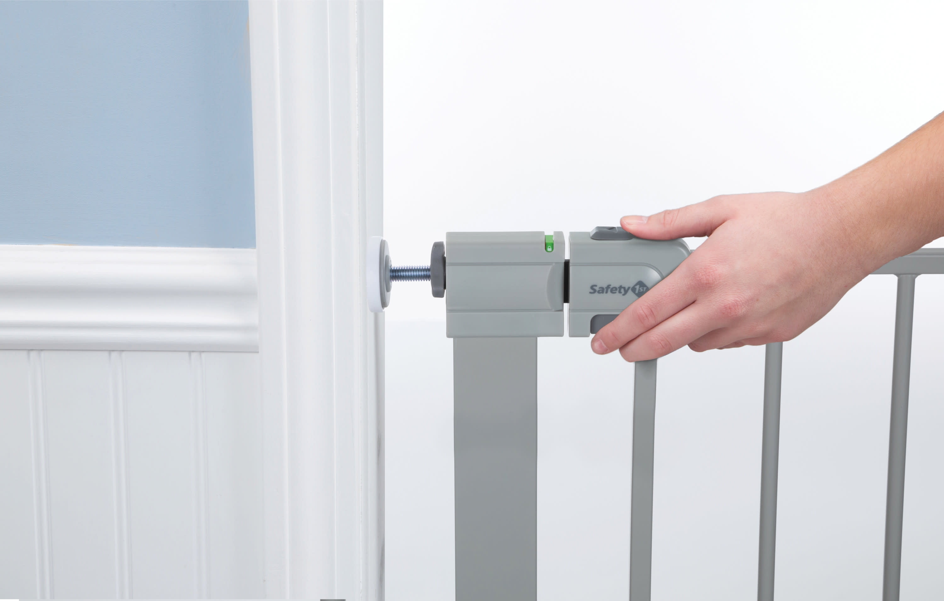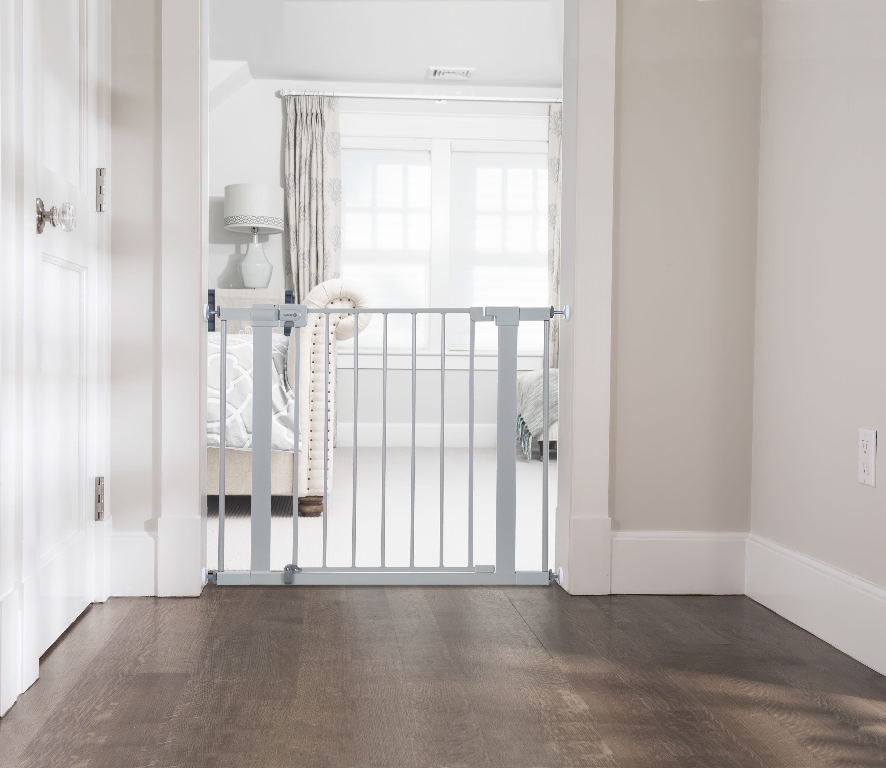 Now that baby is on the move, the Safety 1st Simple Pass Walk-Through Gate makes it simple to create child-friendly areas within your home. For use between rooms, a walk-through gate makes it easy to get around the house, with no need to reinstall it each time you pass by. It’s also quick and easy to install. The visual red indicator lets you know if the gate is unlatched or unproperly pressurized. And the walk-through design makes it easy to get around the house, with no need to reinstall it each time you pass by. Pressure-installed gates provide flexibility in usage around the home. Wall cups stay installed to the wall while the gate can easily be removed for periods of non-use. The gate is 28 inches high and can be adjusted from 29 to 38 inches for doorways of varying widths throughout your home. The Safety 1st Simple Pass Walk-Through Gate isn’t just for kids either. It comes in handy when you’re trying to keep pets out of certain rooms as well.