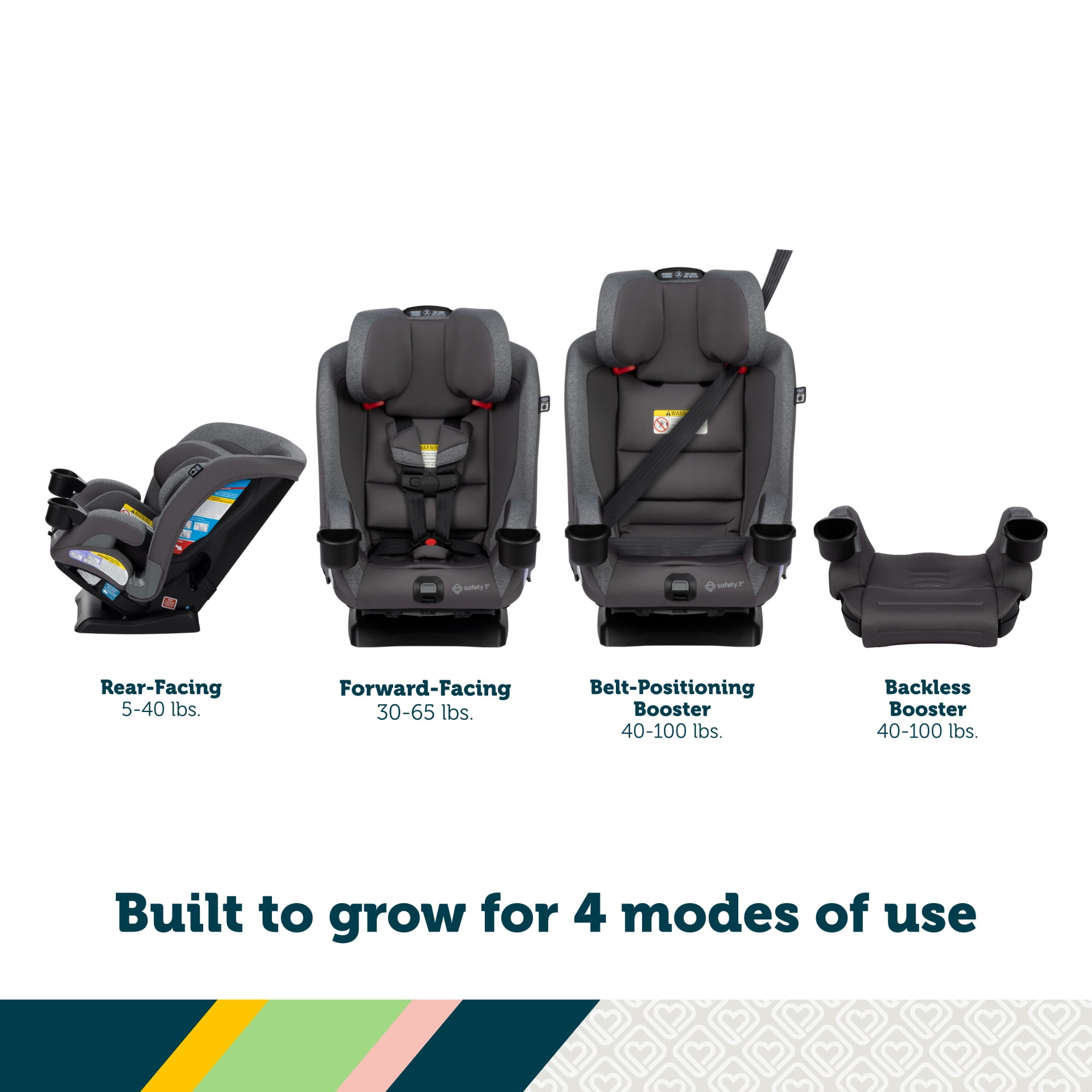 The Safety 1st SlimRide 4-in-1 Convertible Car Seat is built to grow with your child while keeping them secure and comfortable on the road. With 4 modes of use––rear-facing infant (5–40 lbs., 19”–40”), forward-facing toddler (30–65 lbs., 34.4”–49”), belt-positioning booster and backless booster seat (40–100 lbs., 43.4”–52”)––the Safety 1st SlimRide is ready to take your baby home from the hospital or take your big kid to soccer practice. The slim car seat design fits 3 across the back seat in most vehicles without sacrificing security or comfort. With the 5-position adjustable base;1-hand,10-position adjustable headrest; easy-to-convert backless booster; and machine-washable and -dryable fabric, it’s the only seat your child will need from birth to age 10. This convertible car seat is engineered and tested to meet or exceed federal safety standards. Meets federal Side Impact standard. Actual fit may vary. Not all children will comfortably fit in the seat for the full weight and height ranges listed.