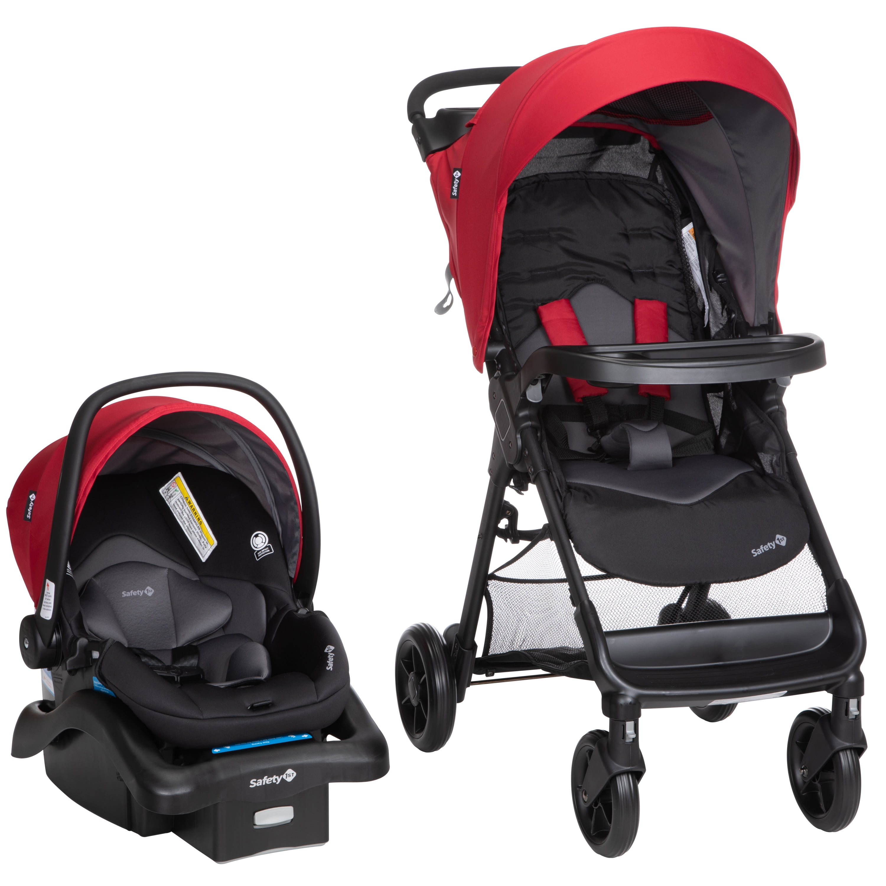 The Smooth Ride Travel System Stroller makes strolling easy with everything you need to truly enjoy your time when out and about with your baby and none of the hassles other strollers are known for. The agile wheels provide maximum maneuverability around corners, and the flip-flop friendly brakes make it simple to put the stroller into park. The canopy provides super-sized coverage and includes a special flip out visor when you want to give your child some additional protection. The canopy also features a large peek-a-boo window that gives you an easy view during the stroll and provides your little one with better airflow as they enjoy the ride. QuickClick® lets you securely attach the car seat to the stroller with one simple click, making it easy to use the car seat and stroller together as a travel system. The included onBoard™ FLX infant car seat provides your baby with a superior fit for superior safety while traveling. The 4 harness heights are spaced right to give your child a better fit all the way from 4-30 pounds. The buckle adjusts in two ways so that you can customize not only the length, but also the buckle’s position on your child. The seat has also been designed for a better reclined body position to give your baby a safer ride. Both you and your child will have room for everything you need along the way with the Smooth Ride Stroller Travel System. The parent and child trays are perfect for smaller items you’ll want to keep close by, and larger items will fit easily into the extra-large storage basket. When you’re done for the day, there’s no struggling to fold the stroller thanks to the lift-to-fold design. It’s as simple as: Lift. Fold. Done. The stroller also stands when folded, making it easier to store away. With the Smooth Ride Travel System Stroller, strolling is made easy so you and your little one can focus on the fun. Safety 1st believes parenting should have fewer worries and more joyful moments. As the first and only leader in child safety, Safety 1st is here to give you peace of mind so you can spend less time worrying and more time enjoying every first you experience with your child.