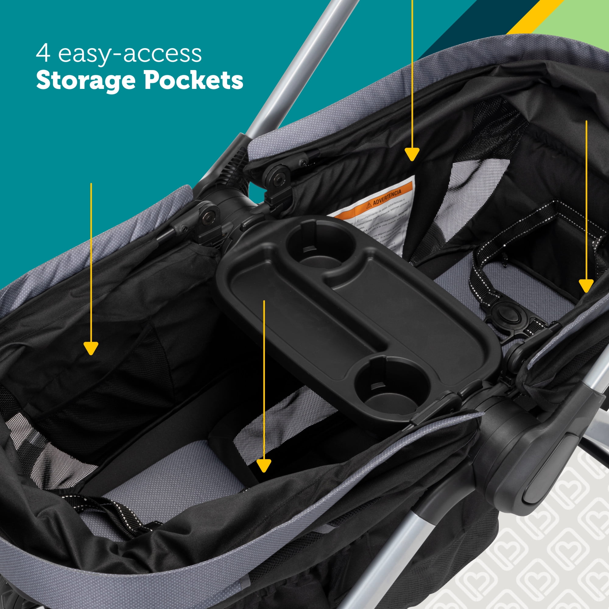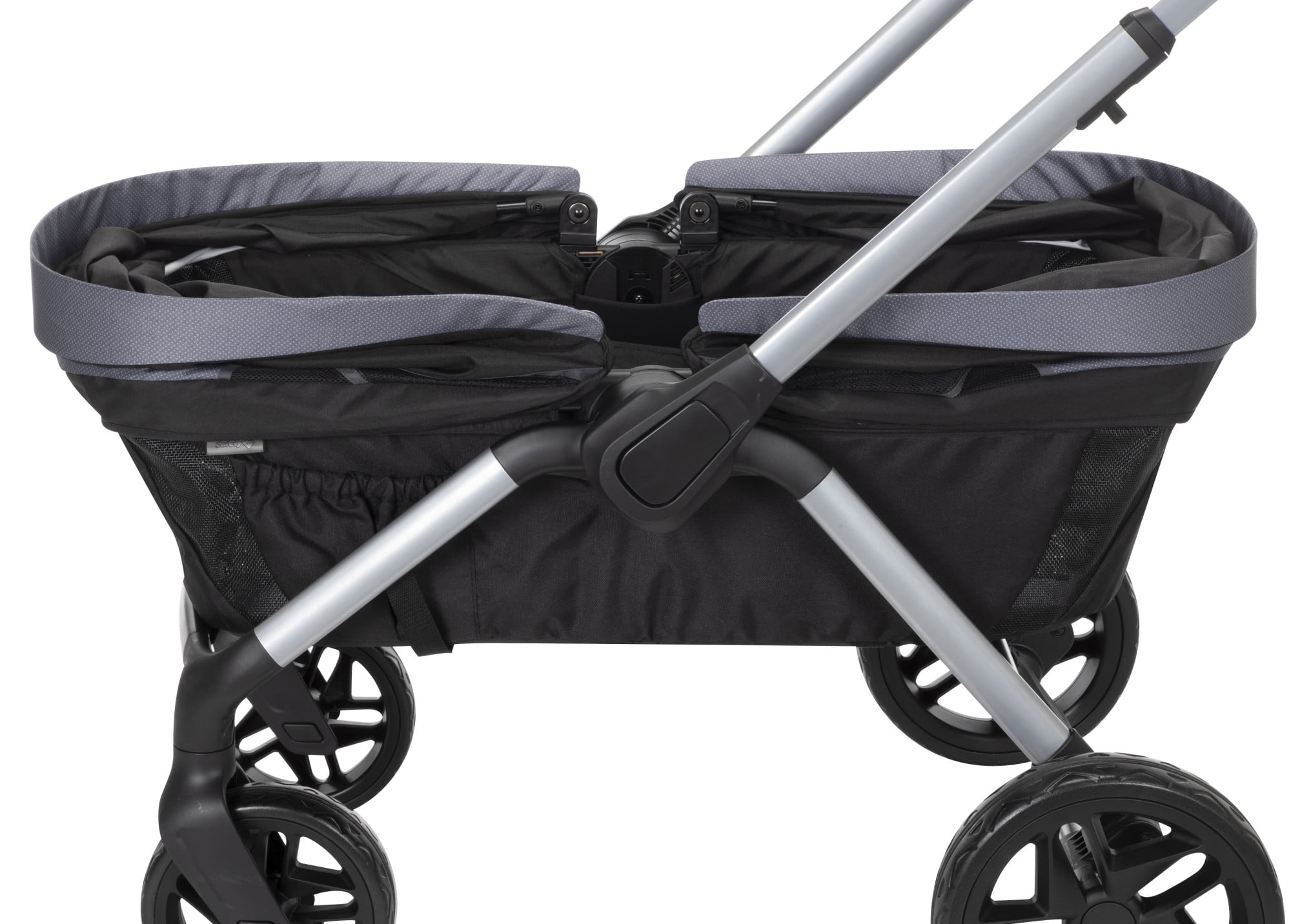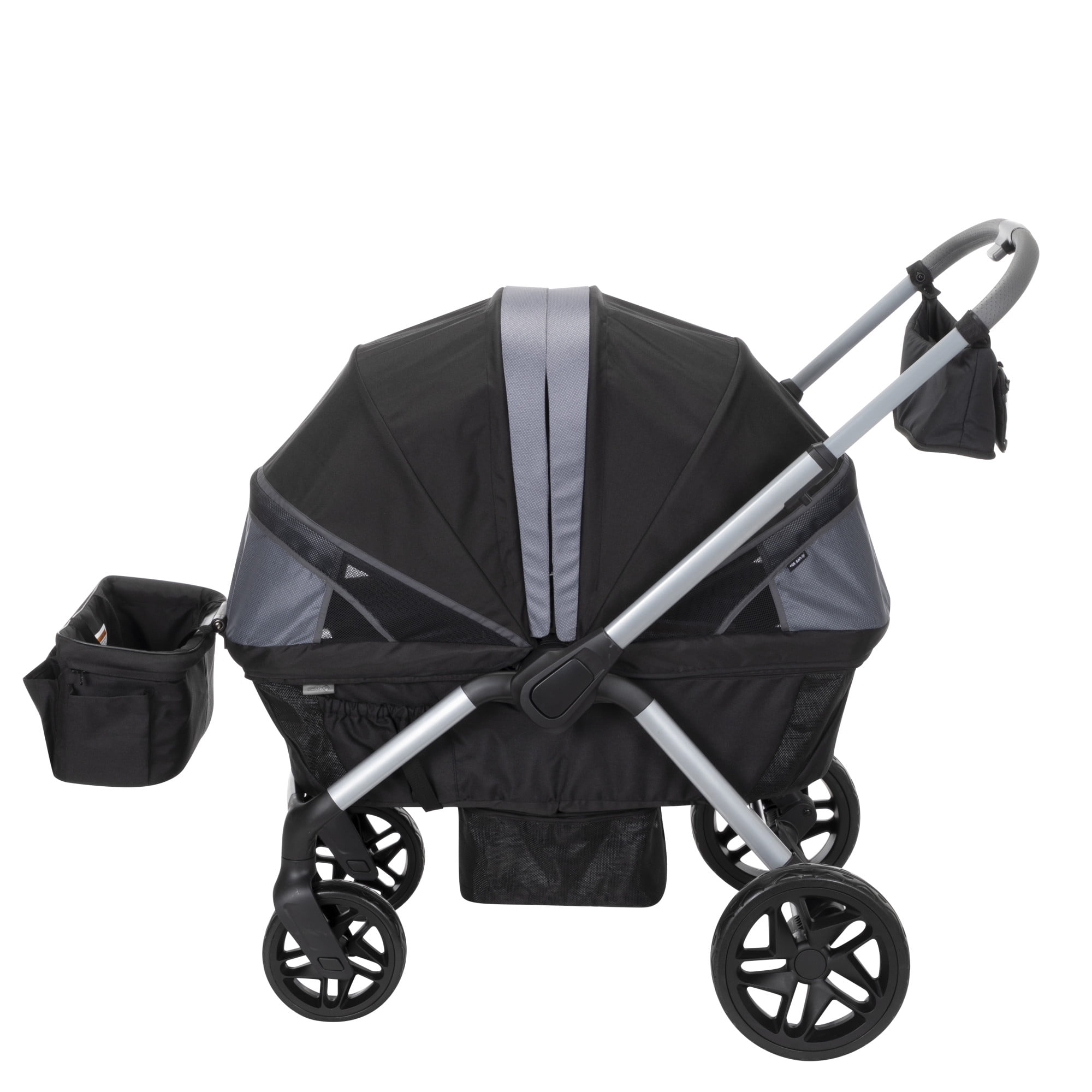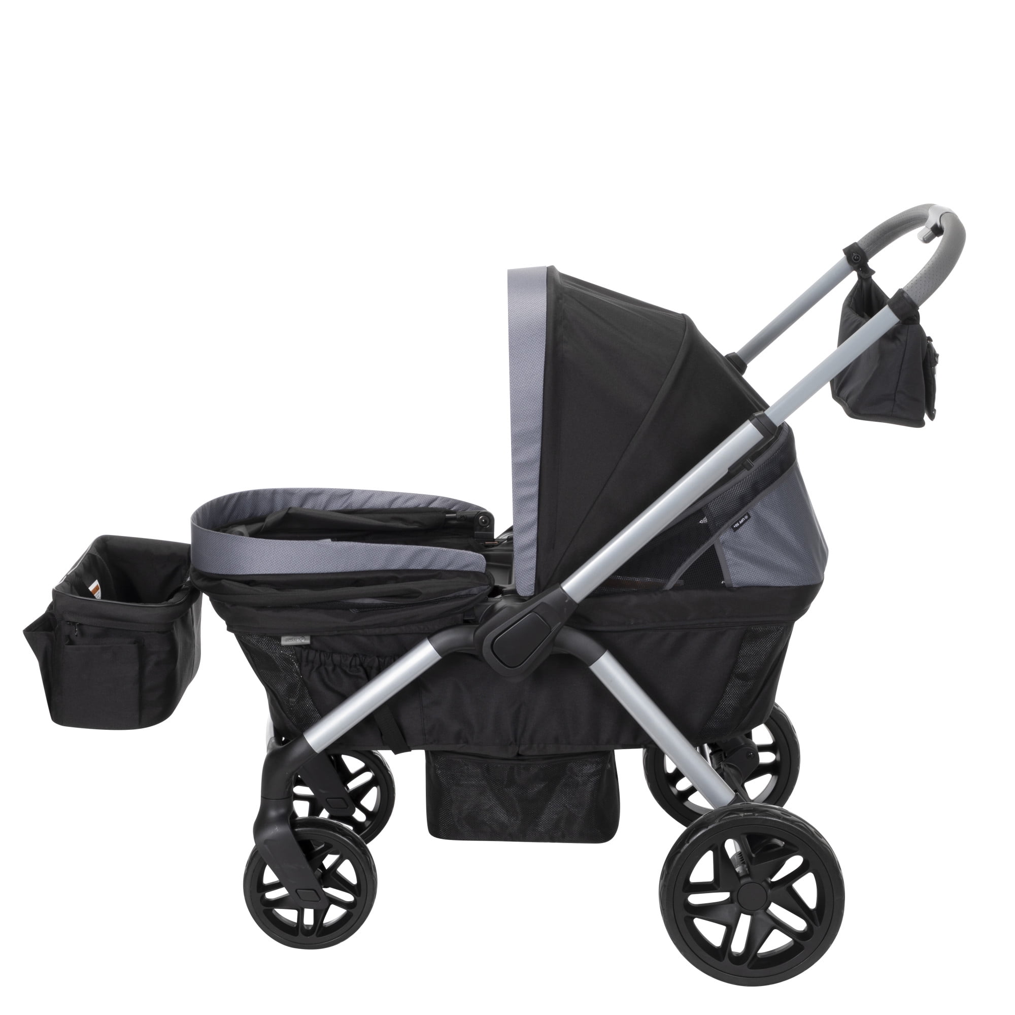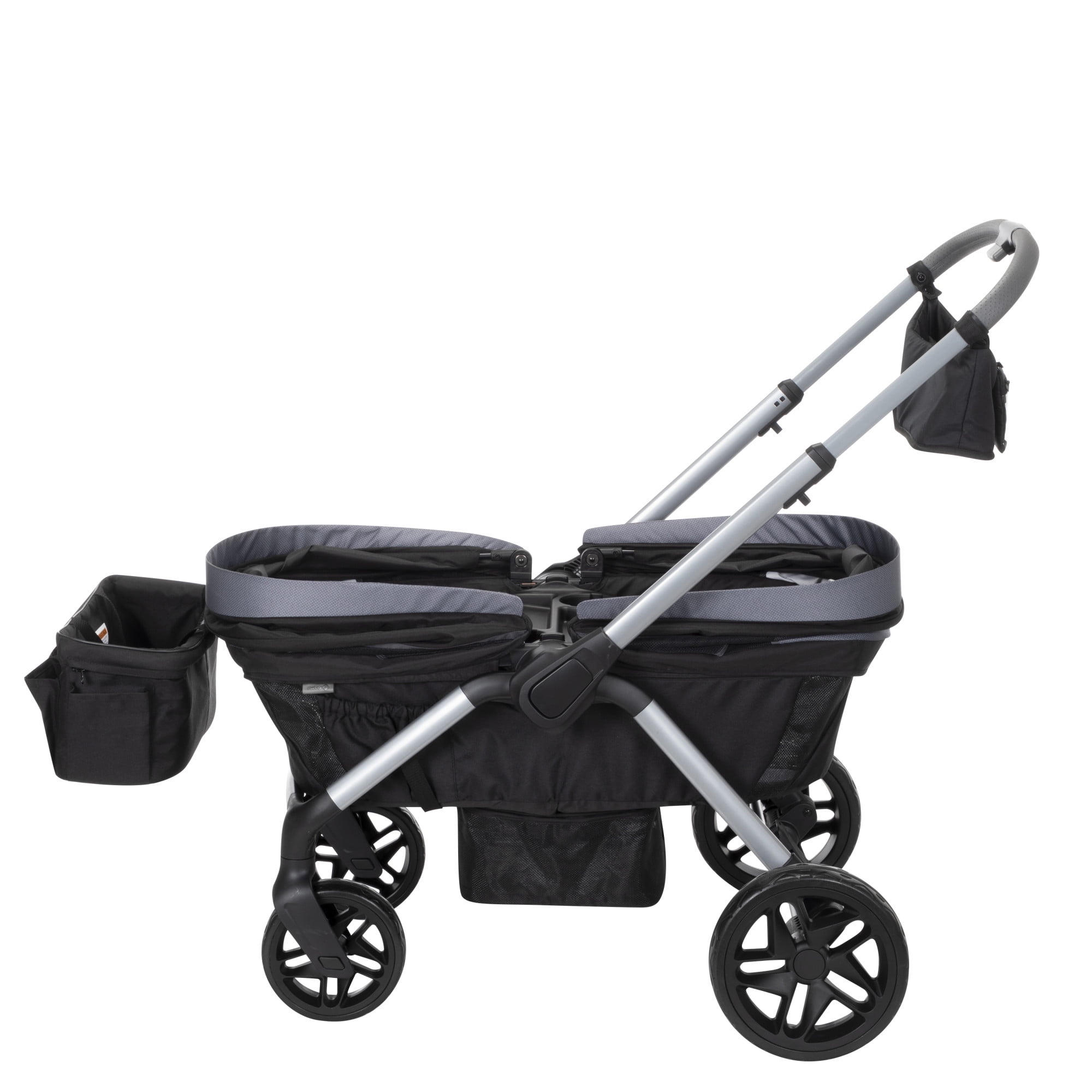 Includes adapters compatible with most Safety 1st® and Cosco® infant seats (infant seat not included) Dual water-repellent, vented canopies with full 50+ UPF sun protection Telescoping, reversible handle Footwell zips out for easy cleaning Detachable storage basket can be used on either end Removable, dishwasher-safe child tray with 2 cup holders Removable parent storage bag becomes a wristlet All-terrain wheels with rear suspension and linked braking system Unisex Safety 1st Summit Wagon Stroller (Each)