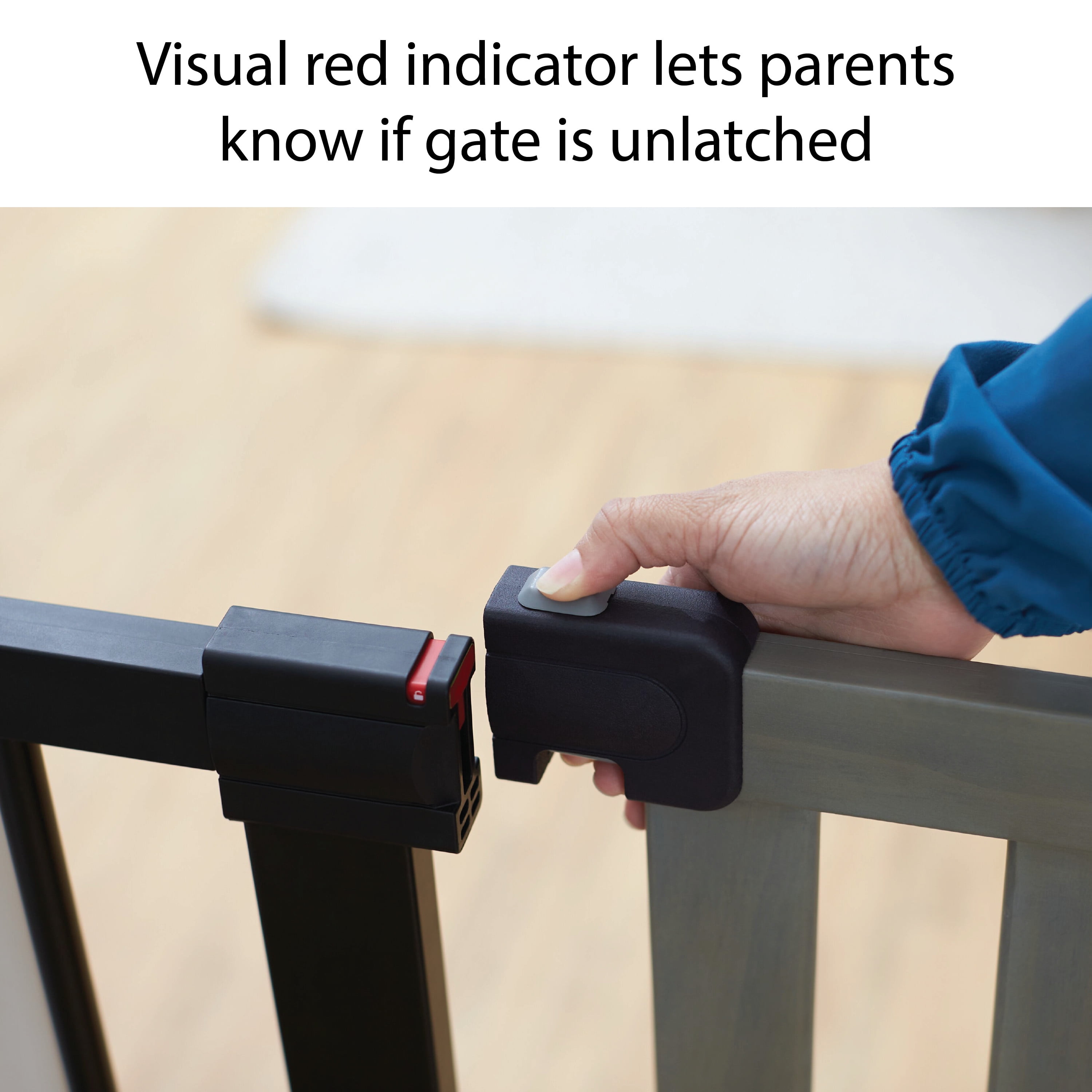 Safety 1ˢᵗ Wood-and-Metal Flat Slat Gate, Grey Contemporary metal and wood flat-slat design blends with home décor SecureTech®, Safety 1st’s red-to-green indicator on the top rail that allows you to see when your gate is securely locked Pressure-installed gate is quick to set up and easy to take down Unlocks with one hand and swings in both directions To prevent falls, never use pressure-installed gate at top of stairs Fits most doorways and works between rooms or at the bottom of the stairs Includes four wall cups. Must install with wall cups to keep gate in place 29”–38” wide; 28” high JPMA certified and meets CPSC requirements Perfect for children 6–24 months and great for pets, too Note: When the gate is uninstalled, the frame may appear bent. This is normal. The frame is constructed in this manner to provide pressure to remain in place when installed properly.