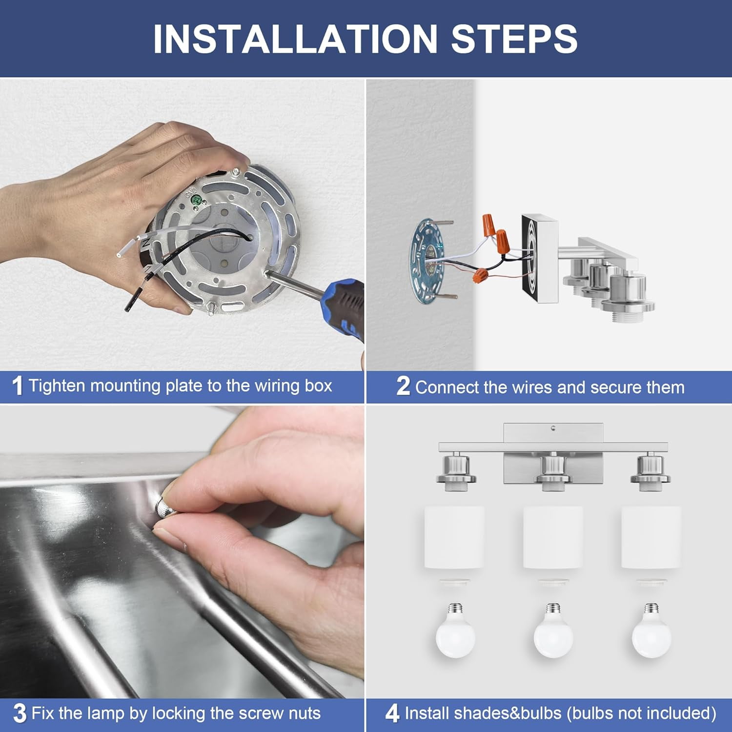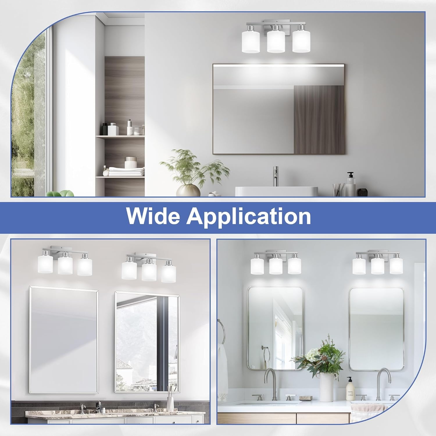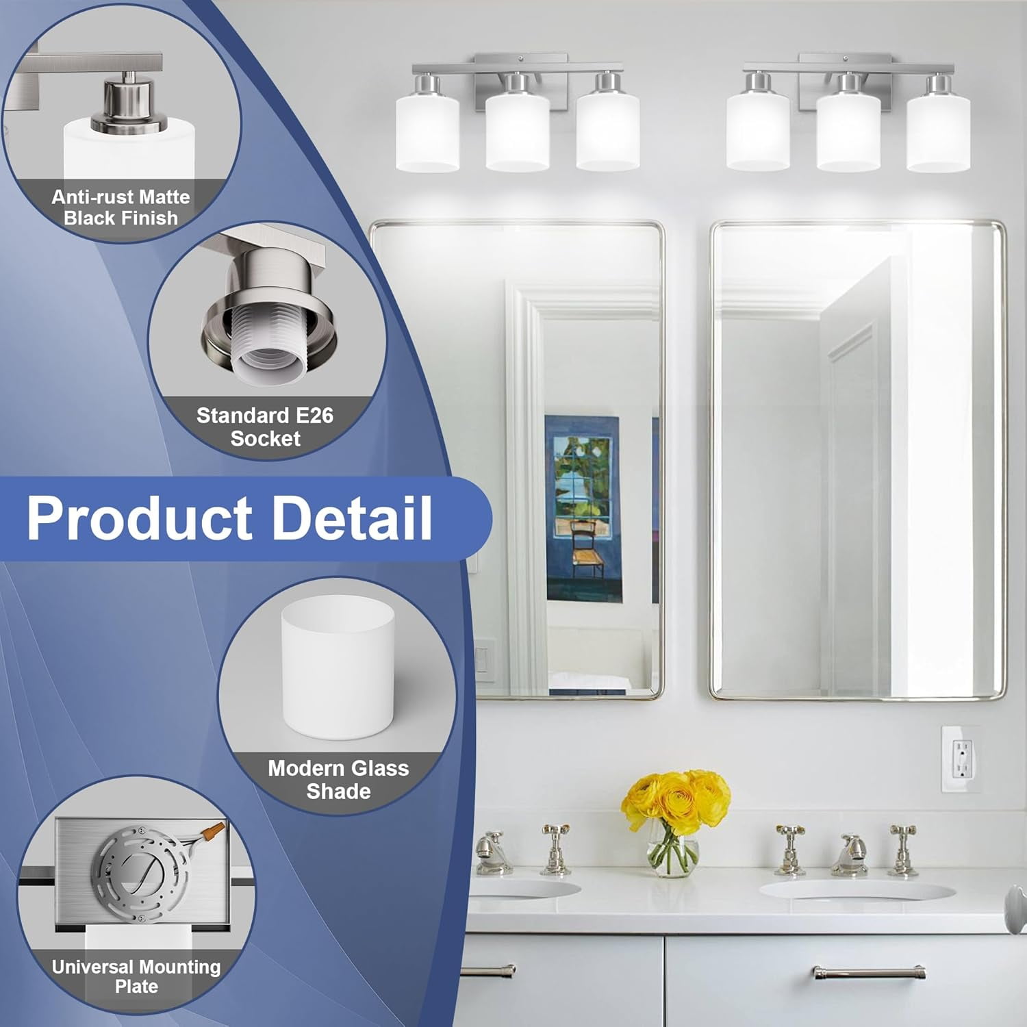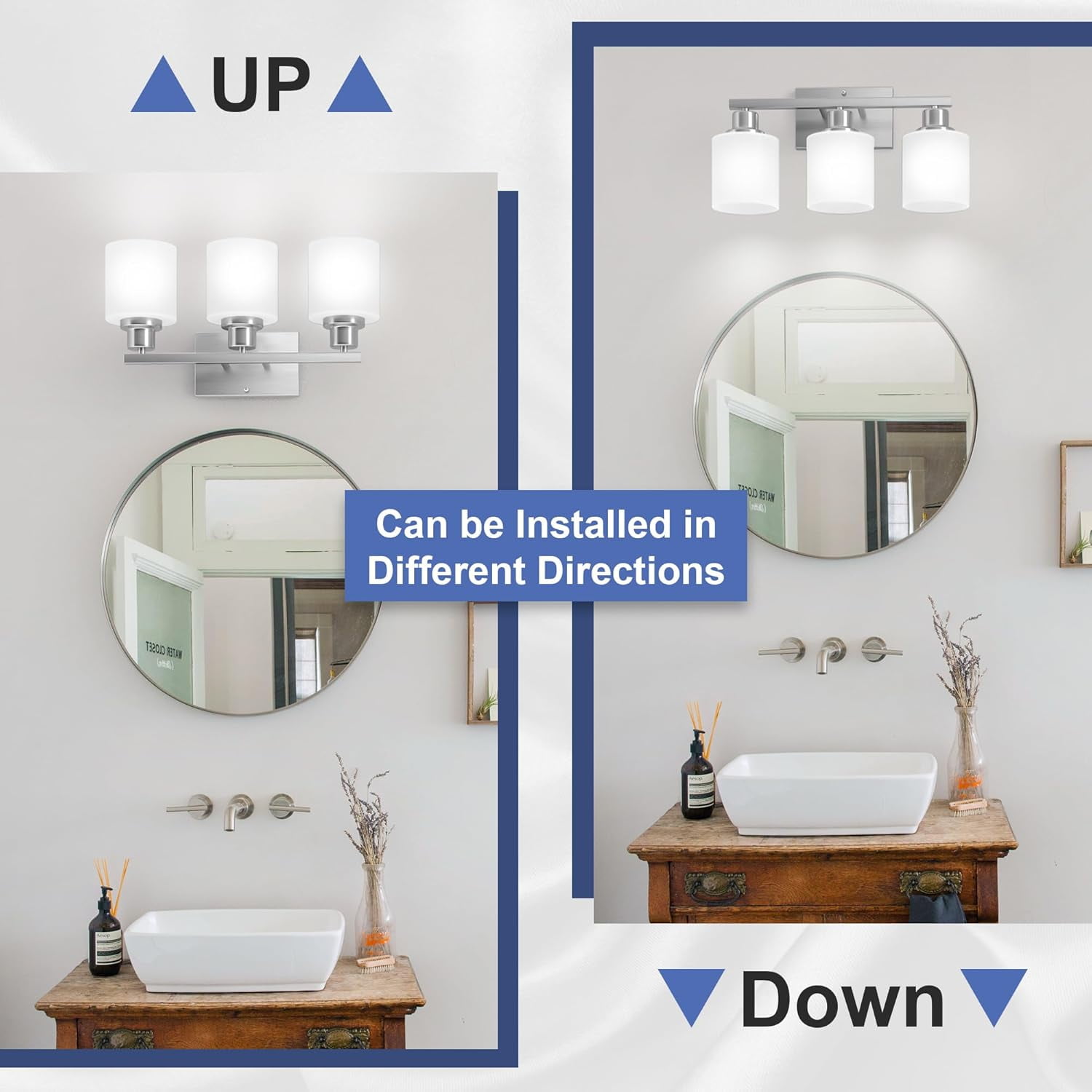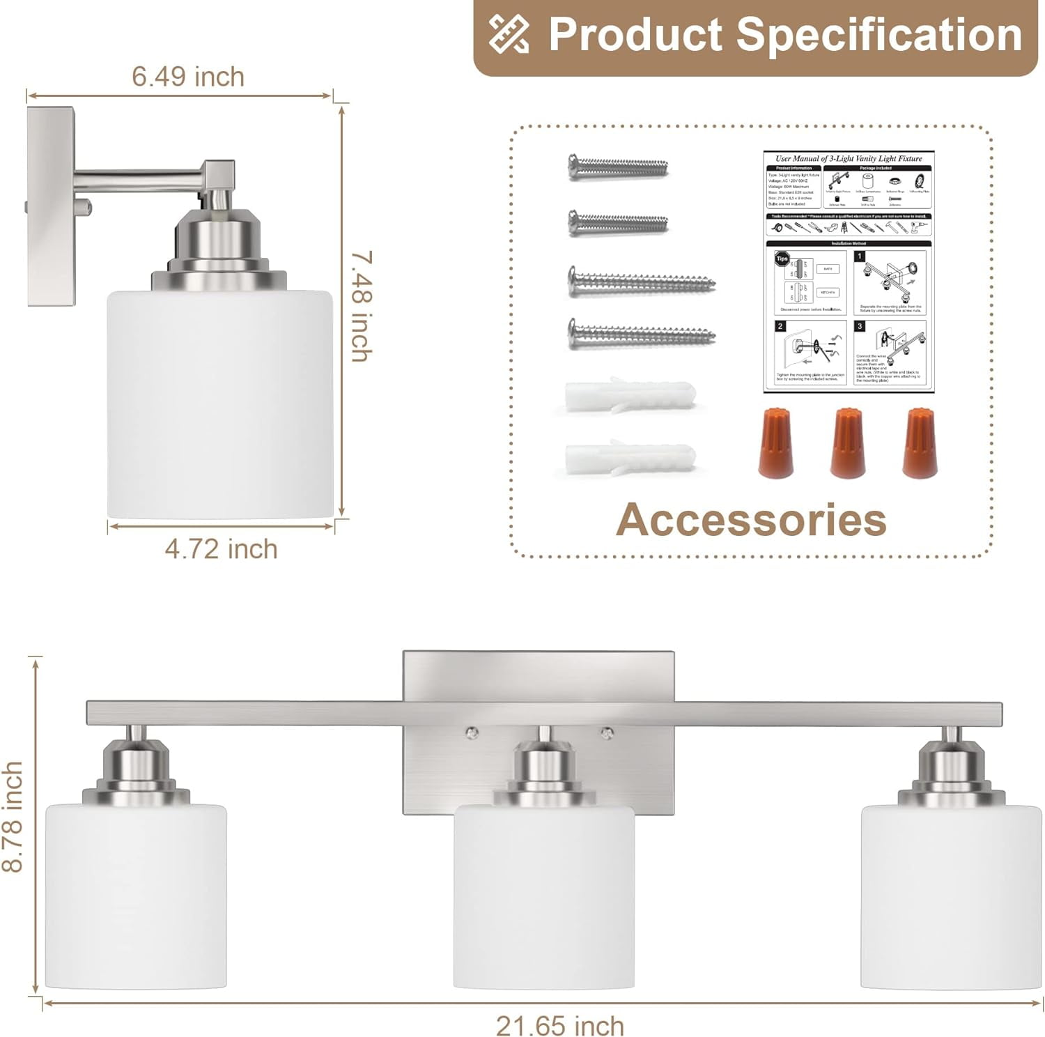 ✨【Anti-rust Brushed Nickel Bathroom Light Fixture】Sailstar vanity lights were finished in brushed nickel for outstanding rust resistance. Corrosion-proof materials will let the bathroom lights stay looking excellent year after year. The stylish and clean design is suitable for replacing old bathroom lights and gives your bathroom a nice small makeover. The bathroom vanity light with the integrity of the material is stronger enough to withstand high humidity, especially for bathroom lights over mirror. ????【Modern Bathroom Lights over Mirror】The brushed nickel vanity lights fixture and shades are made of solid material with 3 of thick glass shades, not plastic, and the white frosted shades help with brightness, providing you soft light instead of a harsh glare. The vanity lighting fixtures are lightweight but are not as delicate as you feared! The contemporary look bathroom light fixtures featured steel construction for long-lasting use and saved you the trouble of frequent replacement. ☀️【Vanity Lights for Small Bathroom】The bathroom light can be installed in two different ways. You can put the bathroom lights pointed up towards the ceiling or down towards the floor. They look great and will make your bathroom feel larger and brighter. The bathroom vanity light fixtures with size 21.65″L x 6.49″W x 8.78″H are perfect for the master bathroom. Best gift choice for your family and friends, and they will be pleased to see the finishing and bright light of these fixtures. ????【E26 Standard Sockets Bathroom Vanity Light】The 3 light bathroom light fixtures have E26 standard sockets, and you can use them in a max 60 watt or lower energy bulbs on 120V. Standard socket bulbs are straightforward to find in the market, so you don’t need to worry about that. These bathroom lights over mirror also work well with dimmers and are compatible with the smart bulbs, rgb bulbs, dimmable and not dimmable bulbs. Please note that the LED bulbs have not come with the package. ❤️【Easy to Install & 24 Months Replacement Promised】The bathroom light fixtures installation is very easy, it took less than 10mins to install if you are handy enough and familiar with basic electricity skills. Please note that the power supply needs to be cut off during installation to ensure personal safety. We remind you to wear gloves to avoid scratches when installing the wall lights. We also provide 2-year replacement promised, please let us know if you meet any quality issues.