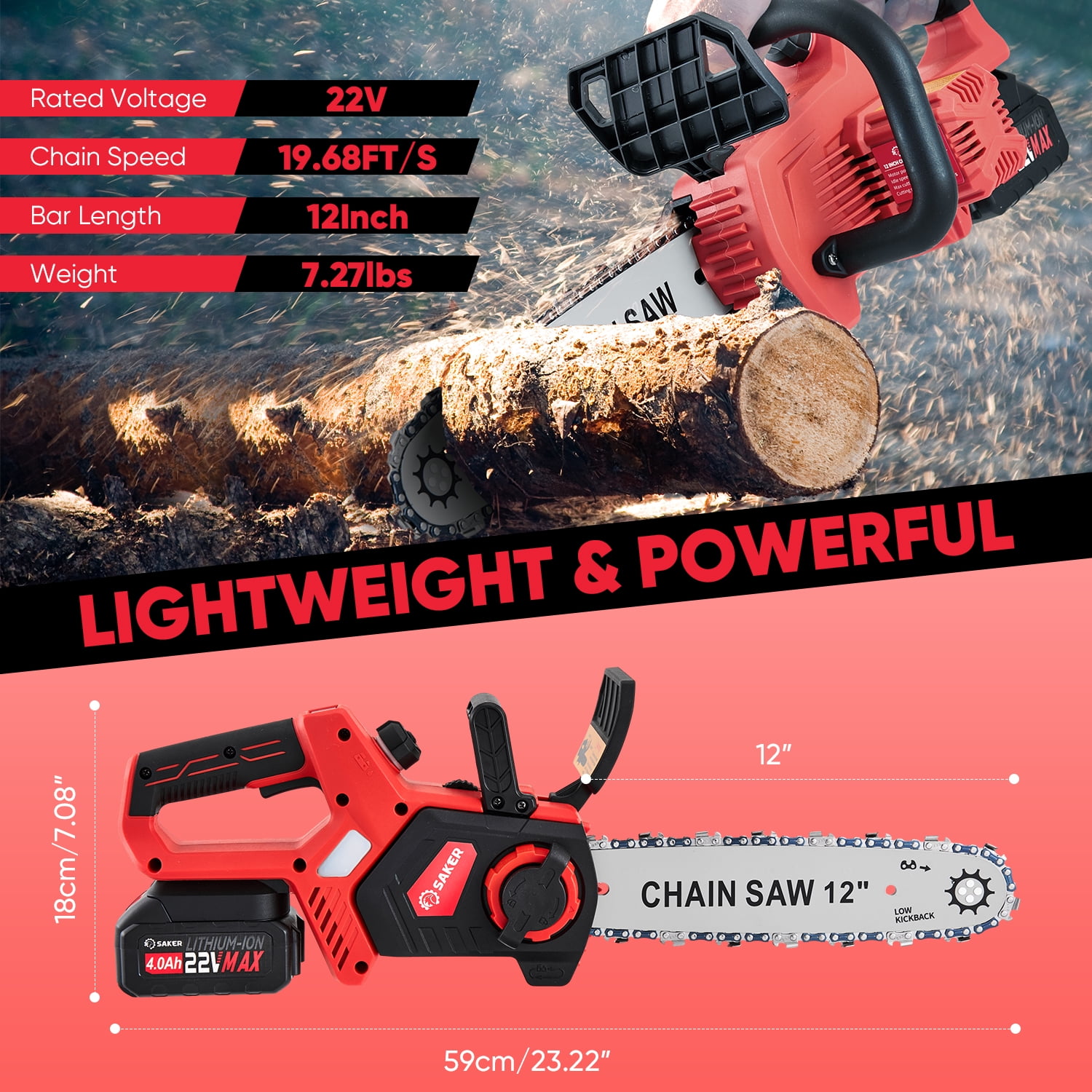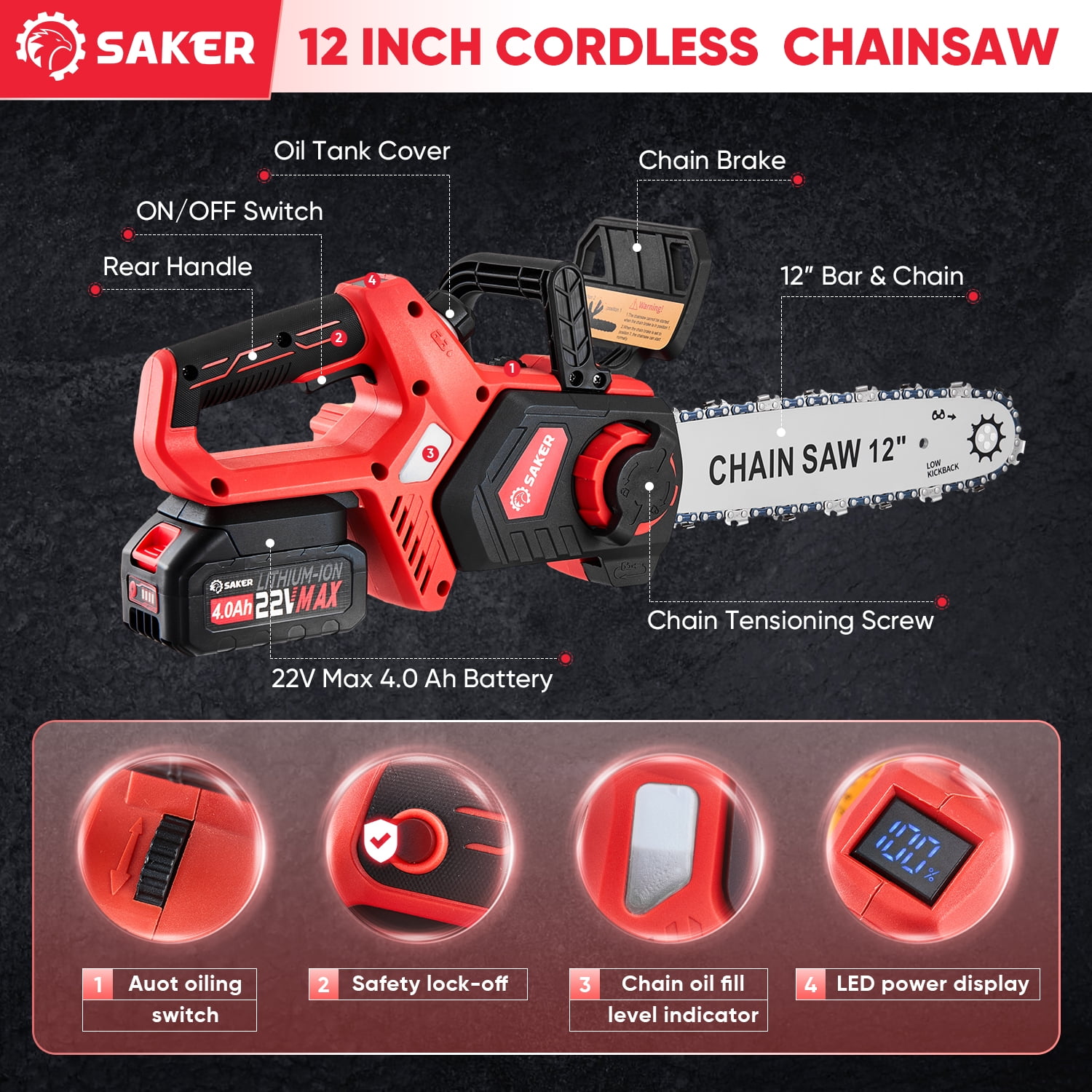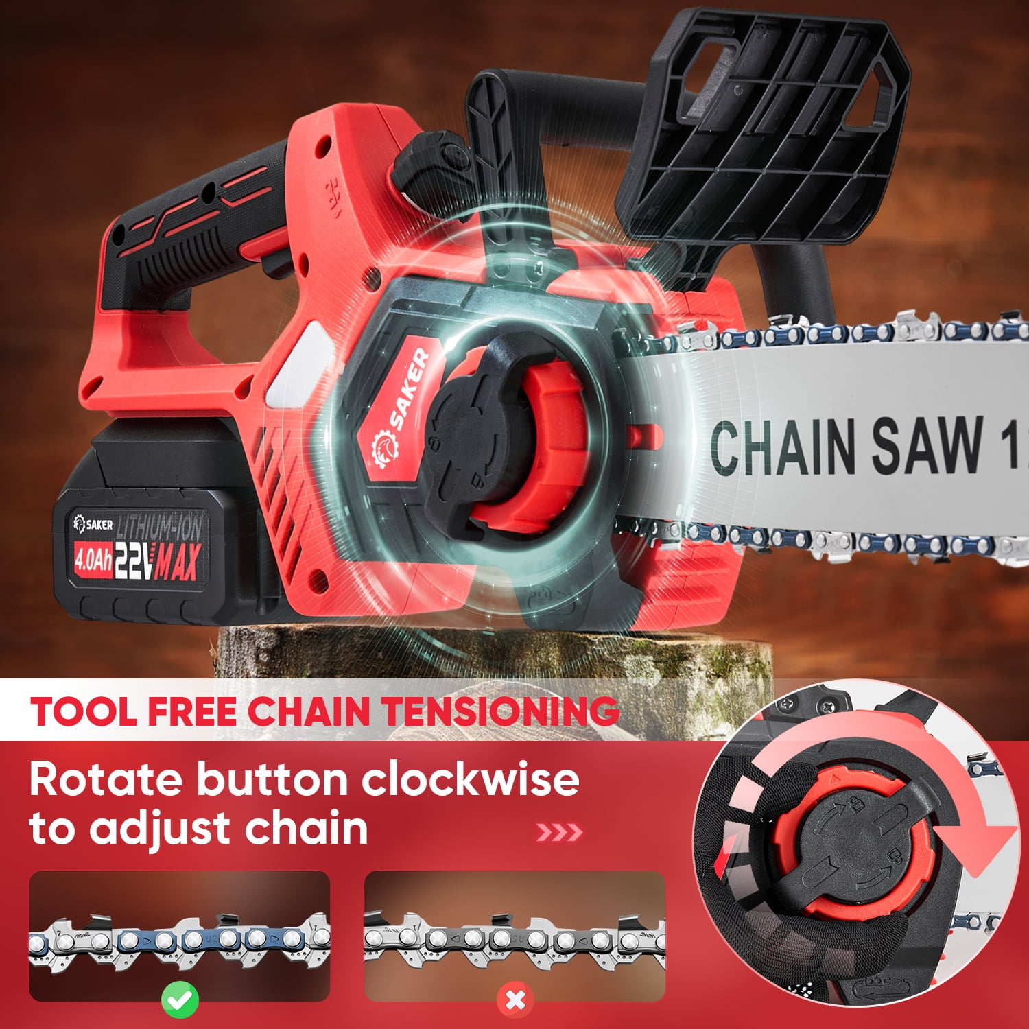 Saker 12″ 22V 4.0Ah Battery Powered Chainsaw, Auto-Tension, LED Power Display
