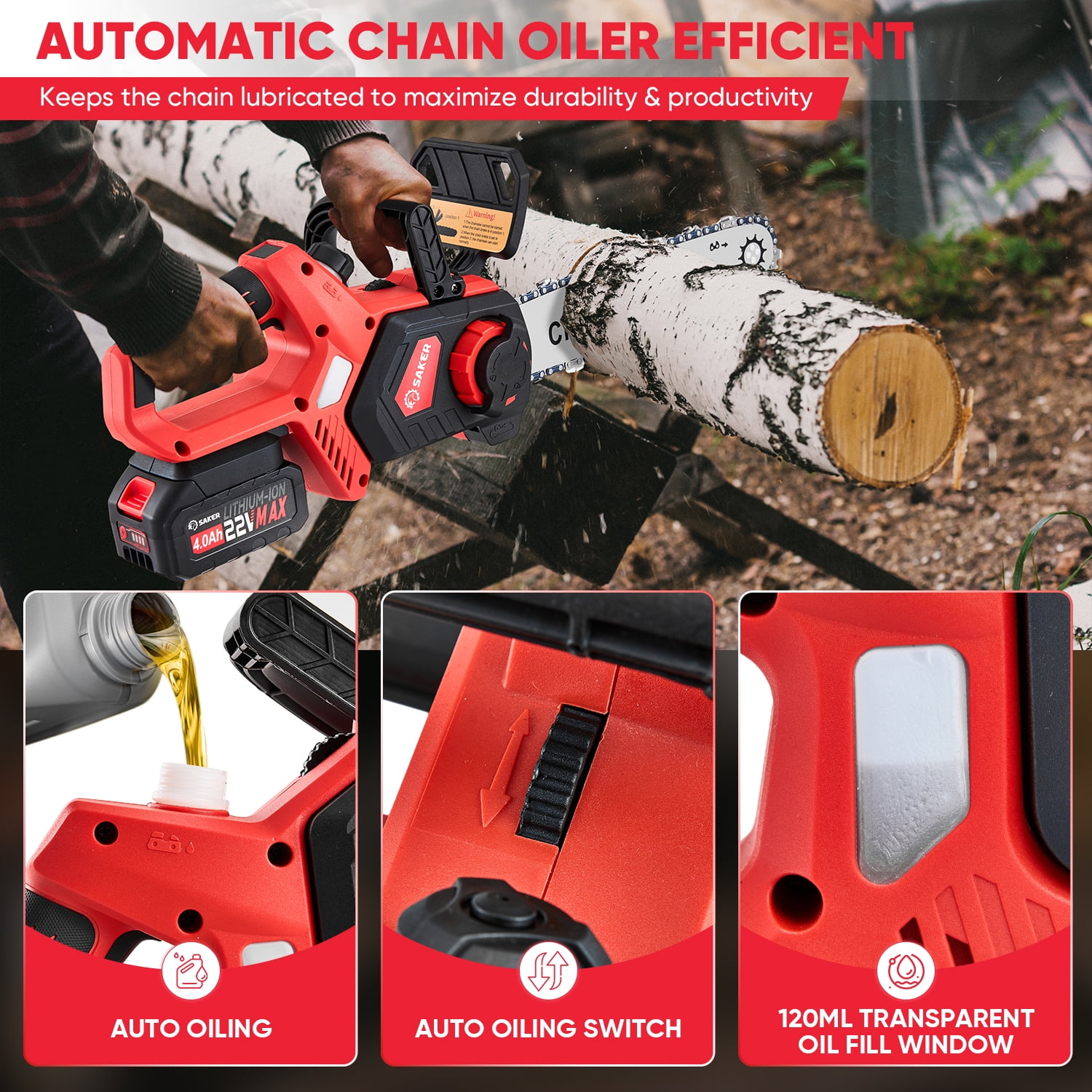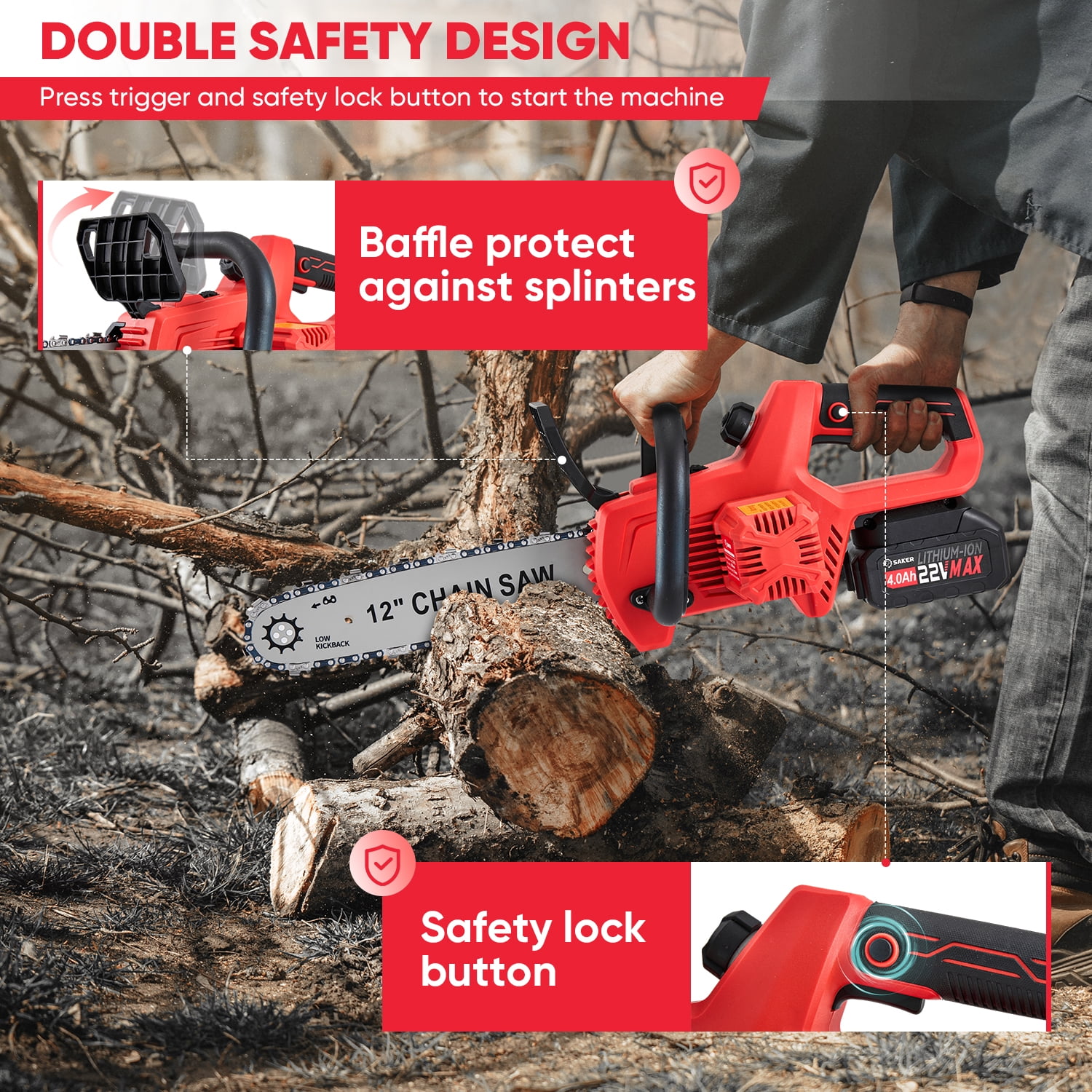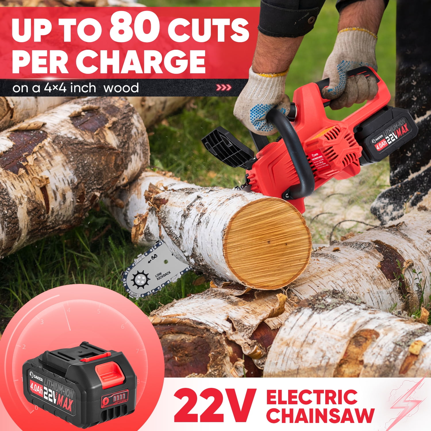 Saker 12″ 22V 4.0Ah Battery Powered Chainsaw, Auto-Tension, LED Power Display