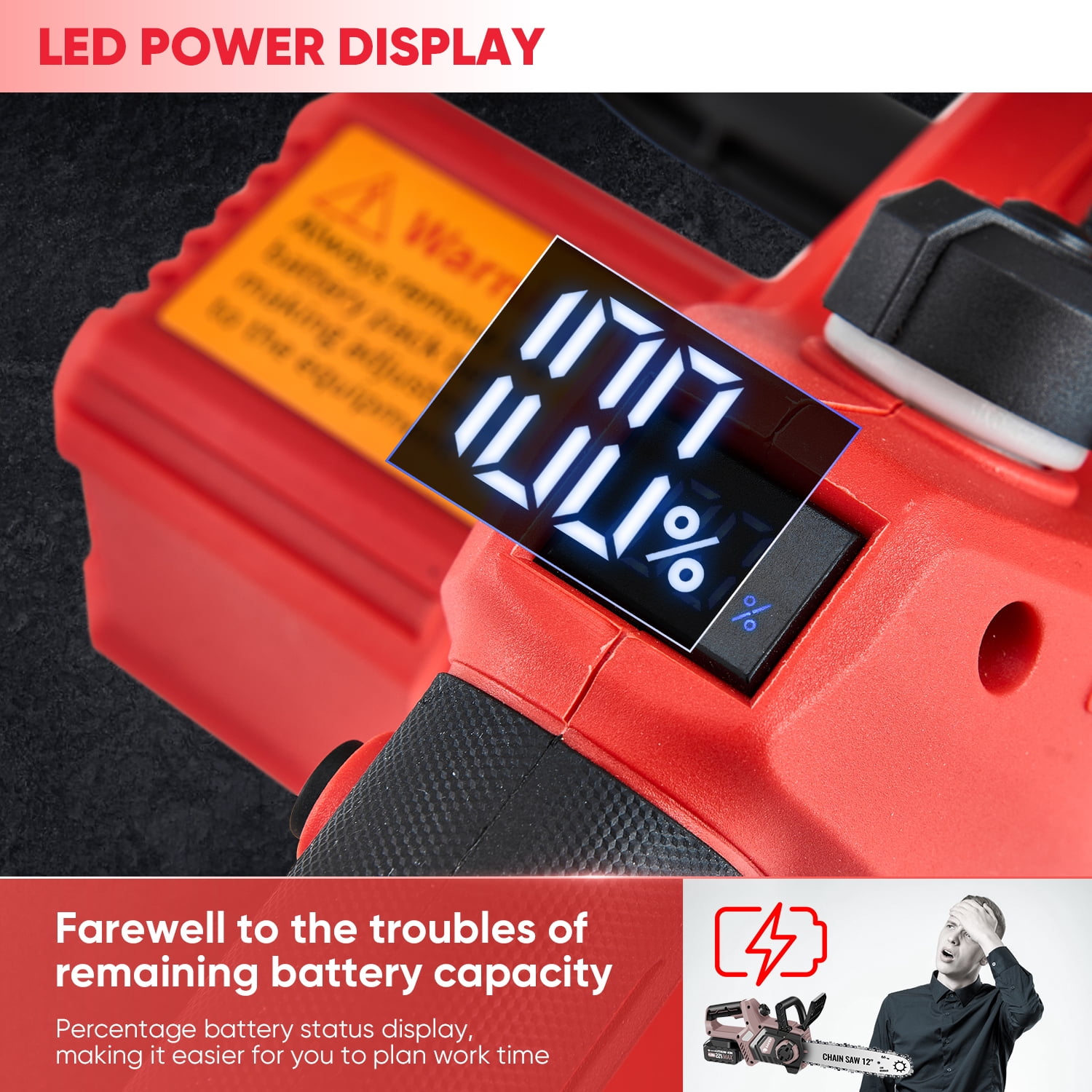 【Pretty Efficient cutting】- Powered by a robust 550W motor and operating at 3500 RPM, this chainsaw delivers exceptional performance with a cutting speed of 19.68 feet per second—twice as fast as the previous model. The high-power motor ensures smooth and efficient cutting, whether you’re trimming branches, cutting firewood, or tackling larger projects. This combination of power and speed saves you time and effort, making it the ultimate tool for demanding tasks. 【Tool-less Chain Tensioning】- Say goodbye to complicated adjustments! The tool-less chain tensioning feature allows you to easily tighten or replace the chain without the need for additional tools. This user-friendly design ensures that your chainsaw is always ready for action with minimal downtime. 【Automatic Oiler System】- Keep your chainsaw running smoothly with the automatic oiler system. It ensures consistent and precise lubrication of the chain, reducing friction and wear. This feature not only extends the life of your chainsaw but also enhances its performance during operation. 【LED Power Screen Display】- Stay in control with the built-in LED power screen display. It provides real-time information about the battery level, so you’ll always know how much power is left. No more guessing—just efficient and uninterrupted work. 【22V 4.0Ah Battery for Continuous Power】- Equipped with a robust 22V 4.0Ah battery, this chainsaw delivers consistent and reliable power for extended periods. Whether you’re tackling small jobs or larger projects, the battery ensures you have the energy to get the job done without frequent recharging. 【Ergonomic Design with Excellent Grip and Minimal Vibration】- Designed for comfort and ease of use, this chainsaw features an ergonomic grip that reduces fatigue during prolonged use. The minimal vibration design ensures better control and precision, making it ideal for both beginners and experienced users. 【Five Safety Measures】- Safety is a top priority with our chainsaw. It includes five key safety features: a safety lock to prevent accidental starts, baffles for added protection, goggles to shield your eyes, a slip-resistant handle for a secure grip, and a durable saw chain designed for safe and reliable cutting. These features make it a trustworthy tool for any user.