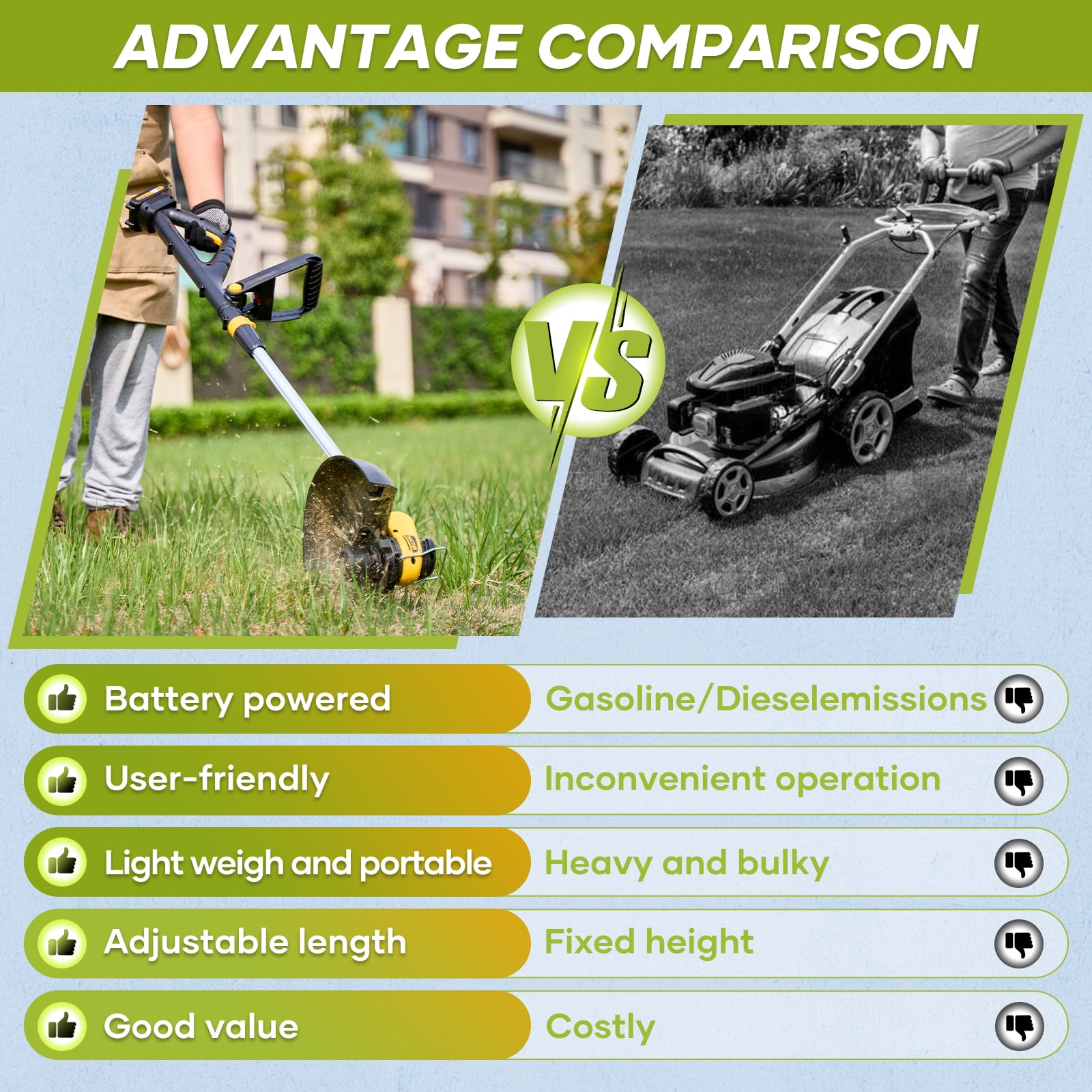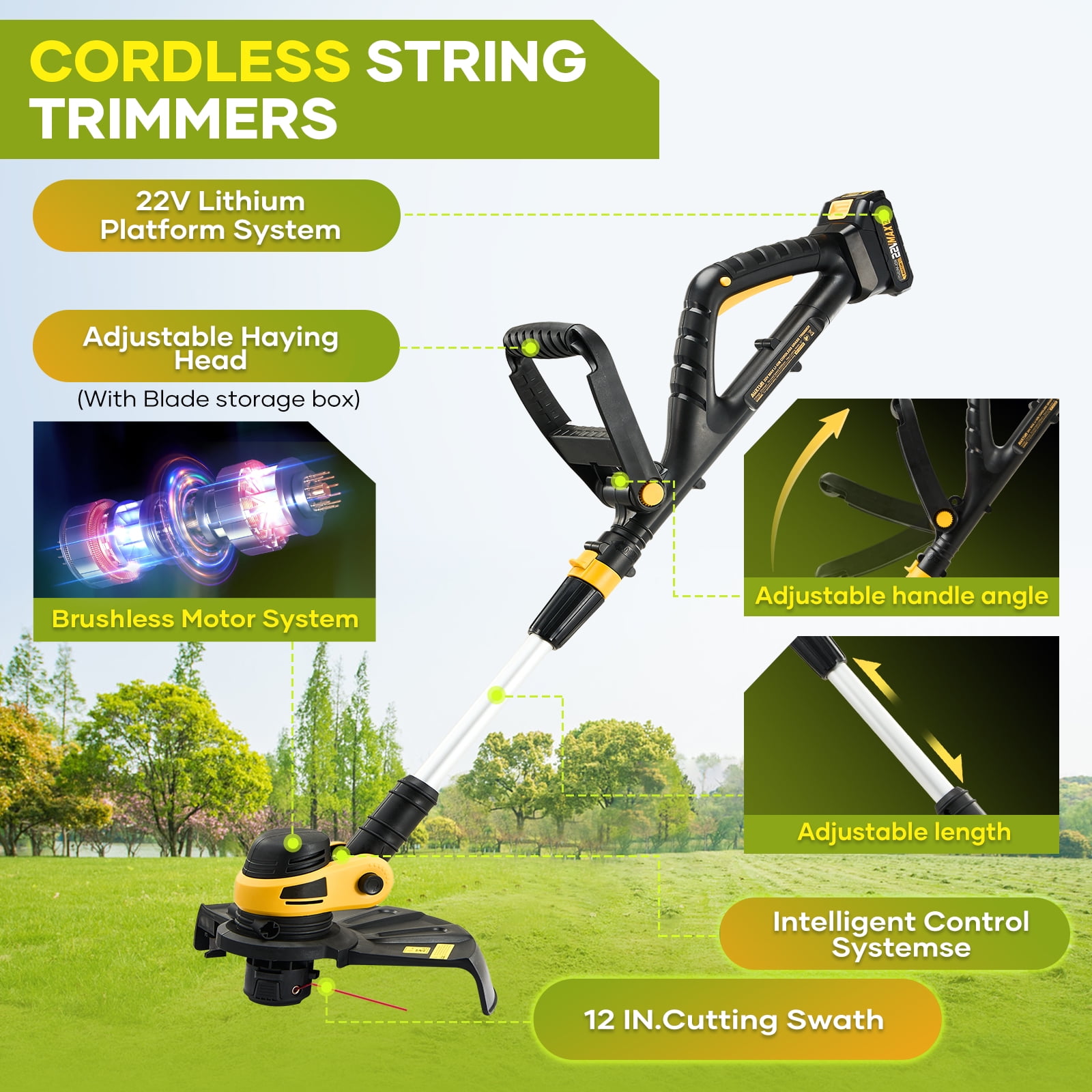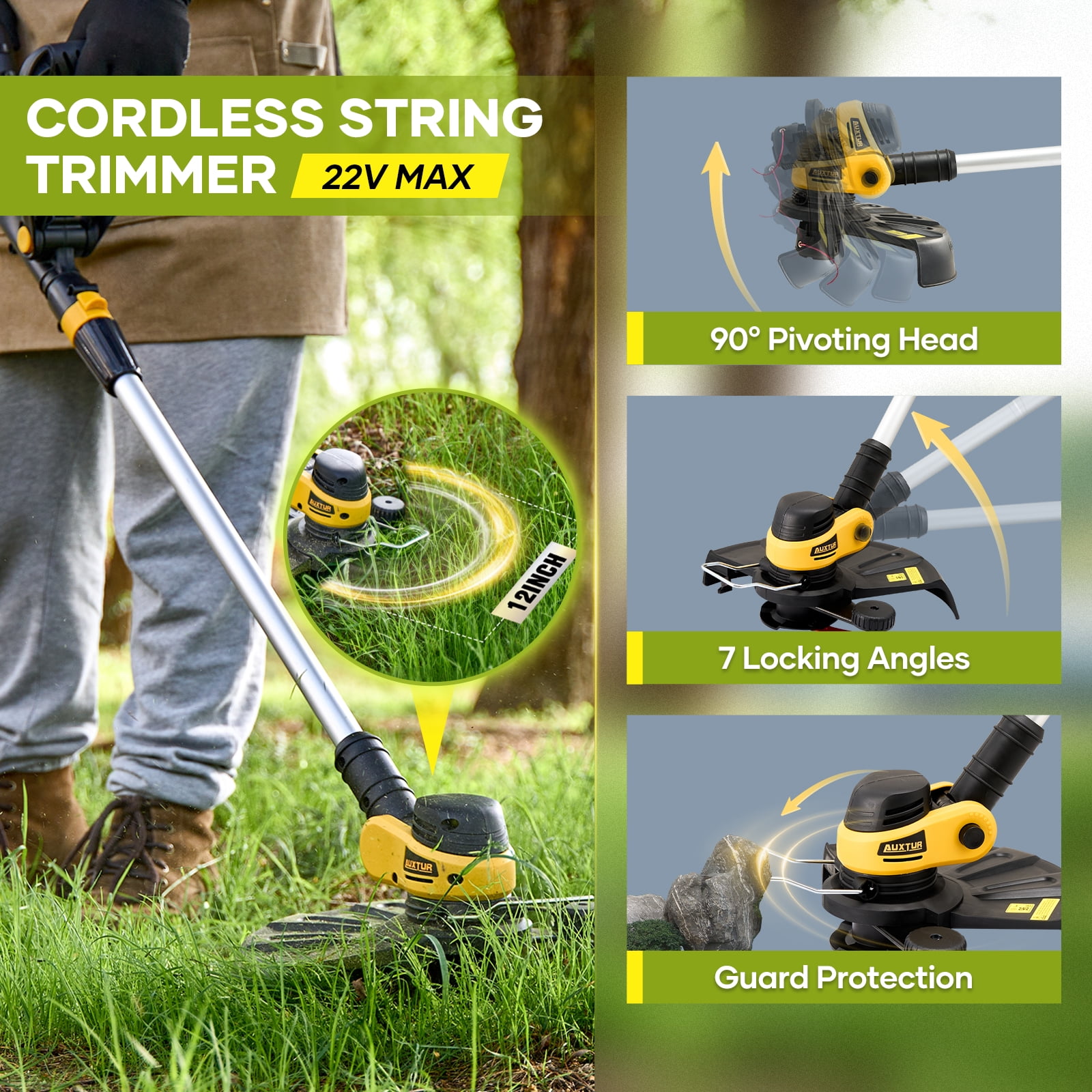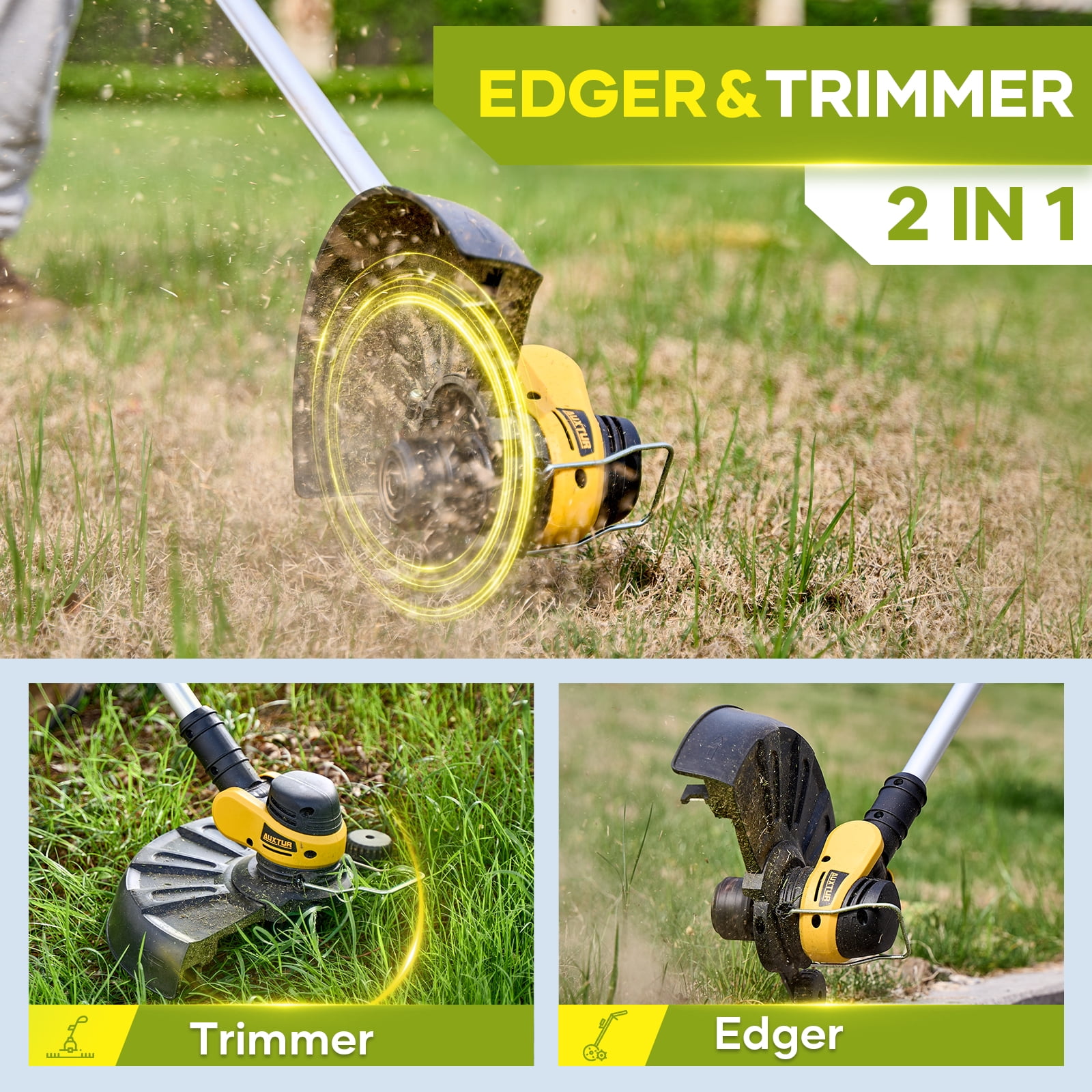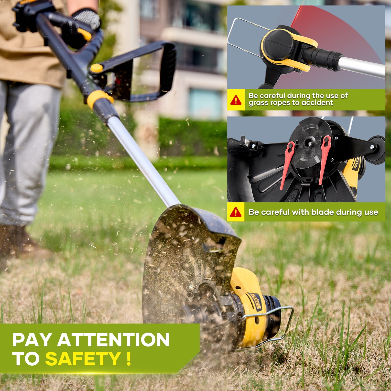 【Powerful Motor & High-Efficiency Battery Powered】- Our electric weed eater is powered by a 500W high-performance pure copper brushless motor, delivering a maximum speed of 8500 RPM for efficient cutting. Designed as a cordless tool, it features overload protection to ensure durability and safety during operation. Equipped with one 2000mAh powerful battery, it offers an impressive 60-minute runtime, so you never have to worry about running out of power while trimming grass or tackling yard work. This lightweight and reliable weed eater is perfect for hassle-free lawn maintenance. 【Two Types of Cutting Blades】- Cordless string trimmer with 2 different types of blades can help you complete various complex tasks. Grass ropes are suitable for soft grass; stainless steel blade is suitable for small shrubs. (To avoid damaging the blade, select the correct blade when trimming the grass) 【Adjustable Height & Cutting Head】- Electric weed wacker is equipped with a adjustable rod, which can be freely adjusted between 38inches/97cm and 48inches/124cm, so that people of different heights can easily trim the lawn. The electric weed wacker can be stored in the car trunk. The cordless weed wacker head angle is adjustable from 0-90°, allowing you to easily care for every corner and cranny. There are no cluttered cables and wires in the string trimmer, you can use it anywhere. 【Lightweight & Safe & Low Noise】- Battery grass trimmer only 3.5pounds, lightweight and easy to use. even the elderly or women can easily control use it. Equipped with double safety start switch and splash protection cover to prevent personal injury caused by accidental start and splash. Low noise design does not disturb neighbors’ sleep. Ergonomic soft handle improves comfort and control. Ideal for trimming around yards and bushes. 【Worry-Free After-Sales Service】- If any faults or problems are found in the received package missing parts, product defects, batteries, instructions, installation etc, please contact us directly, and we will solve your problem 100%. We will follow up on every order, If you are not satisfied with any of our electric string trimmer, Free returns and exchanges can be made through ’s Return Window within 90 days.